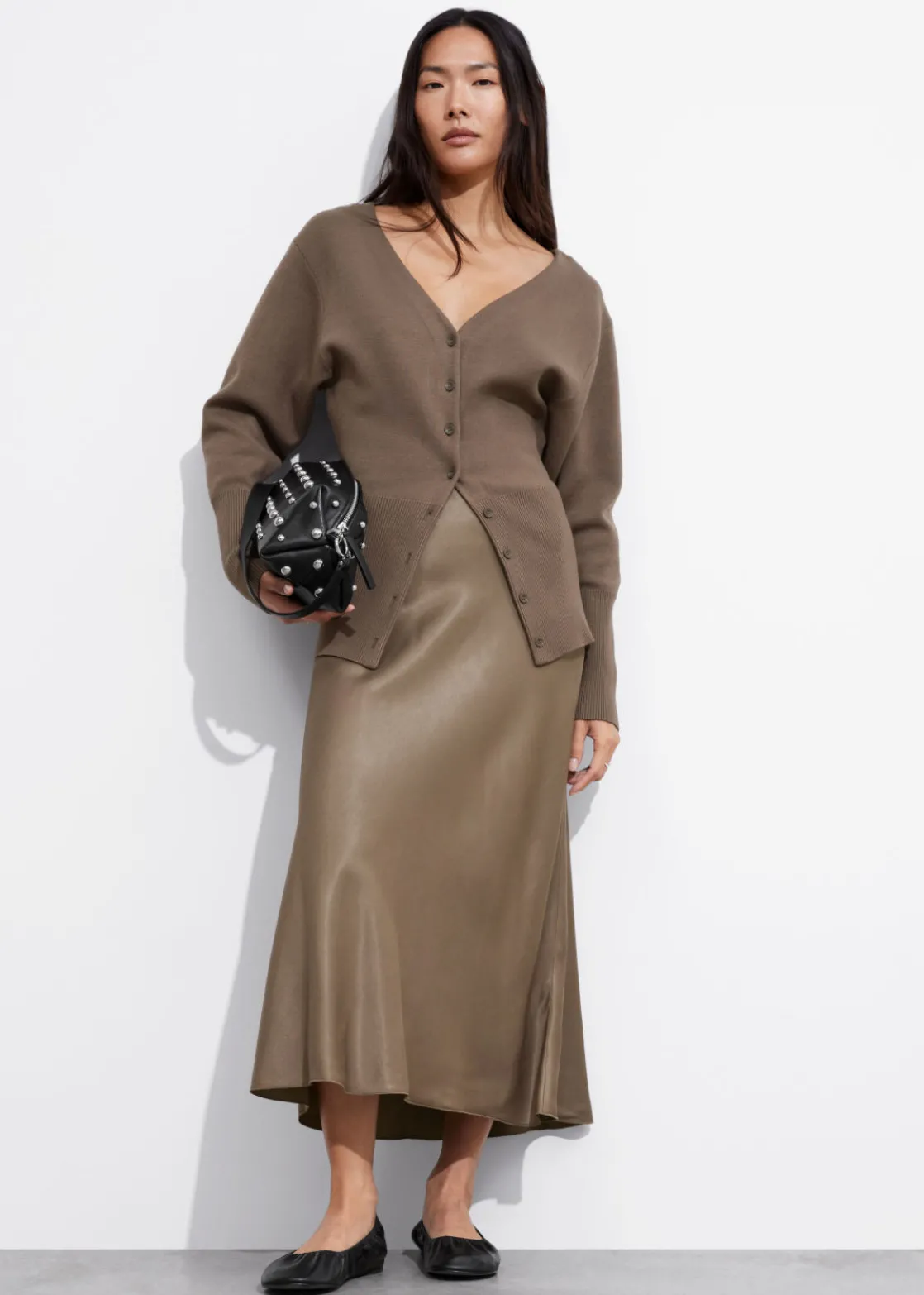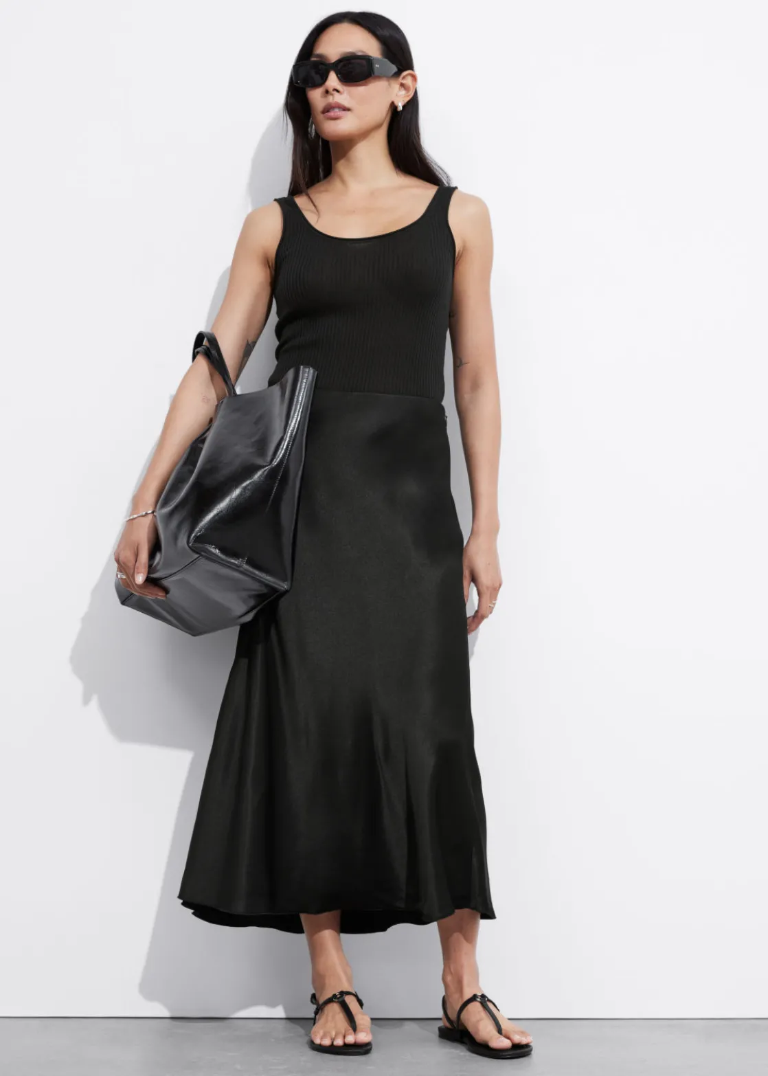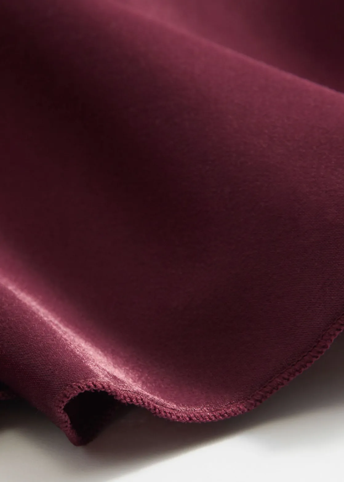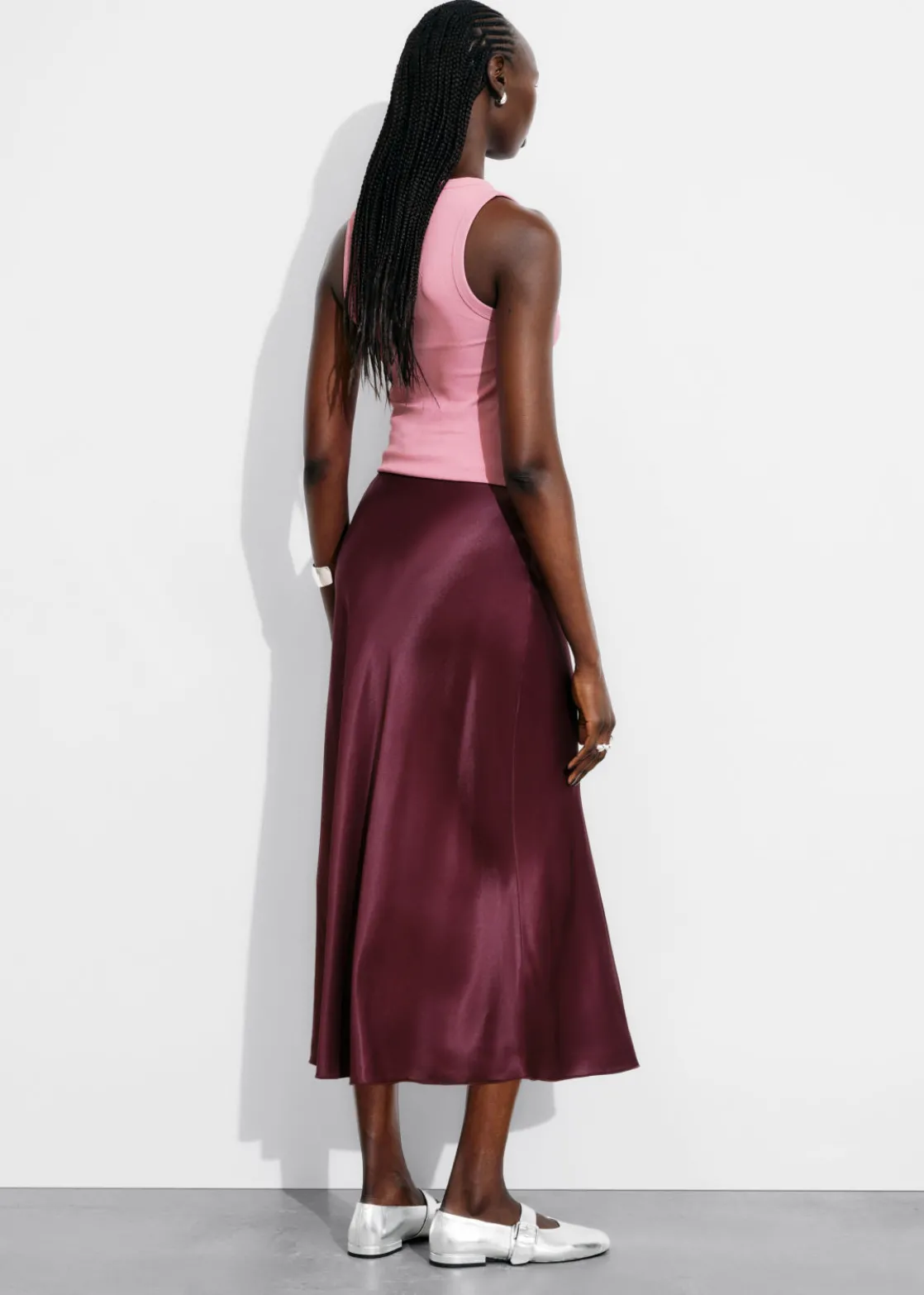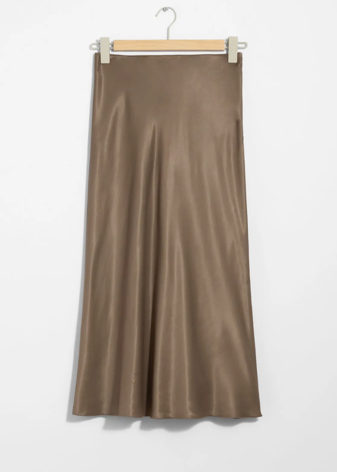 High-waist midi skirt with a glossy satin finish. Secured with a zipper at the side.