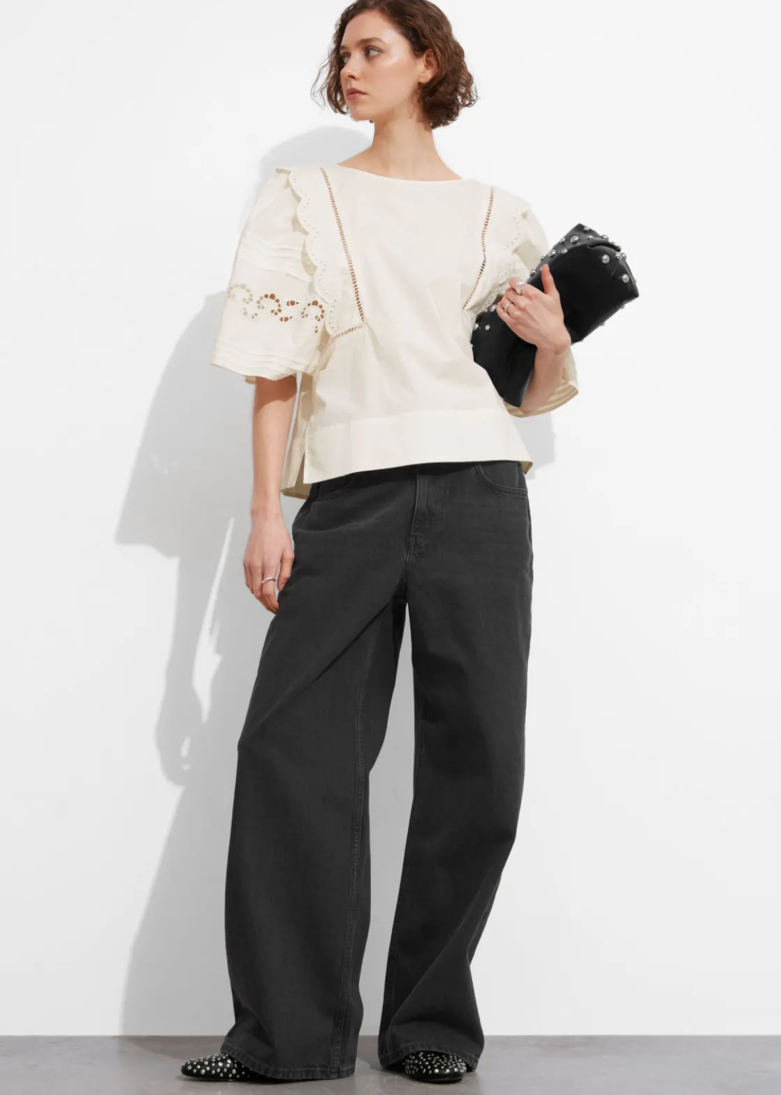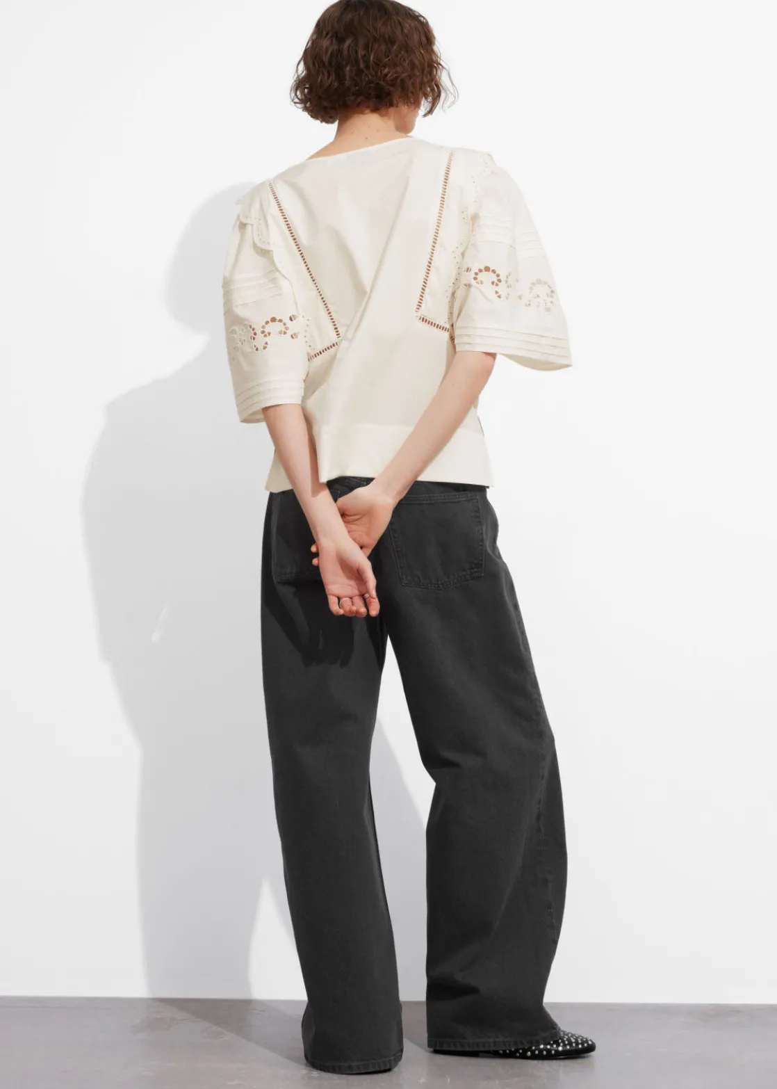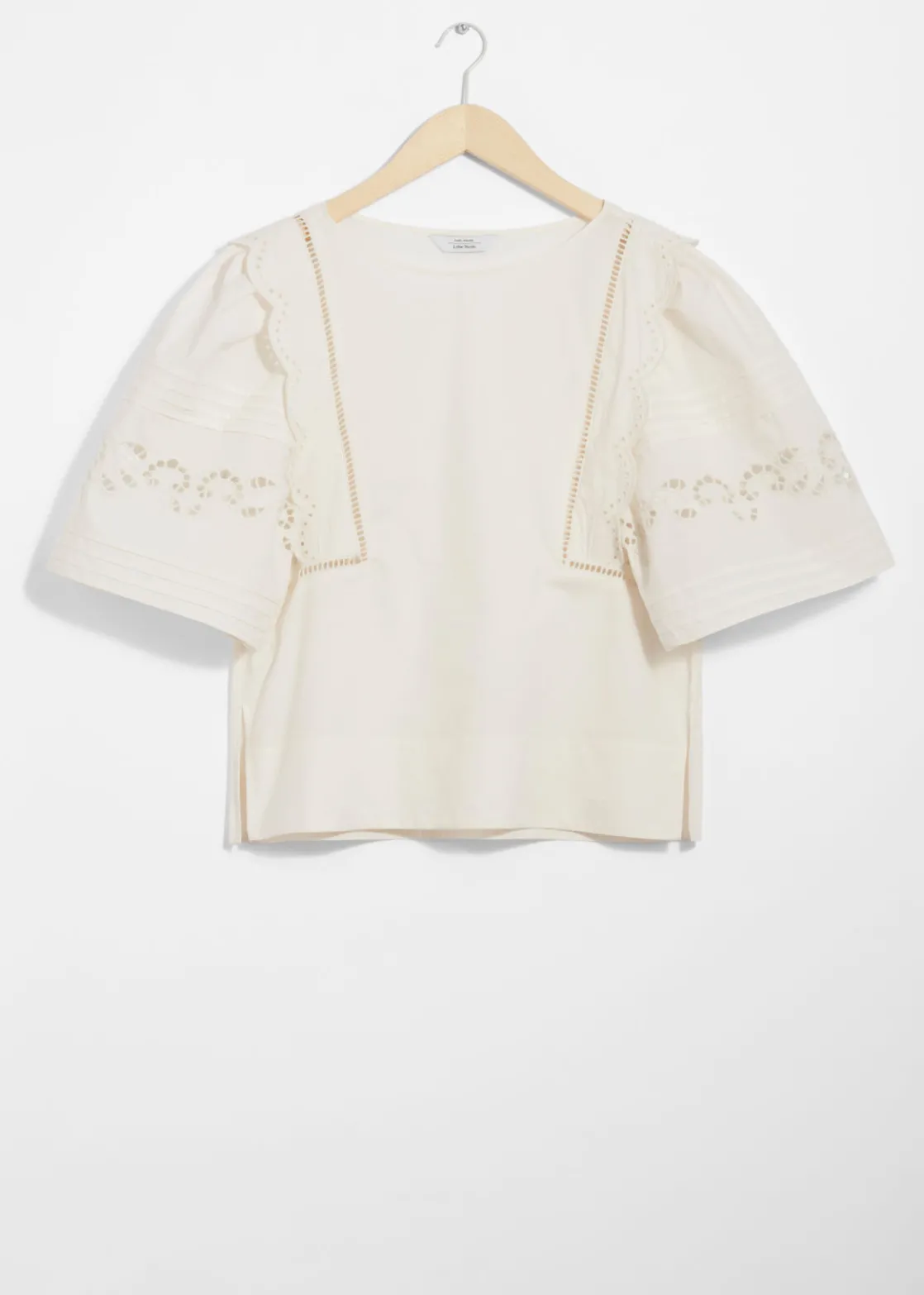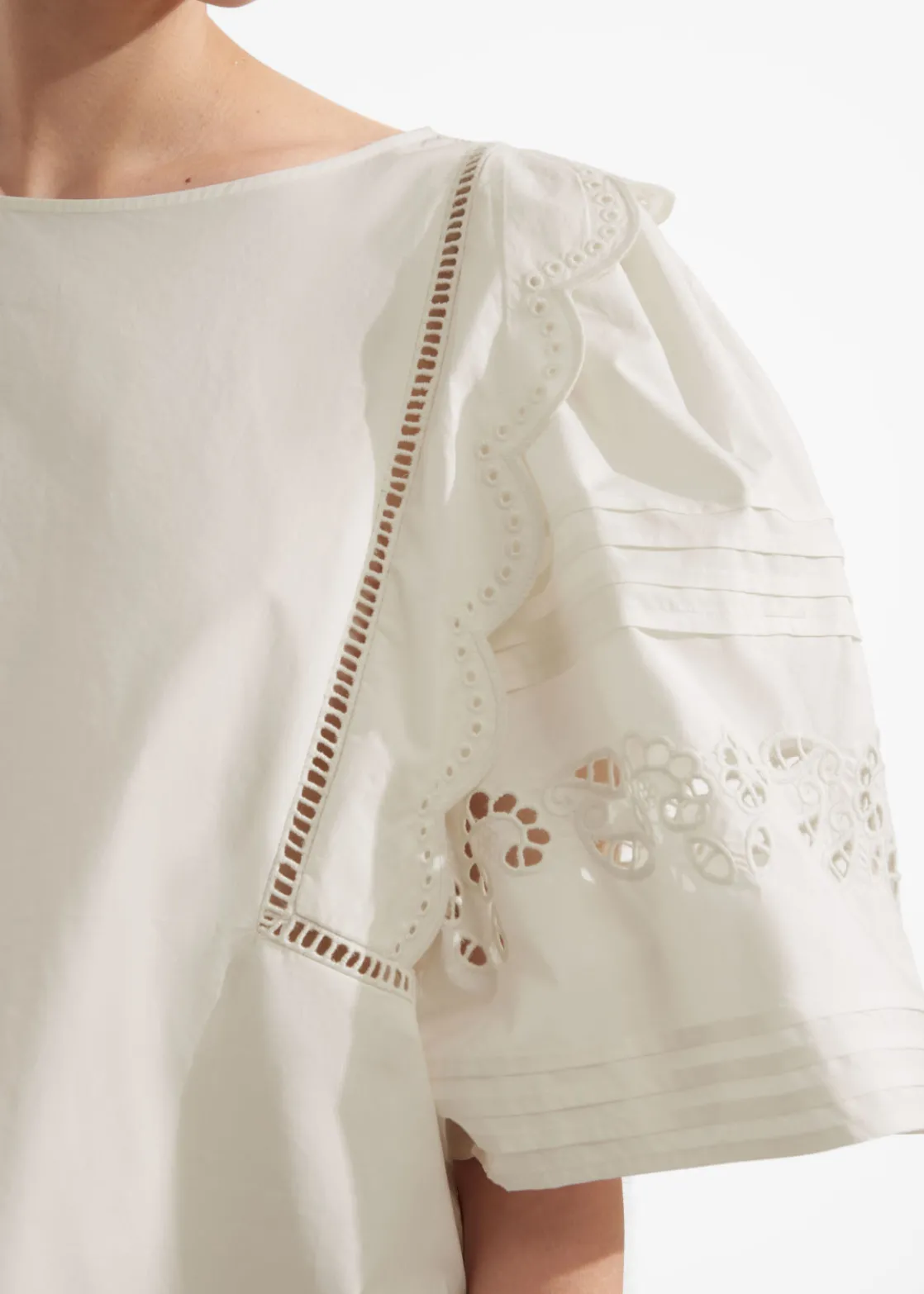 Blouse featuring three-quarter sleeves, embroidered open-work detailing and scalloped trims along the shoulders.