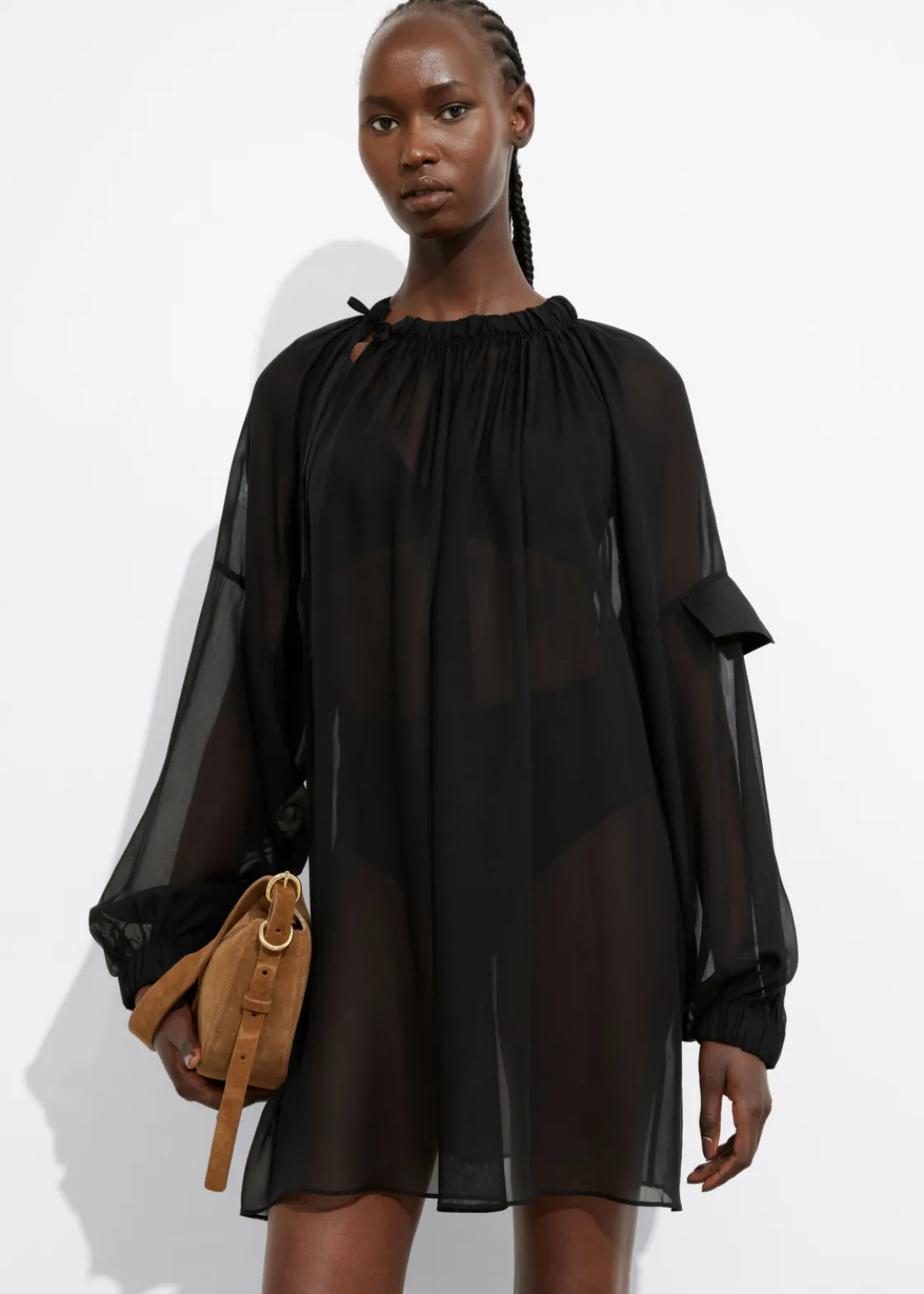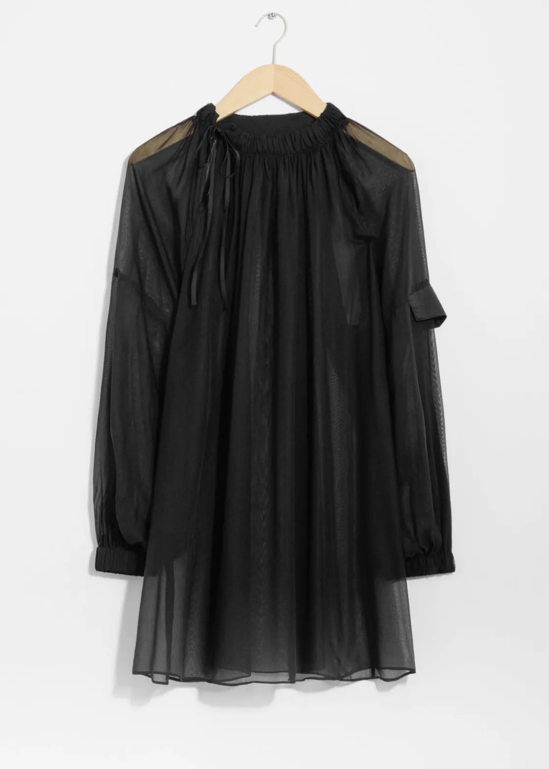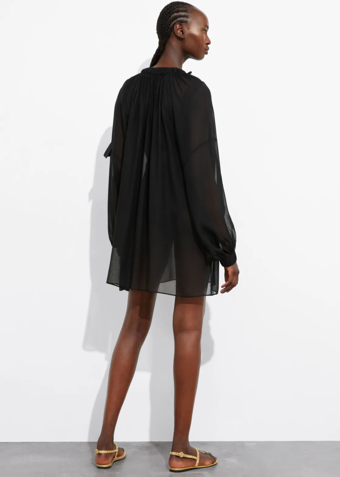 Long-sleeve mini dress featuring a sheer finish. Designed with a pocket at the sleeve and a tie-detailed slit at the neckline.