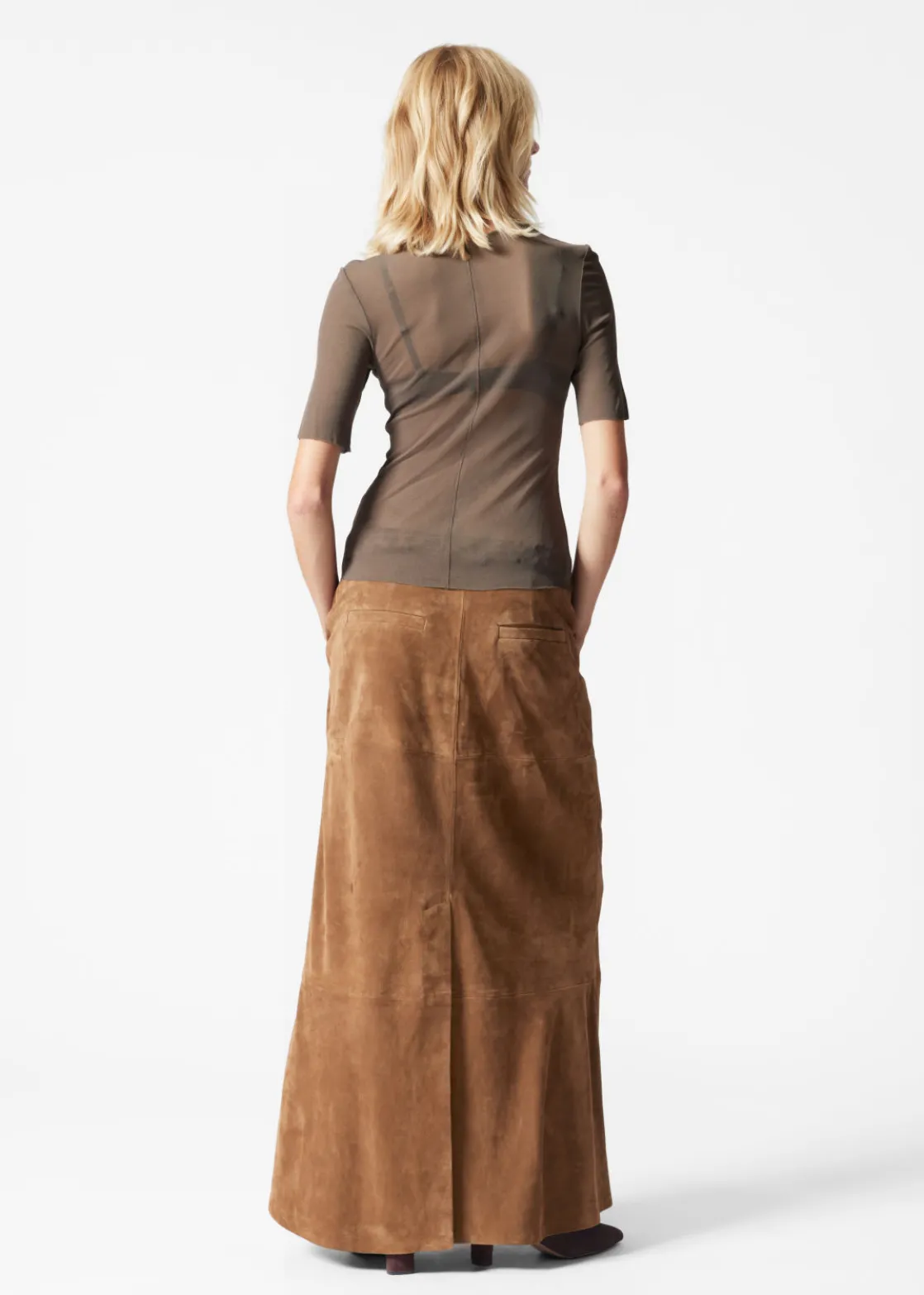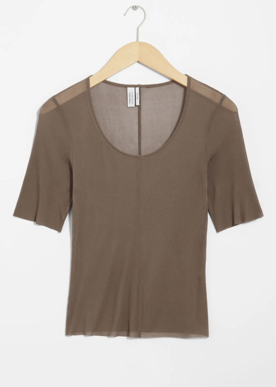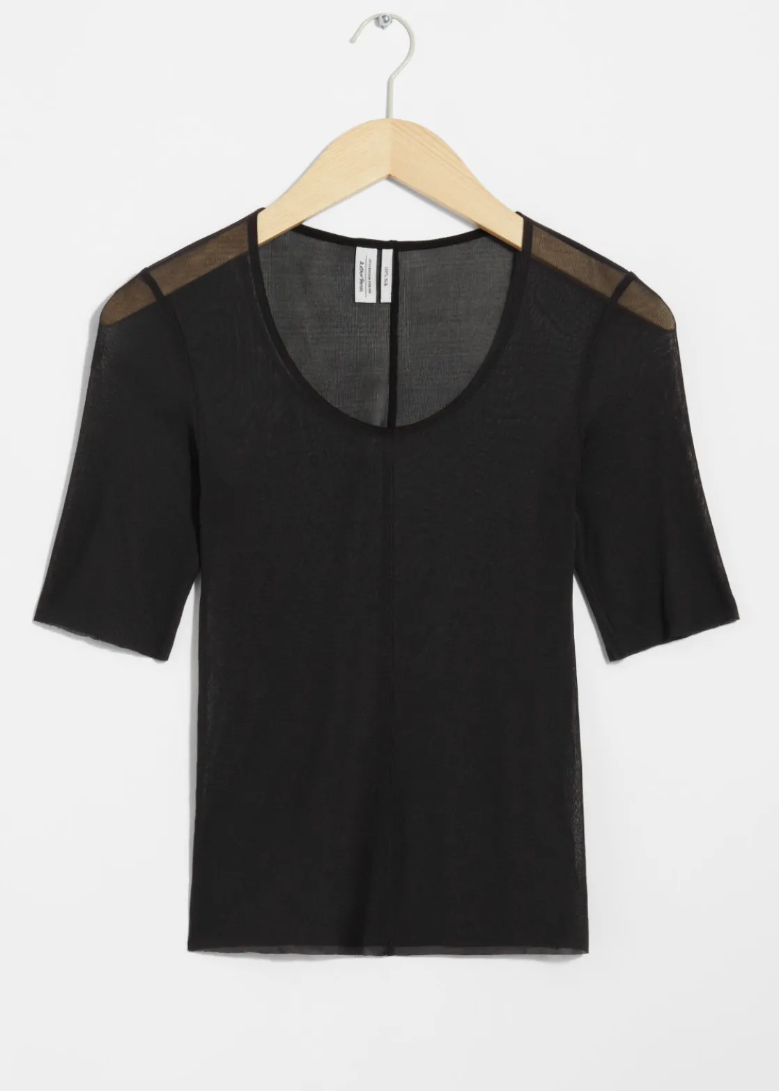 Sheer short-sleeve top cut from mulberry silk. Finished with an exposed vertical centre-front seam.