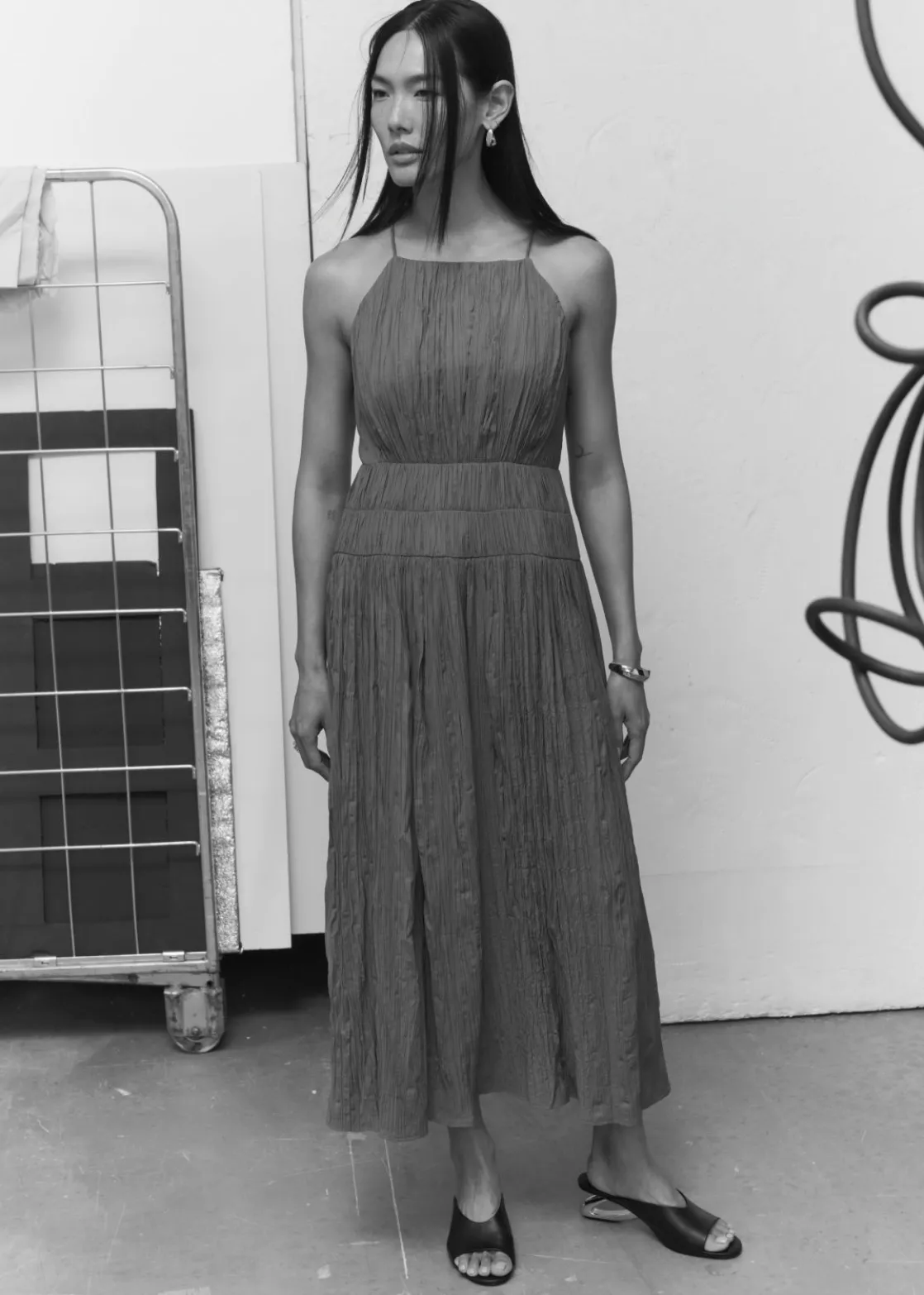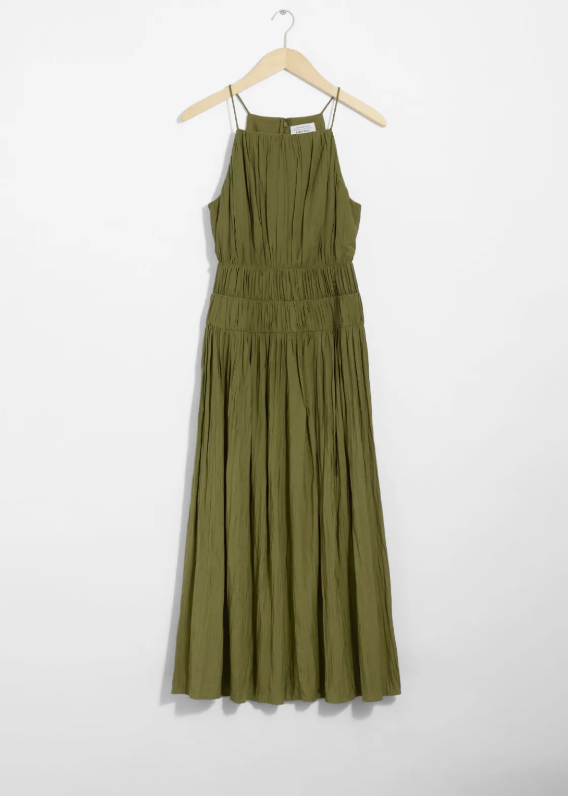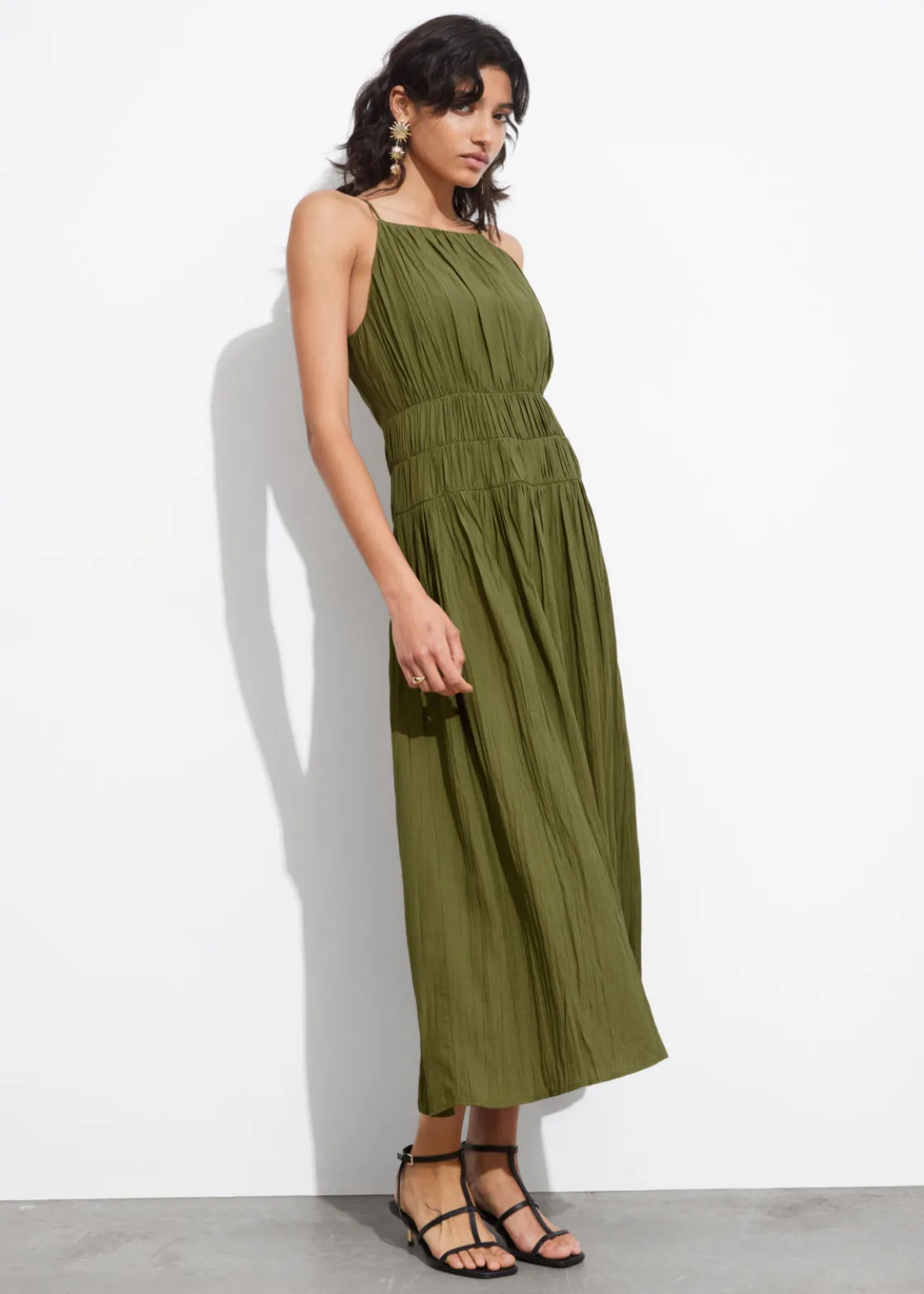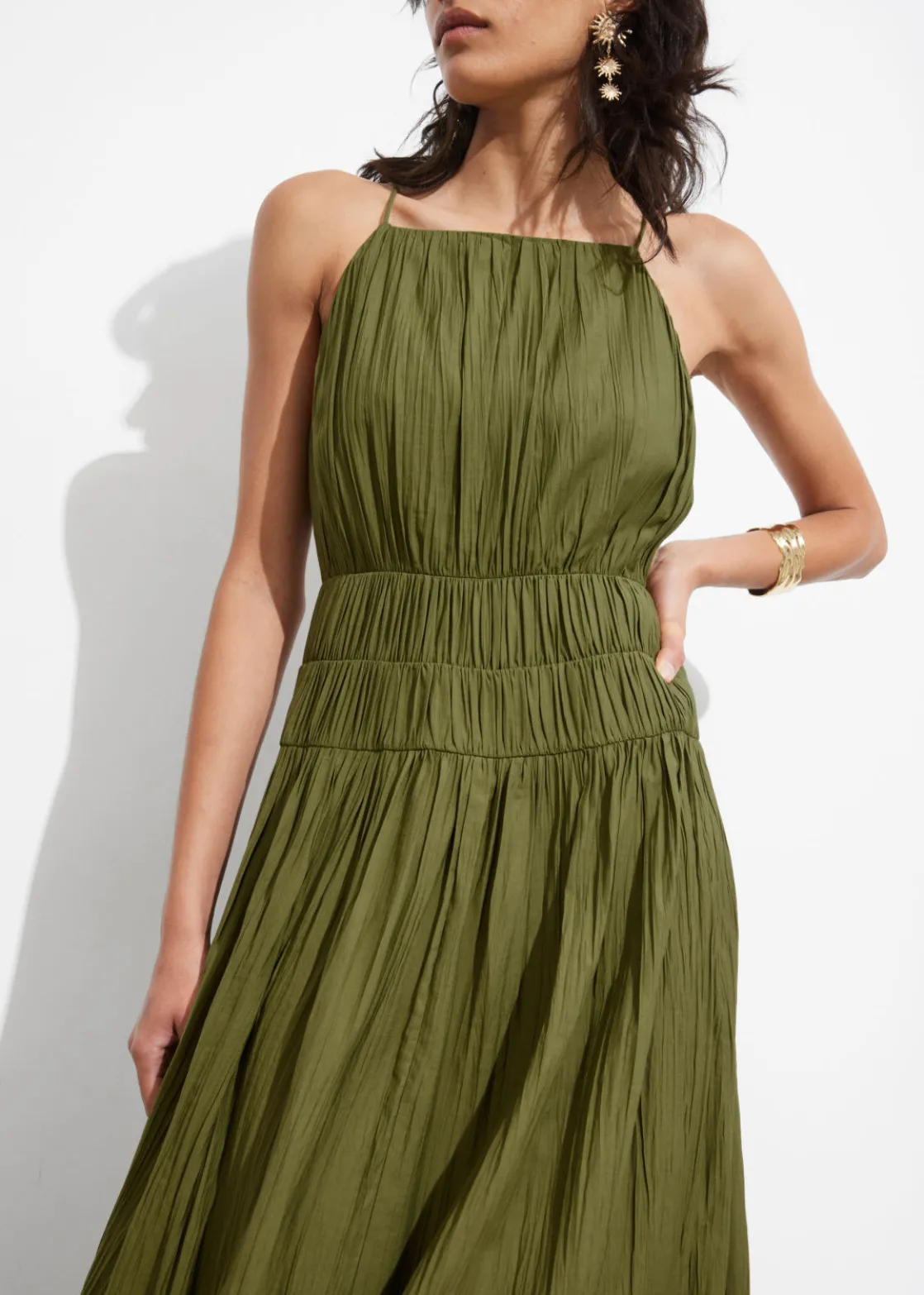 Sleeveless A-line midi dress featuring a shirred finish and duo side seam pockets.