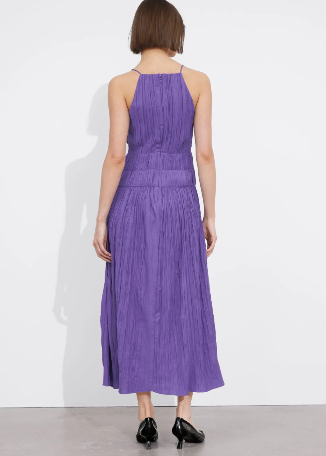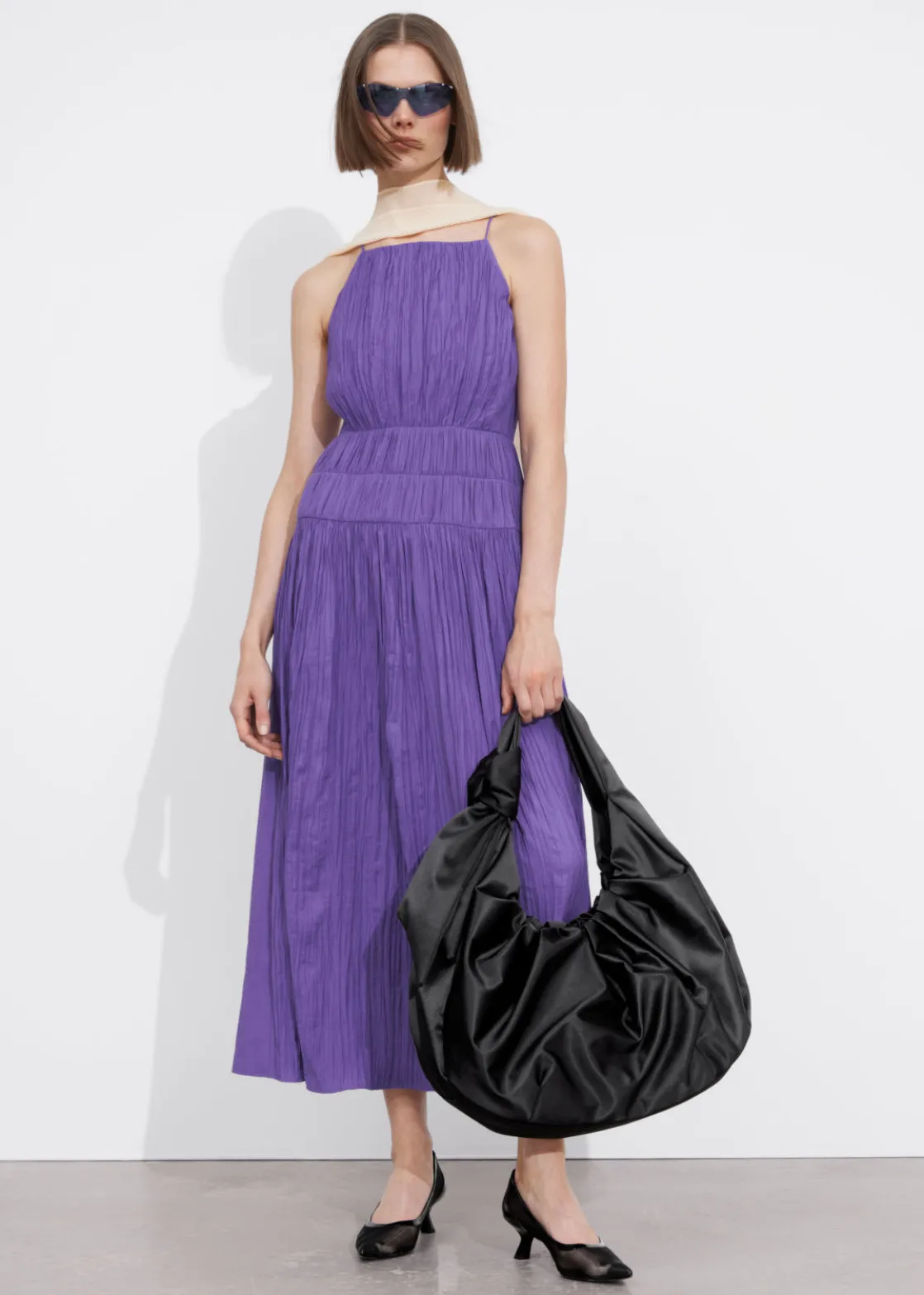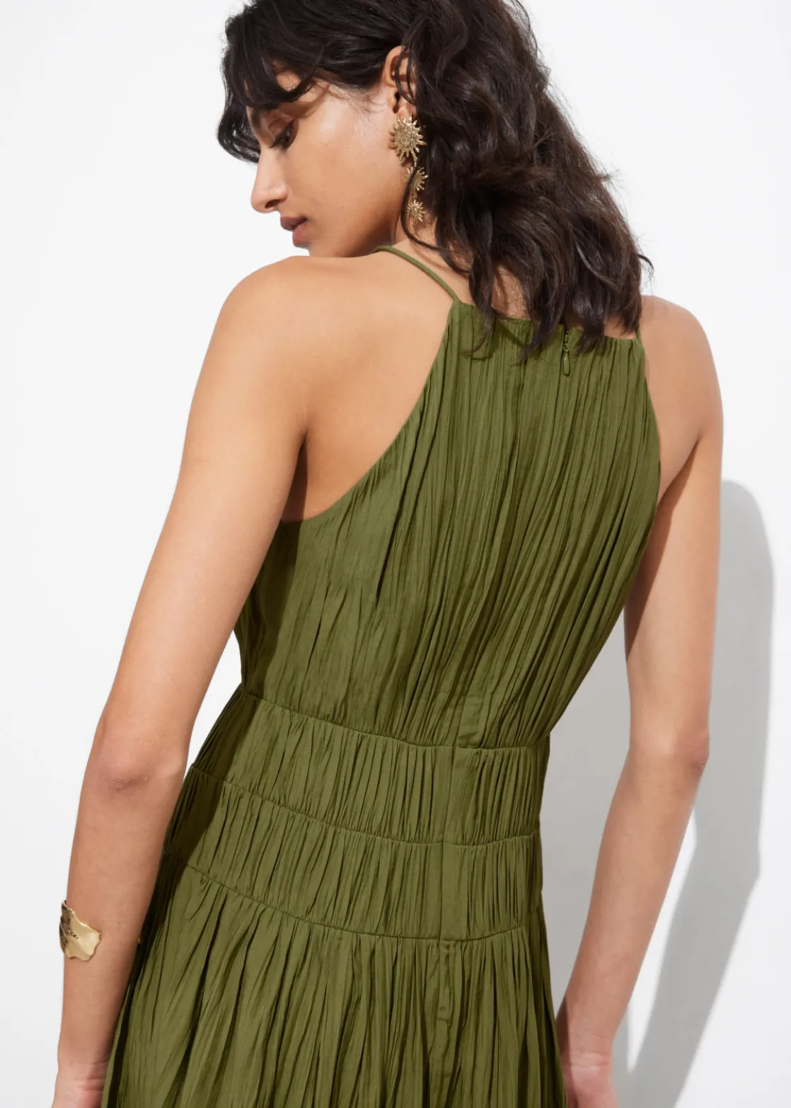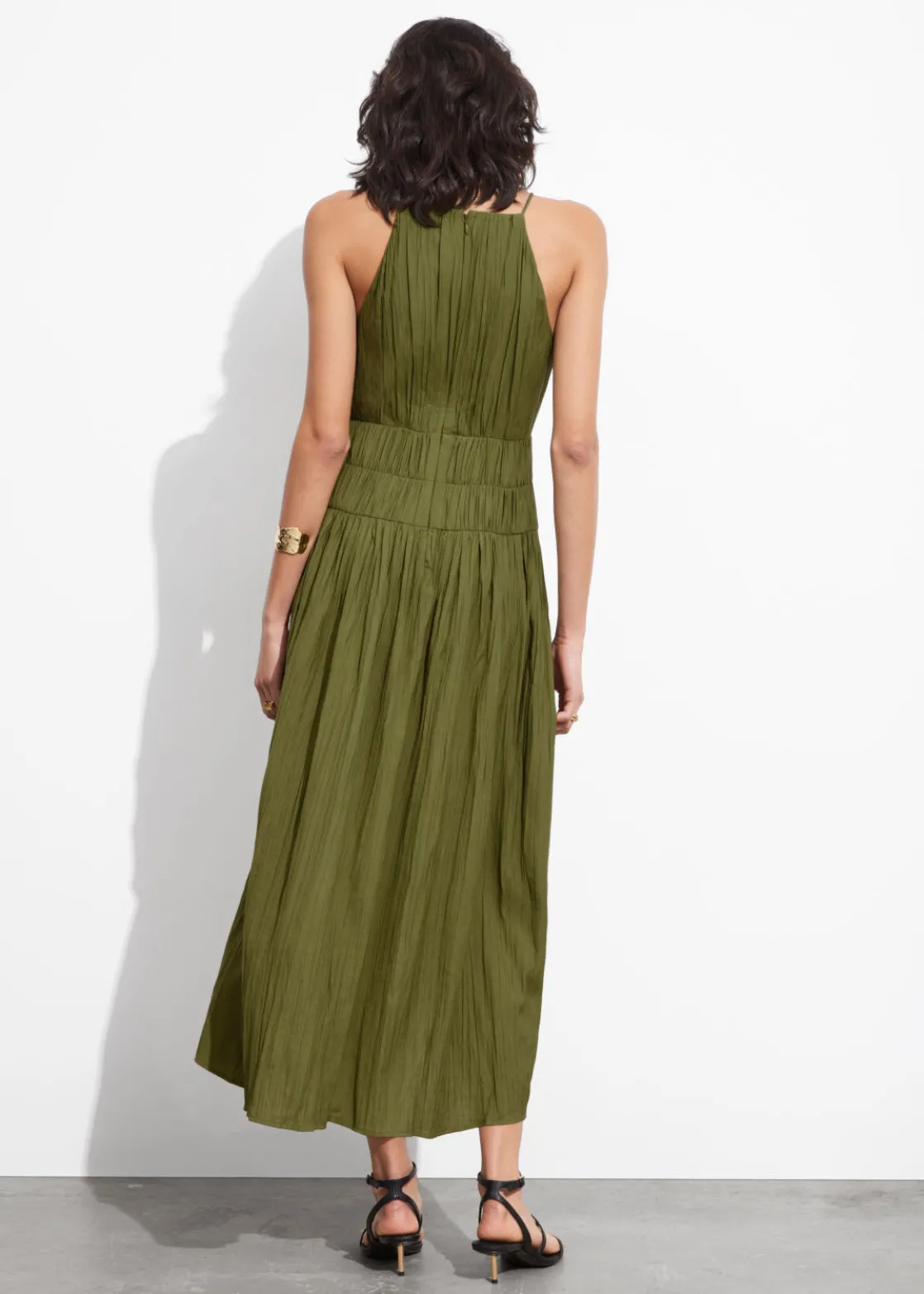 Sleeveless A-line midi dress featuring a shirred finish and duo side seam pockets.