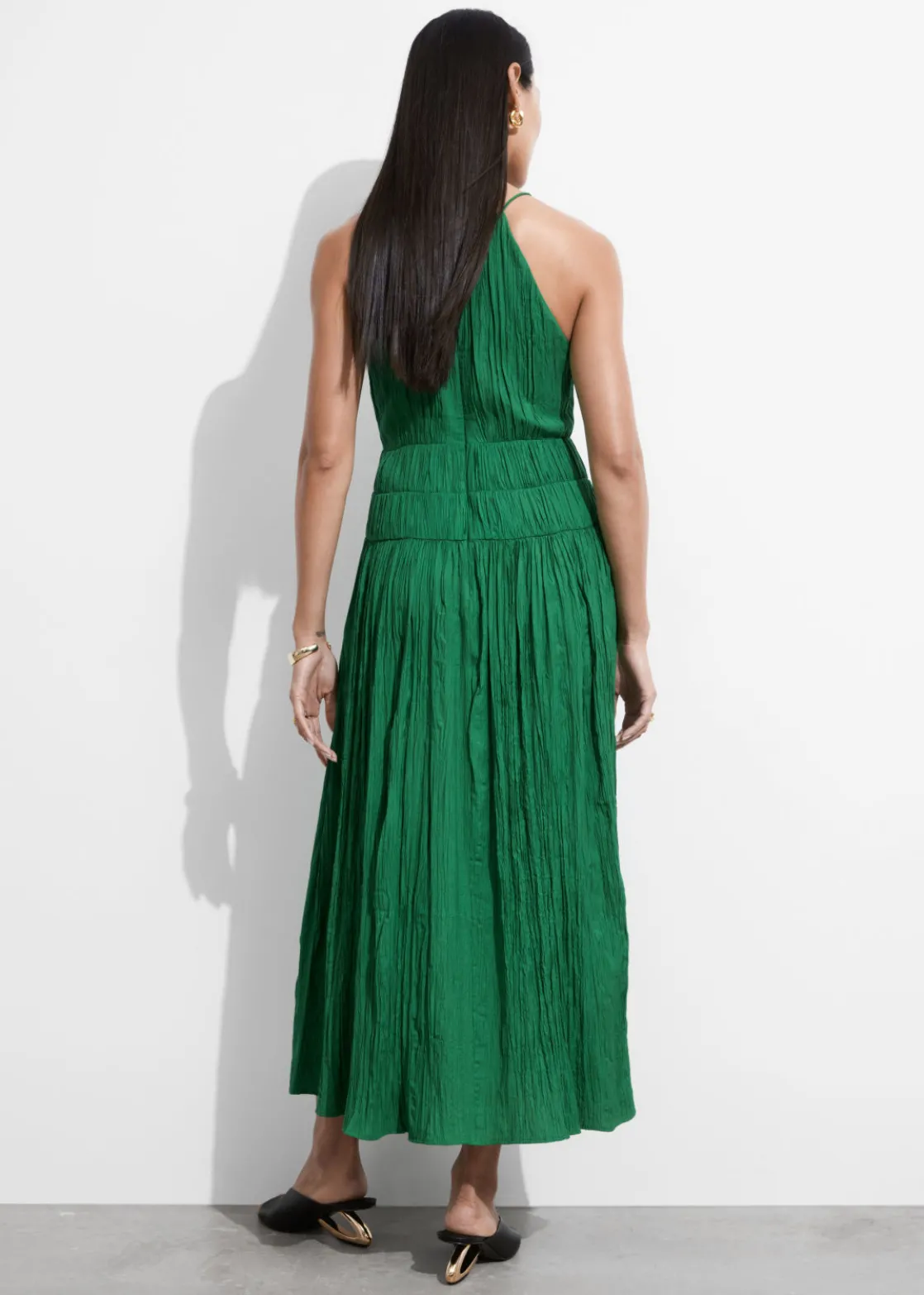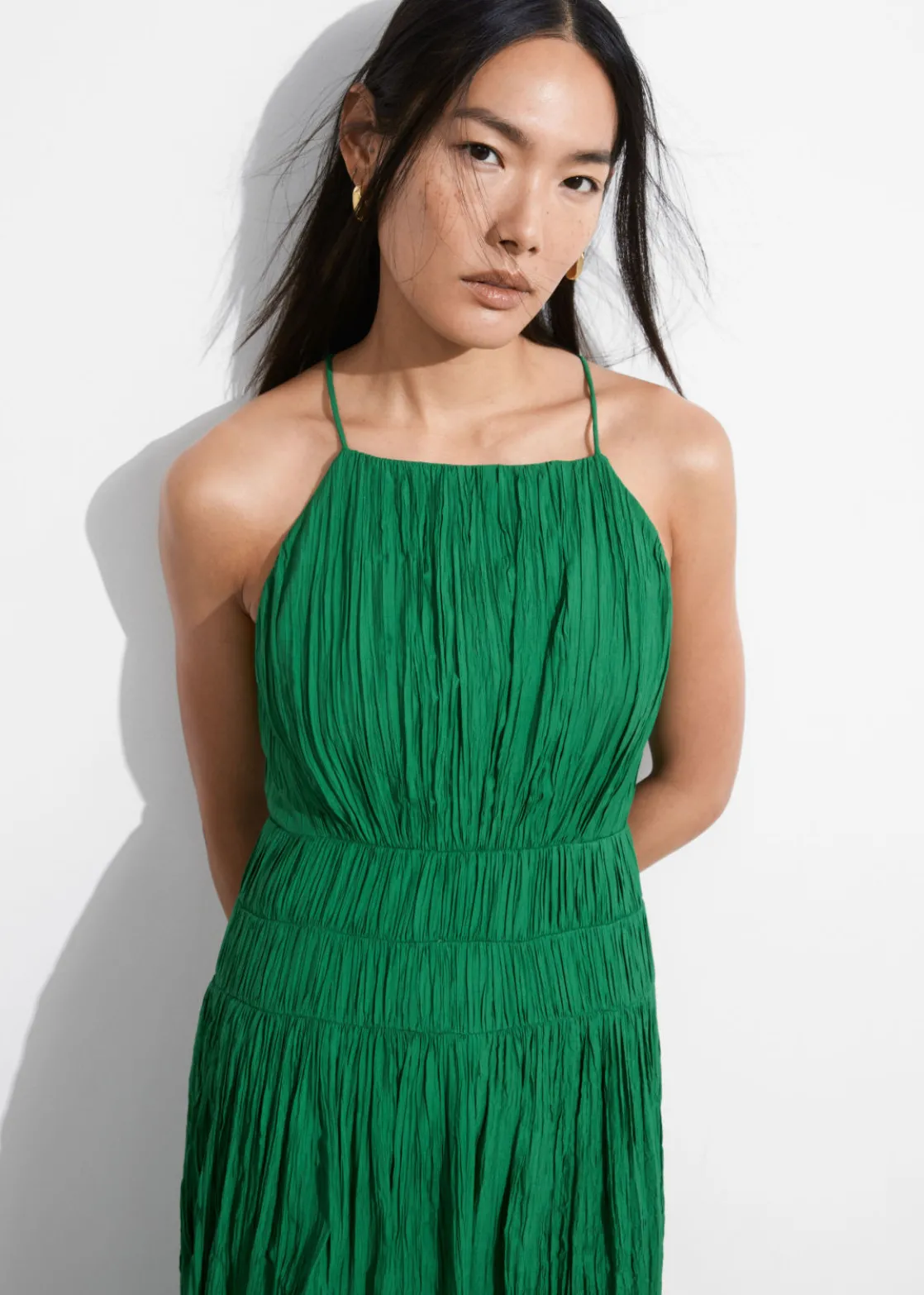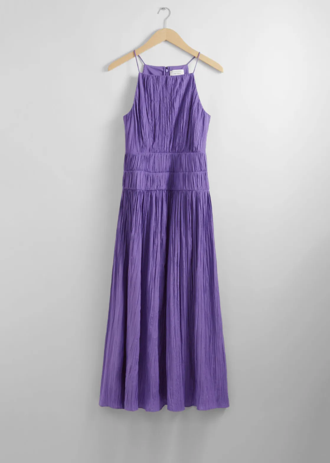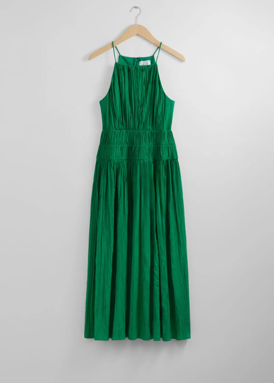 Sleeveless A-line midi dress featuring a shirred finish and duo side seam pockets.