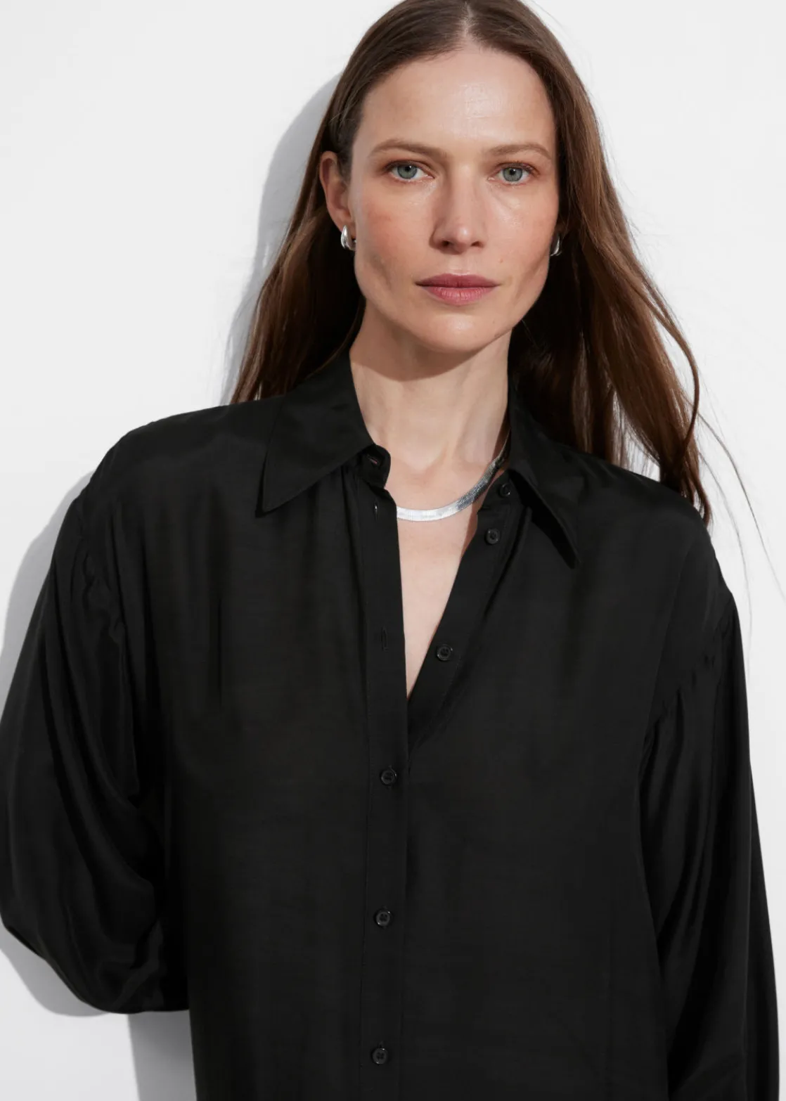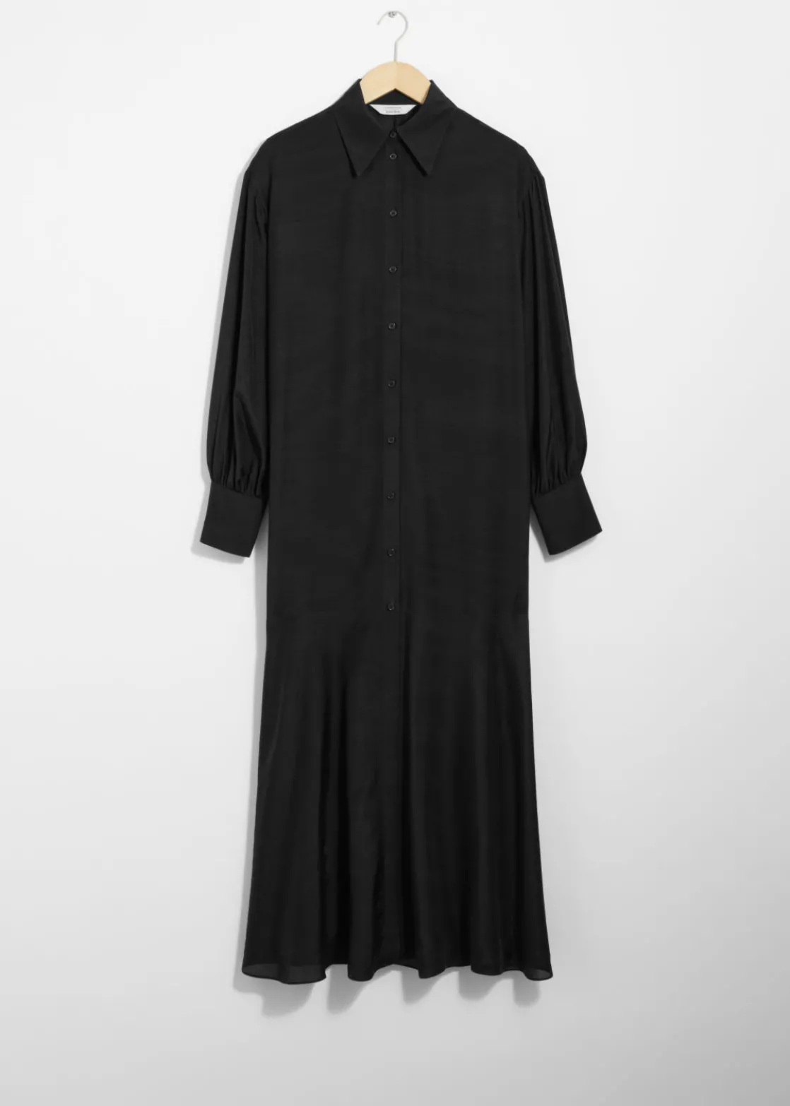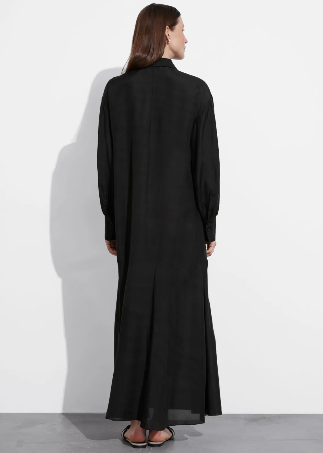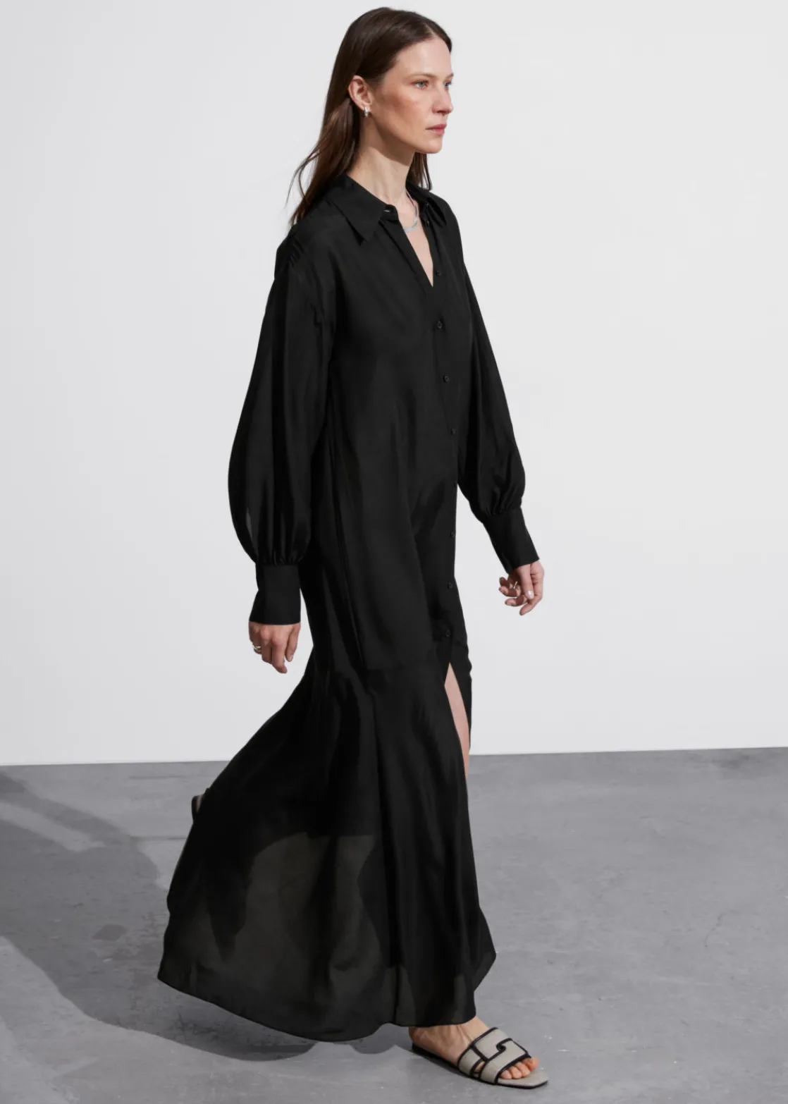 Shirt dress cut in a maxi length. Featuring extended, buttoned cuffs and a centre front slit.