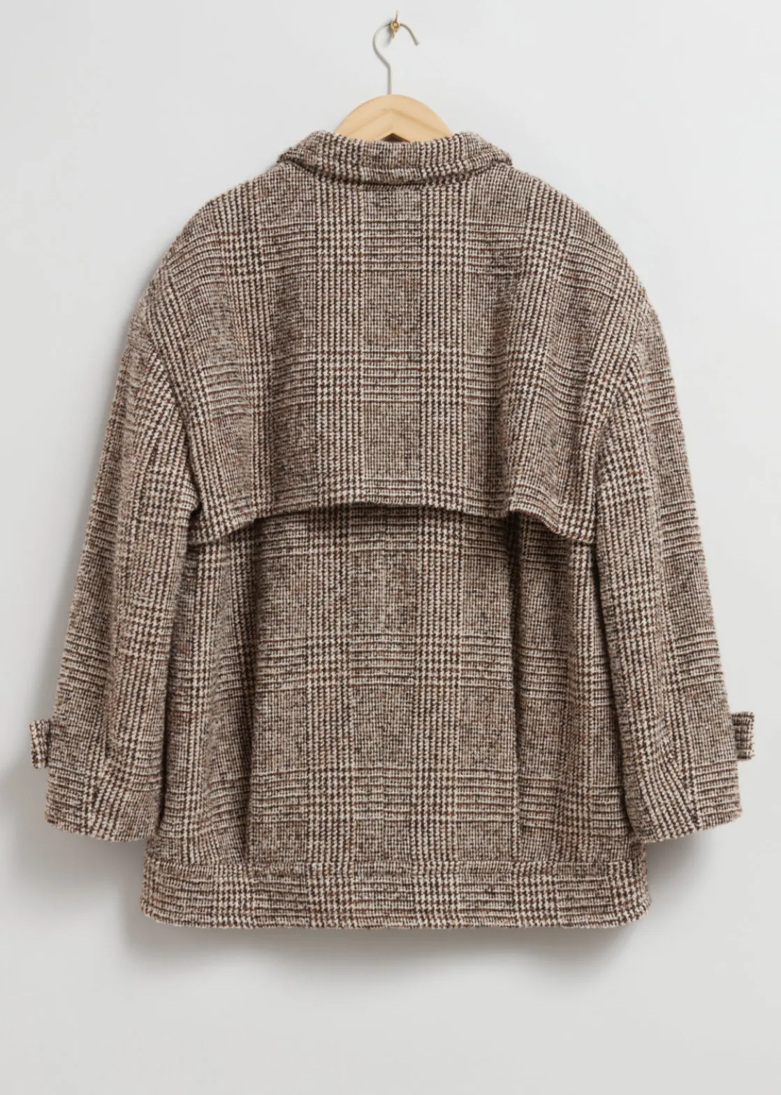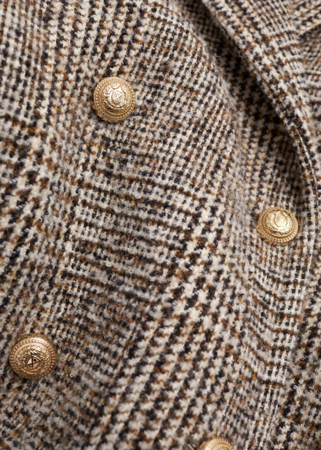 Tweed peacoat featuring a double-breasted finish and a short, oversized silhouette.