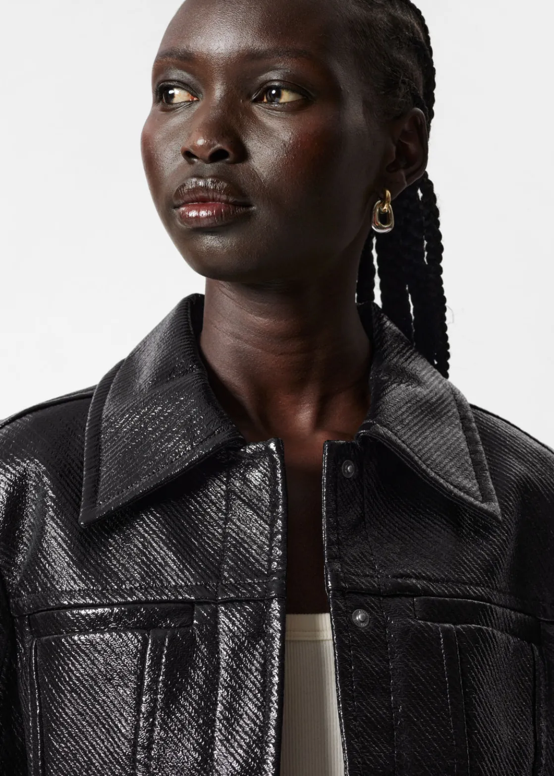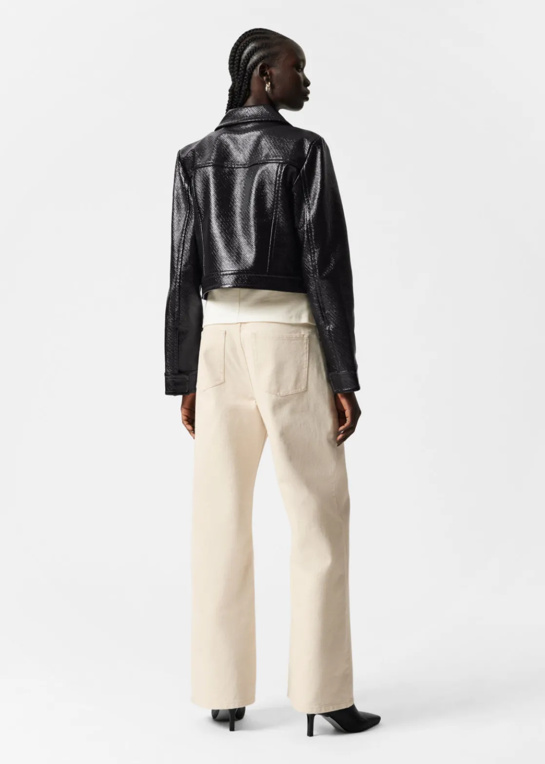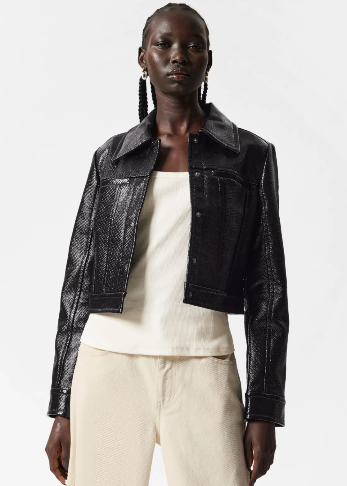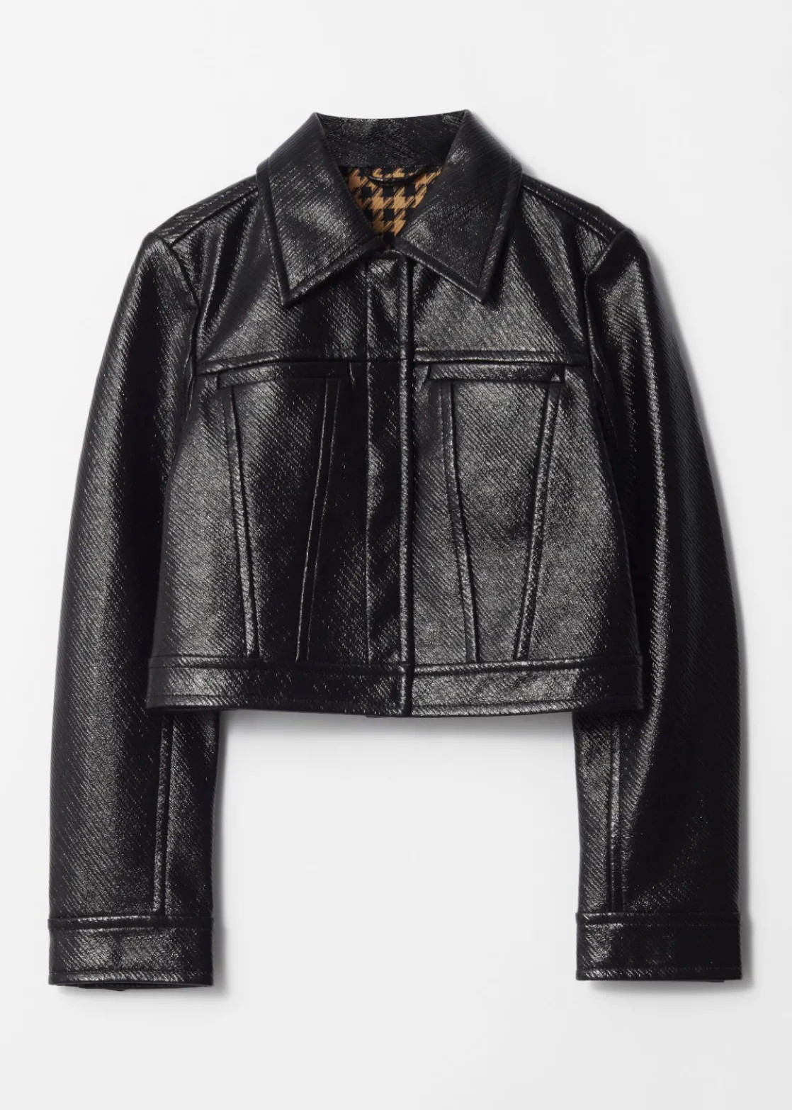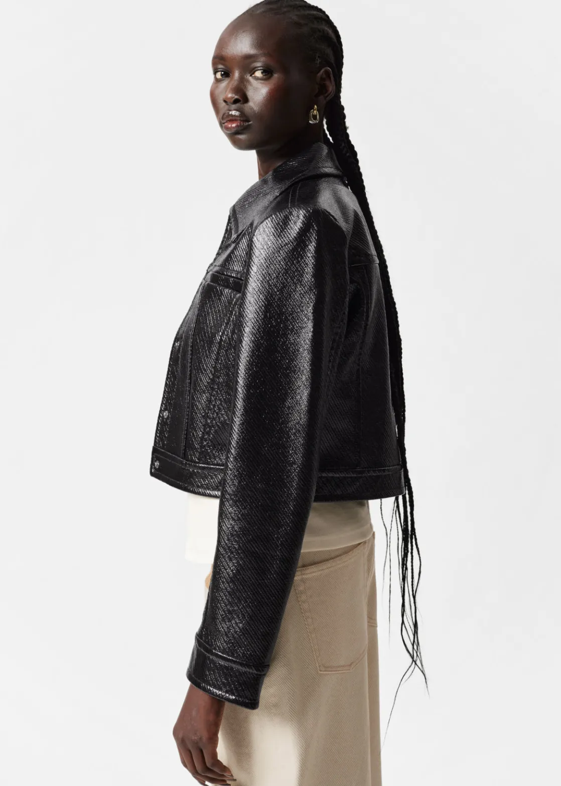 Short long-sleeve jacket in a patent finish. Traced with concealed snap button closures.