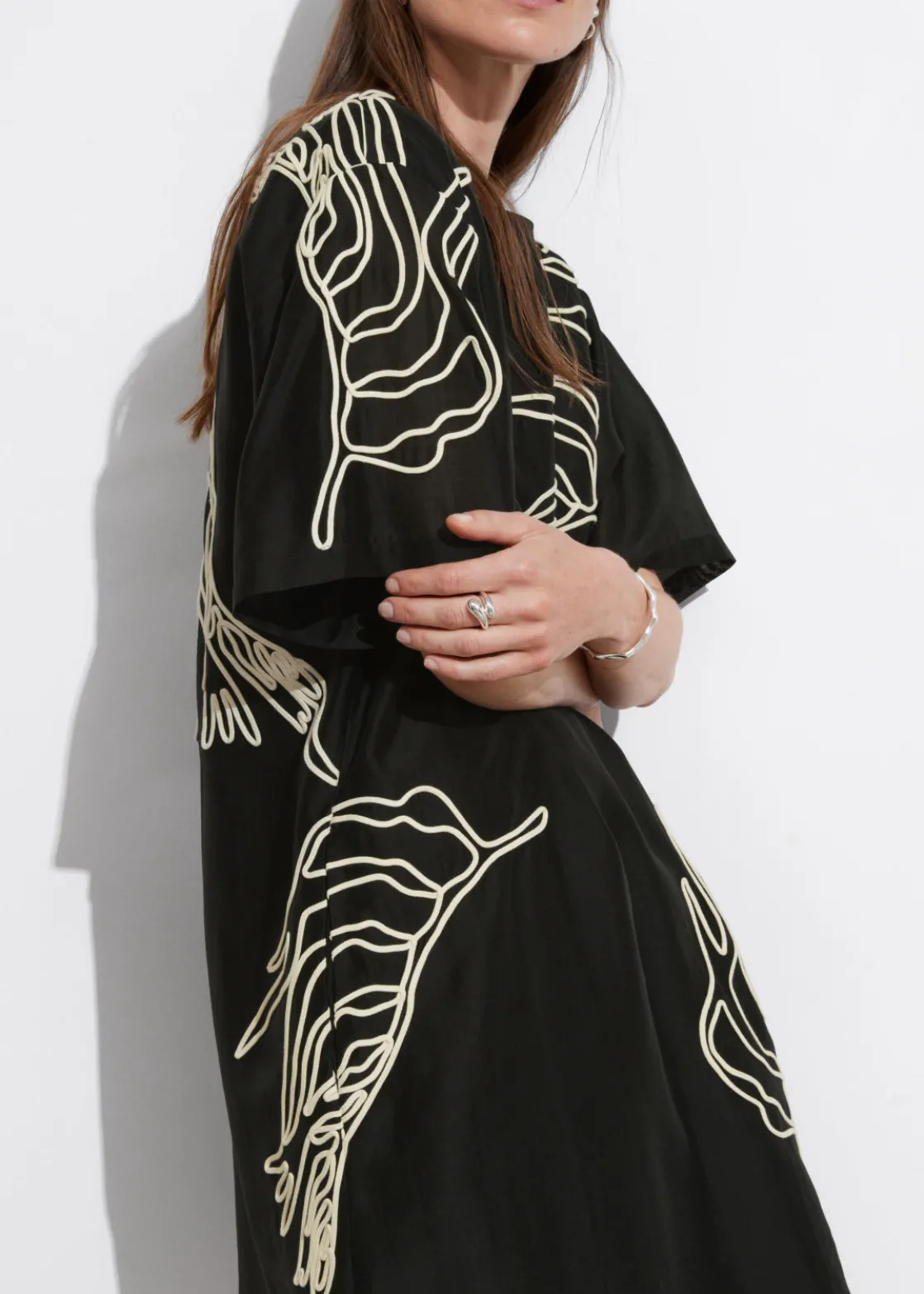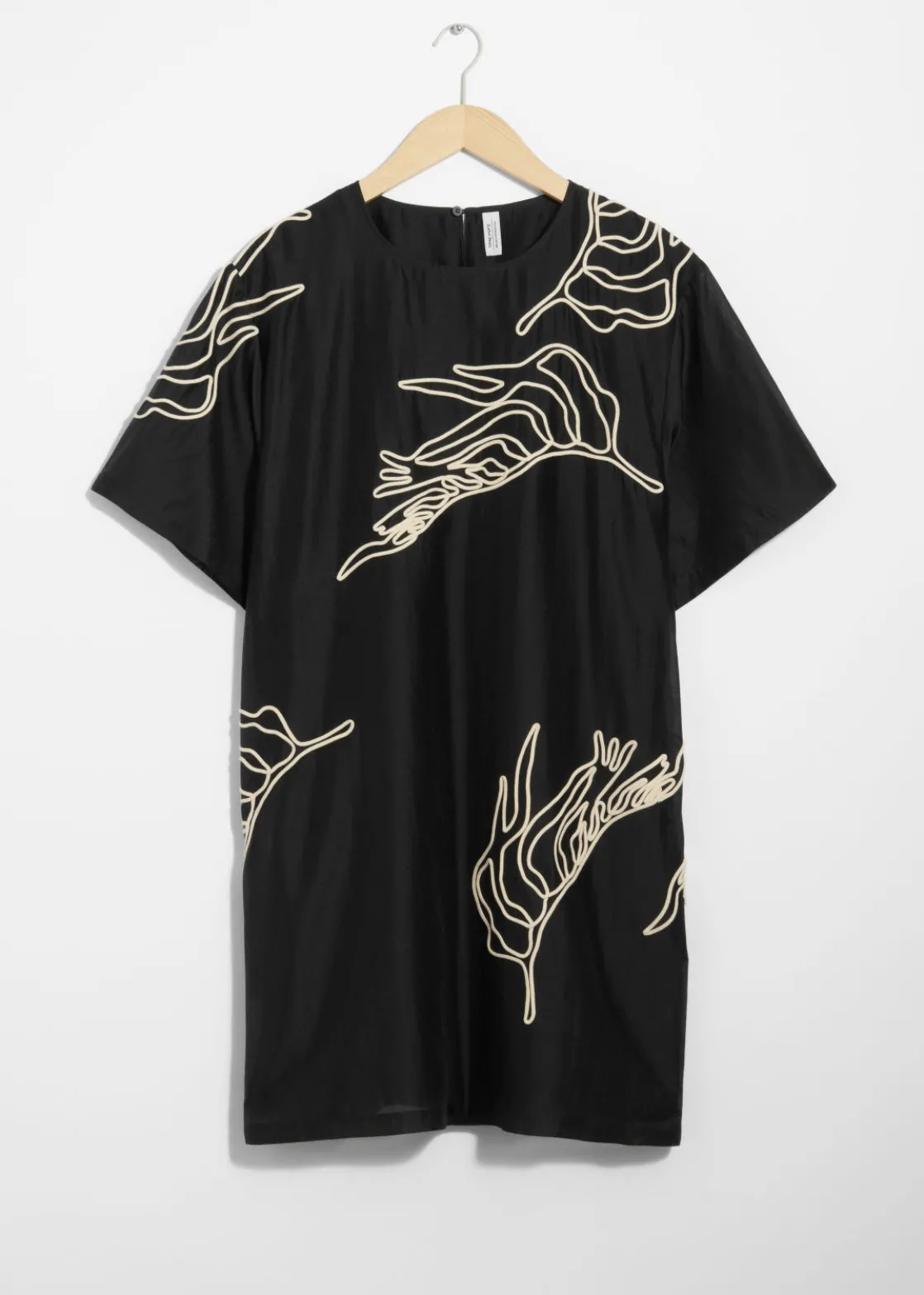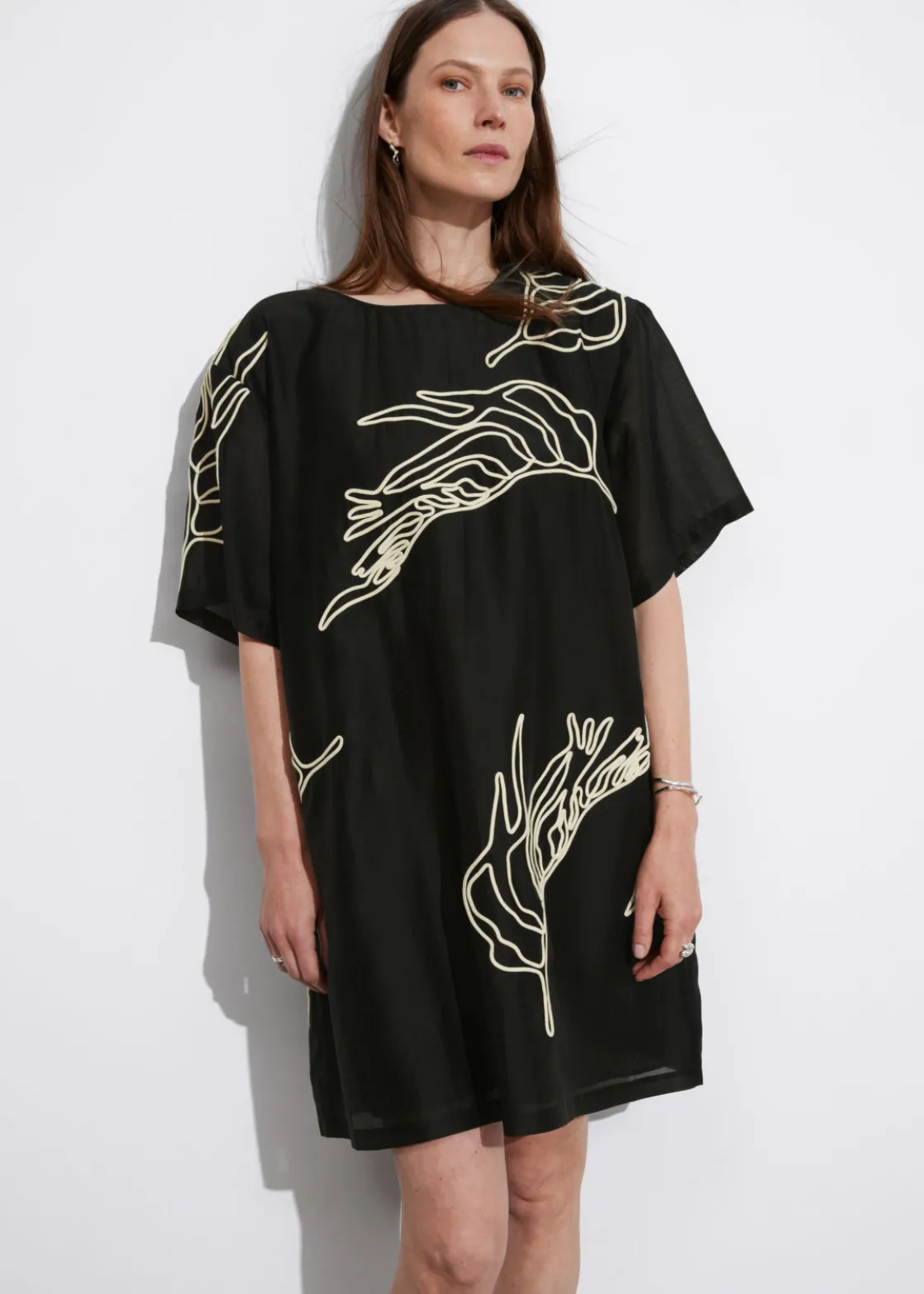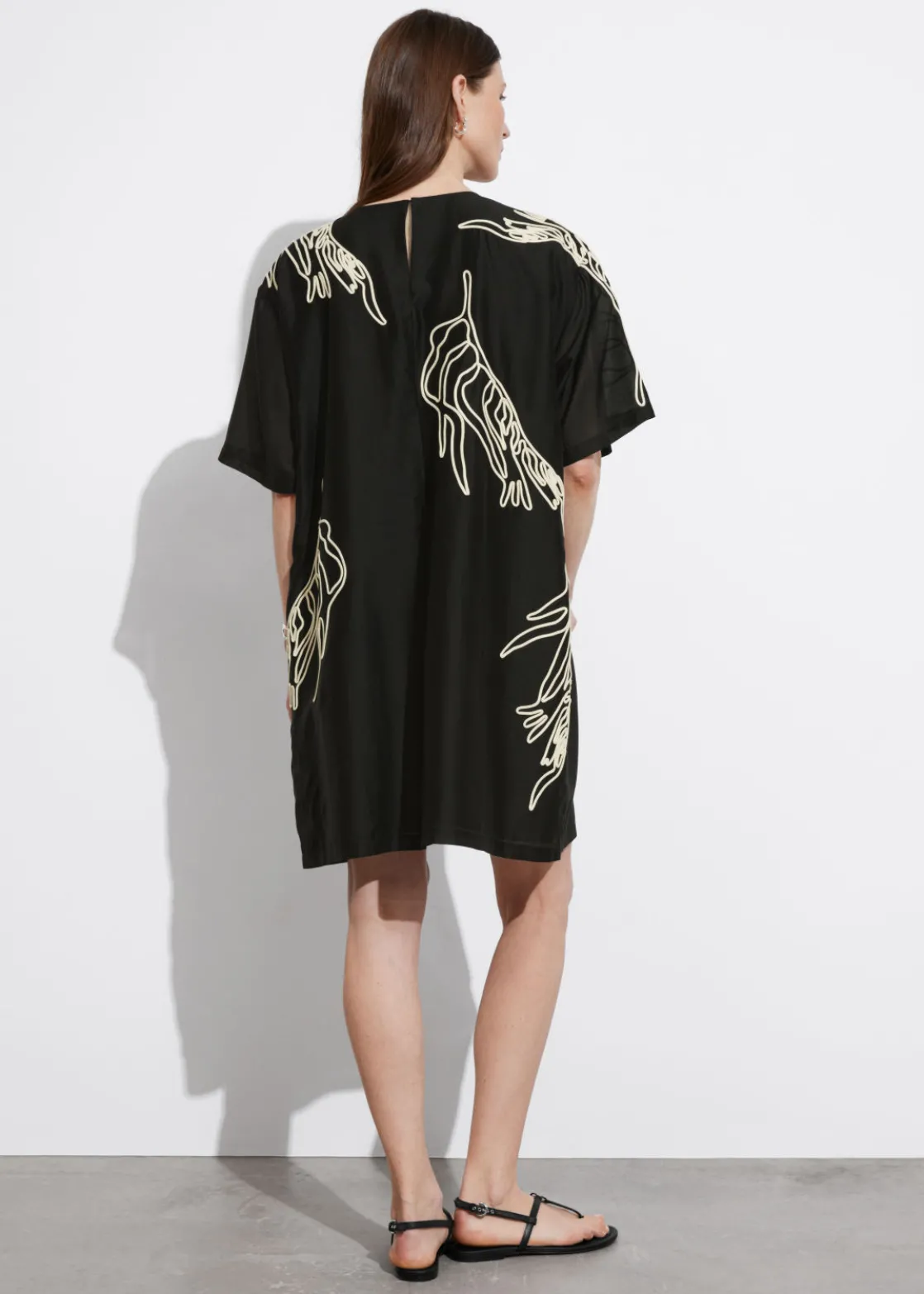 A-line throw-on mini dress featuring tape appliqué detailing and short sleeves.
