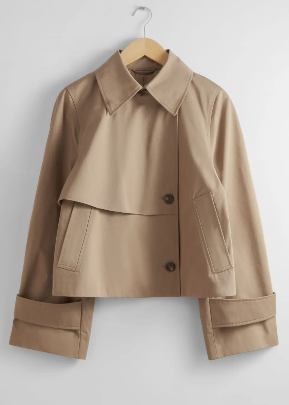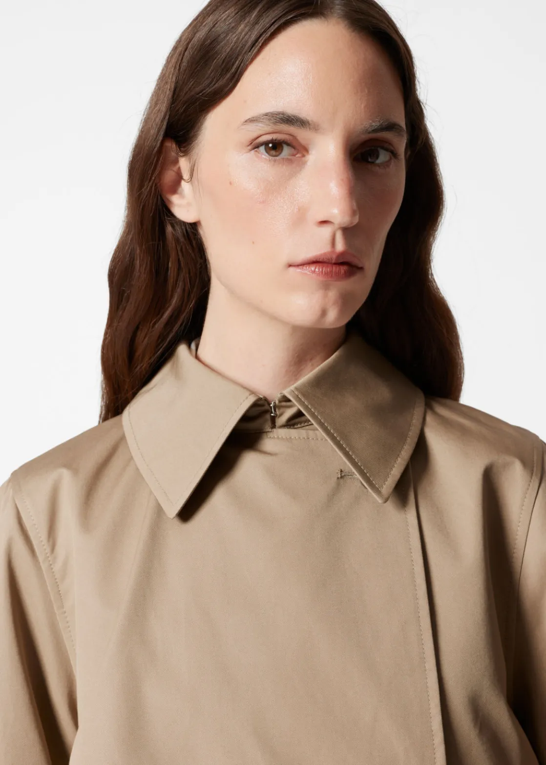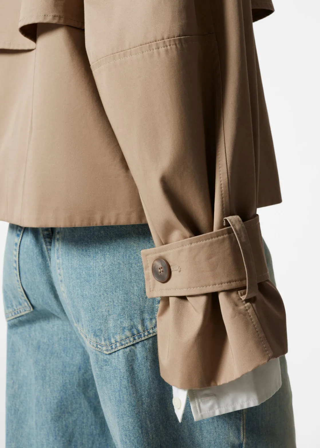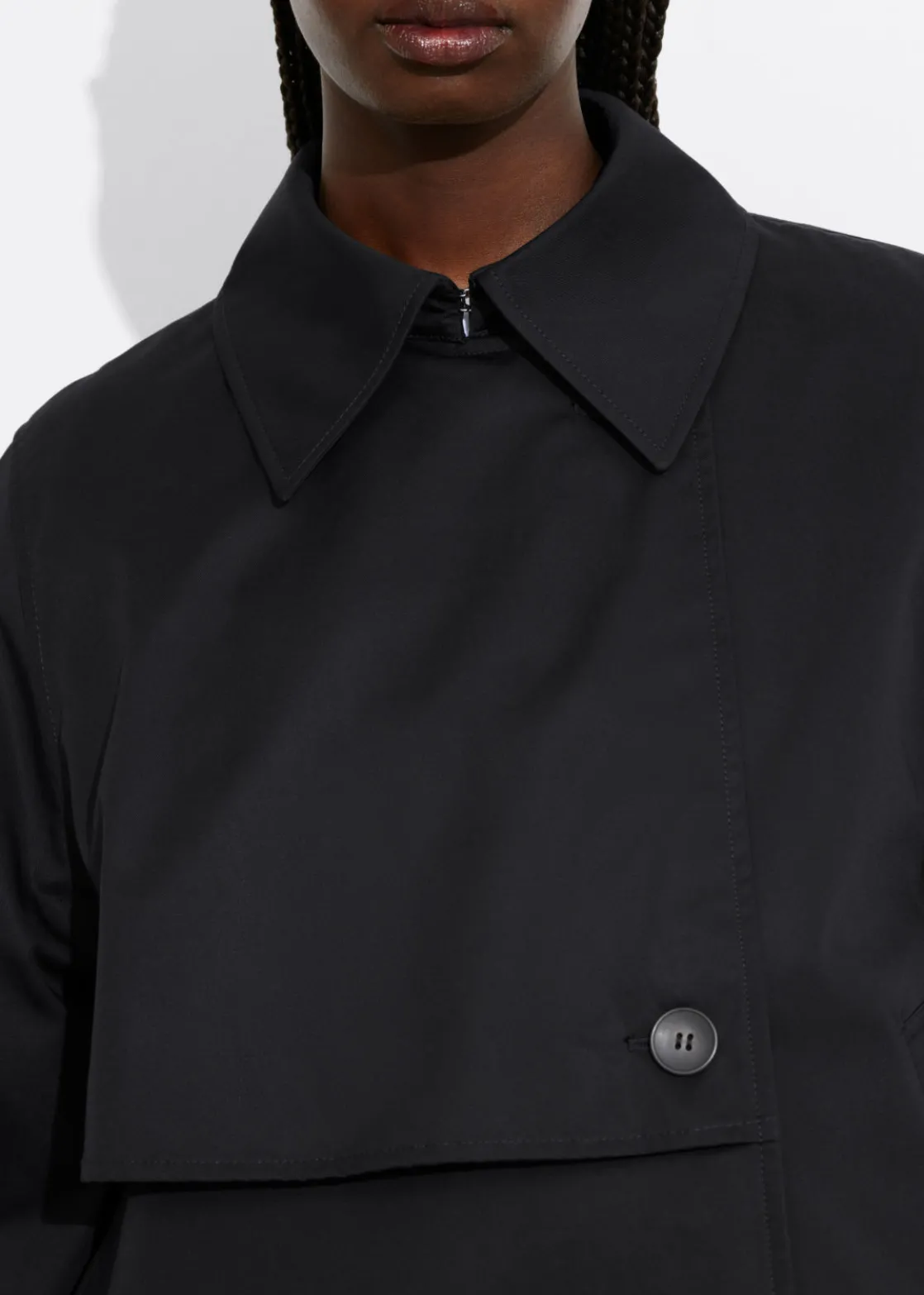 Collared jacket with trenchcoat-inspired finish, featuring an overlapping lapel.