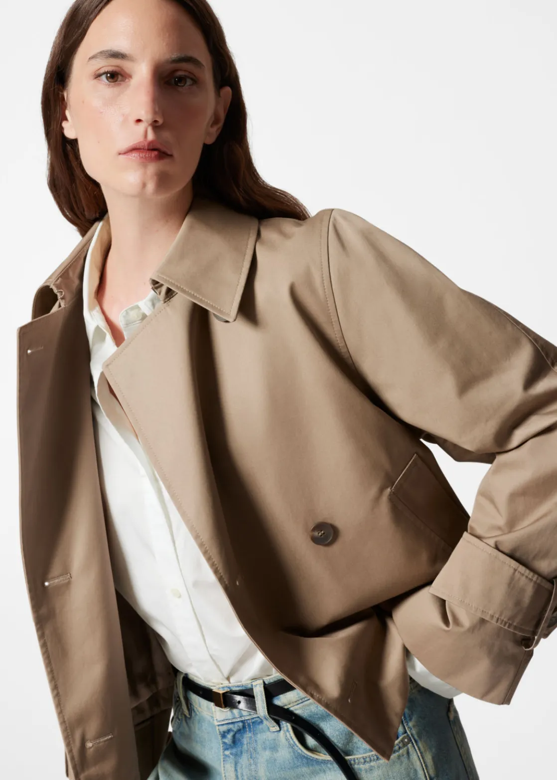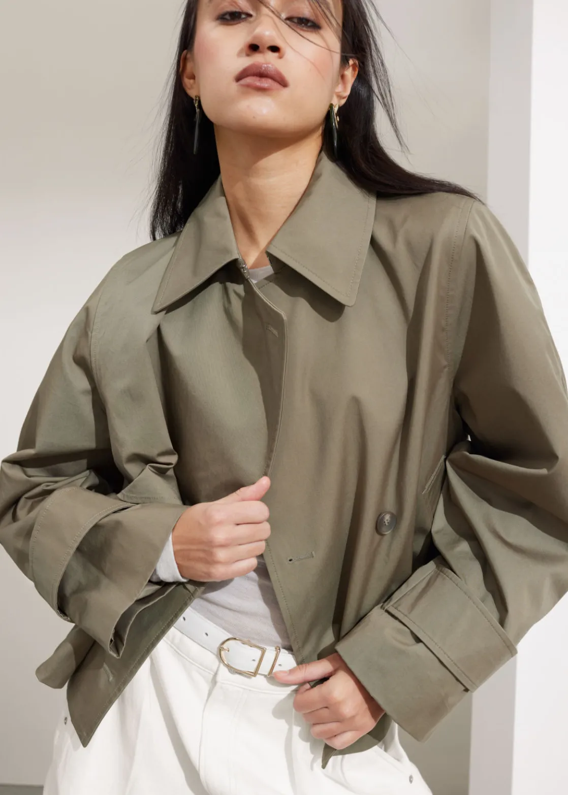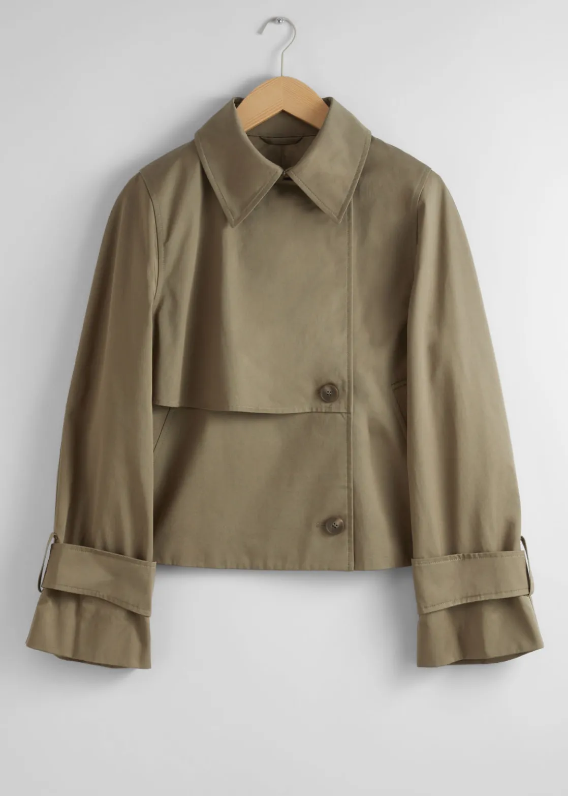 Collared jacket with trenchcoat-inspired finish, featuring an overlapping lapel.