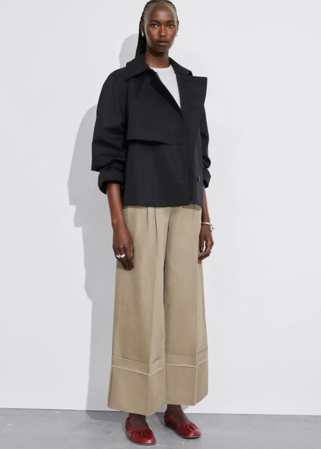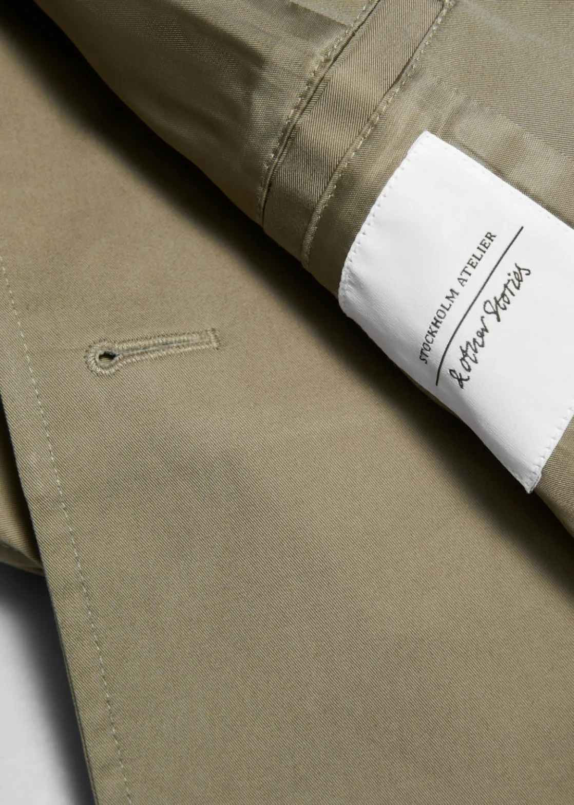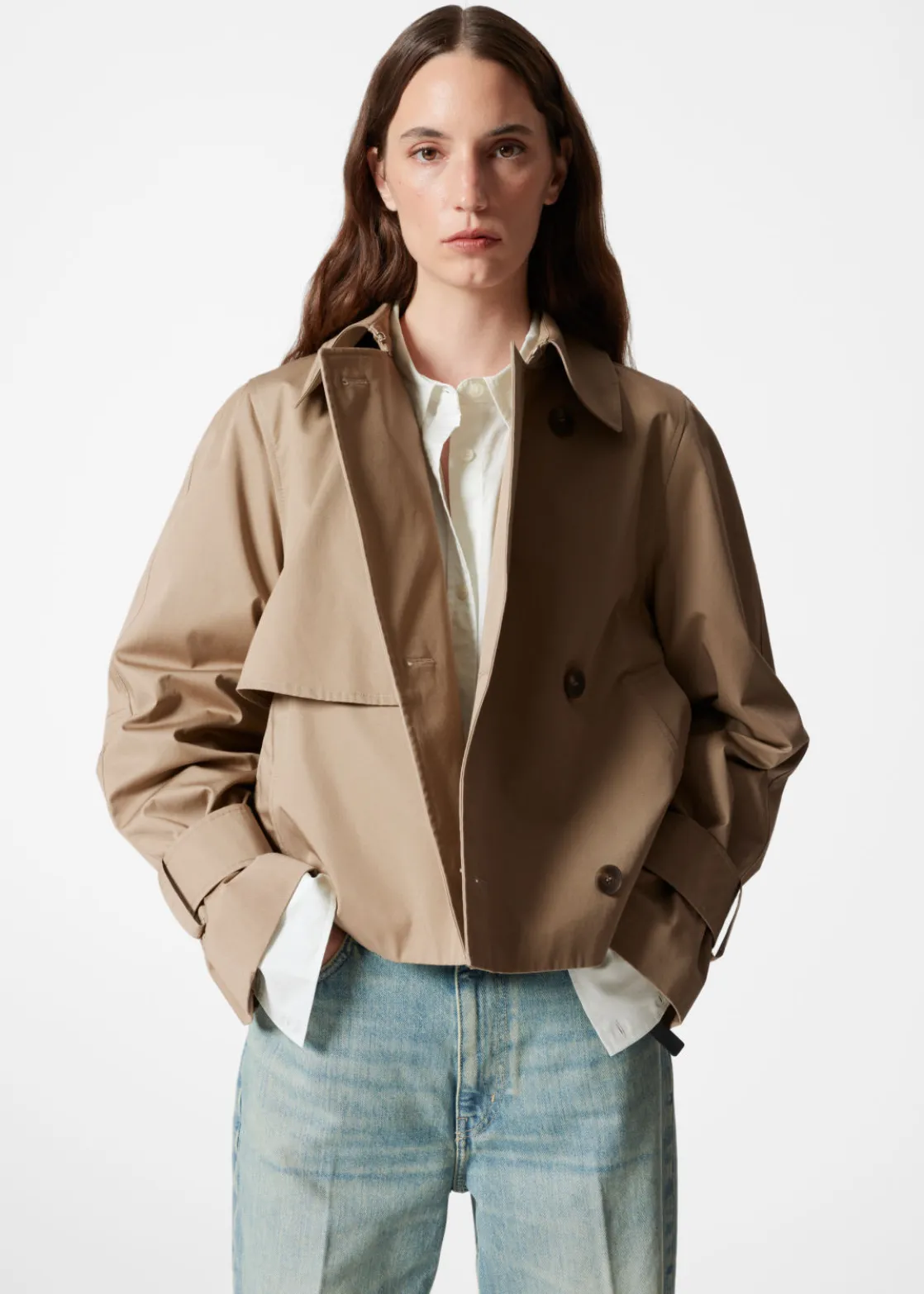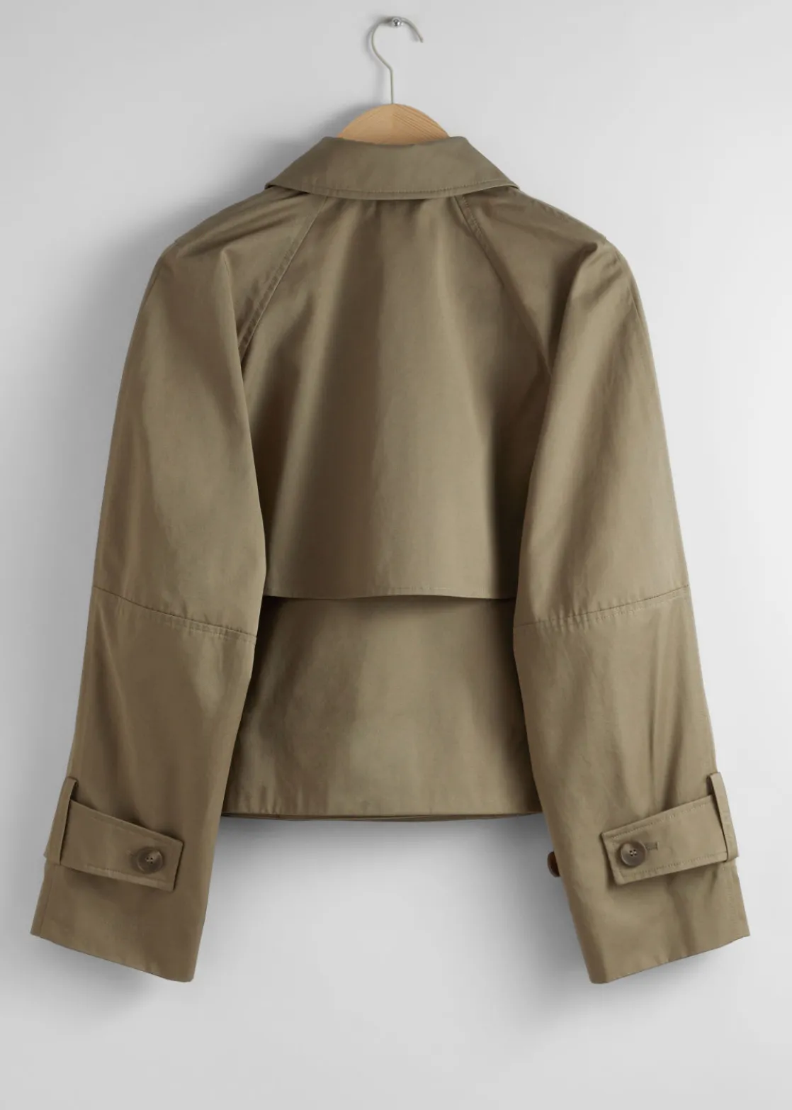 Collared jacket with trenchcoat-inspired finish, featuring an overlapping lapel.