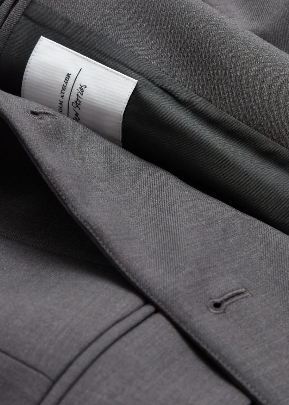 Wool-blend blazer designed with a notched-lapel collar, a v-cut neckline and buttoned front.