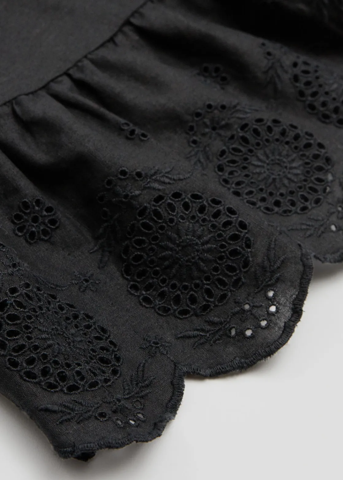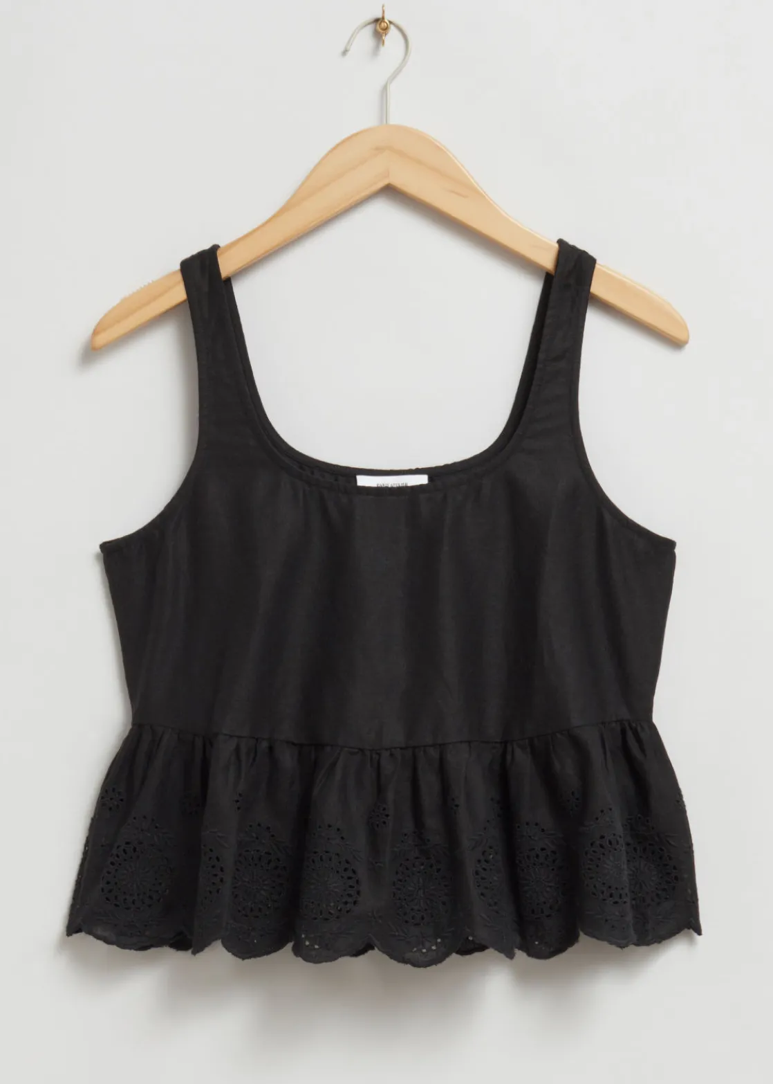 Sleeveless broderie anglaise top crafted from linen and cotton. Designed with a round-cut neckline, decorative embroidery detail, and a scalloped hemline.