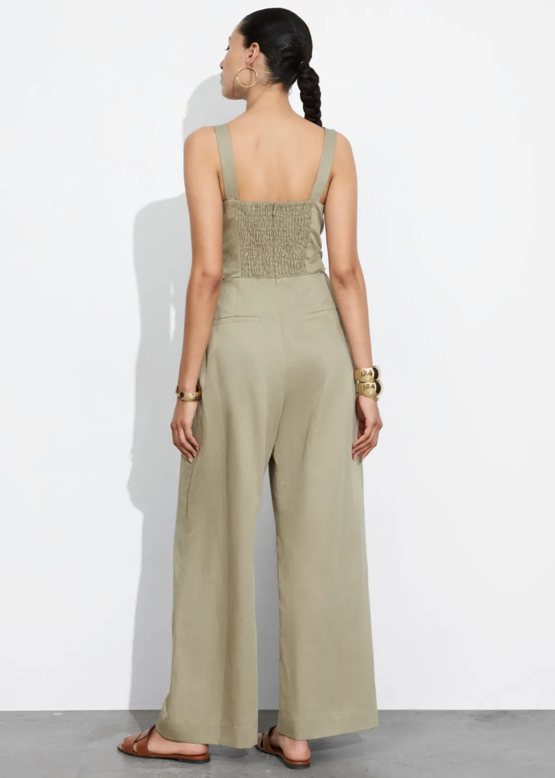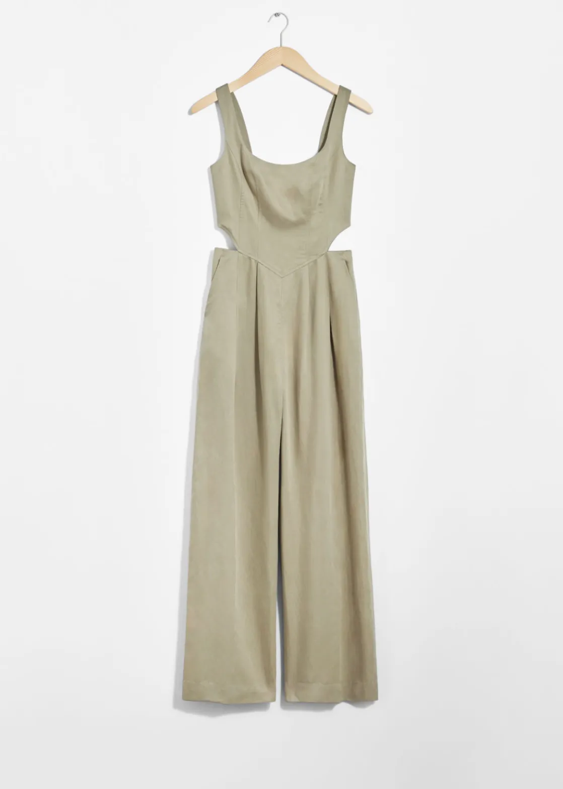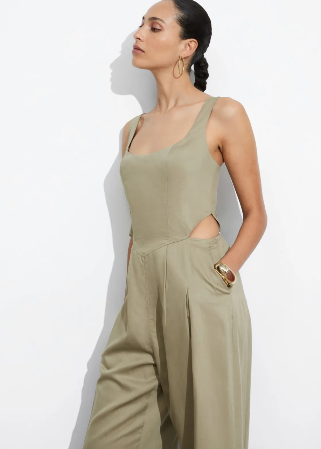 Sleeveless jumpsuit accented with cut-out detailing at the waist.