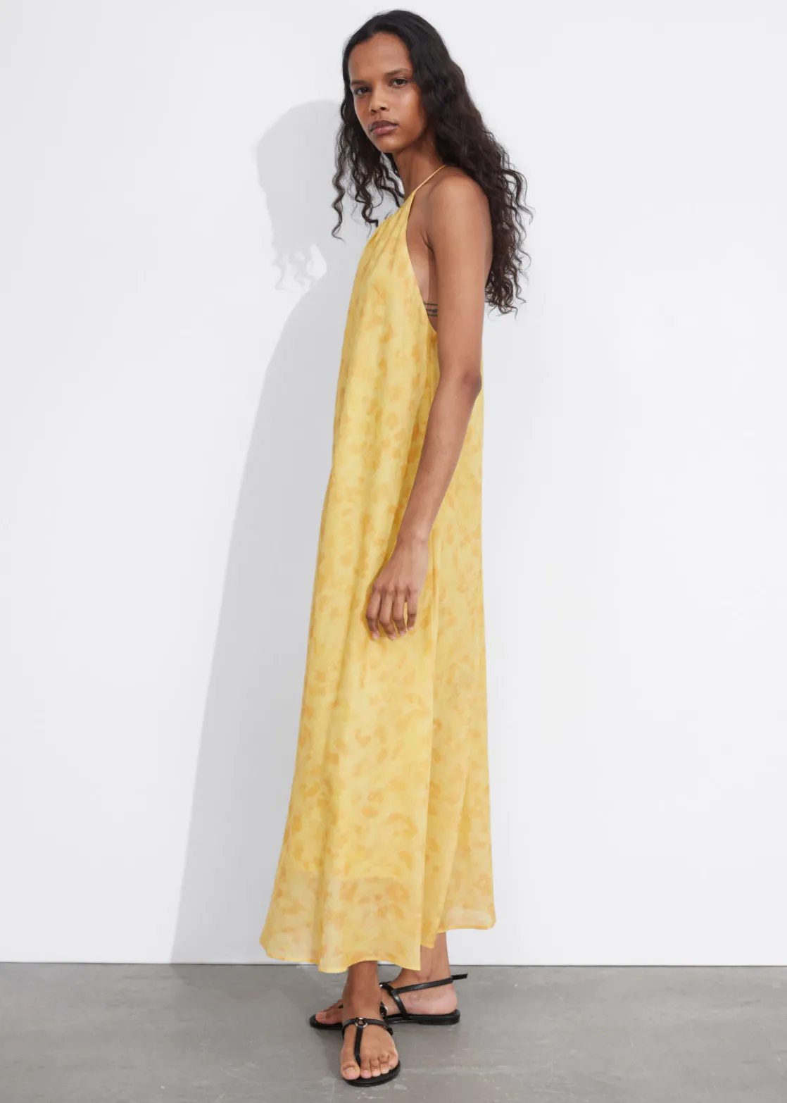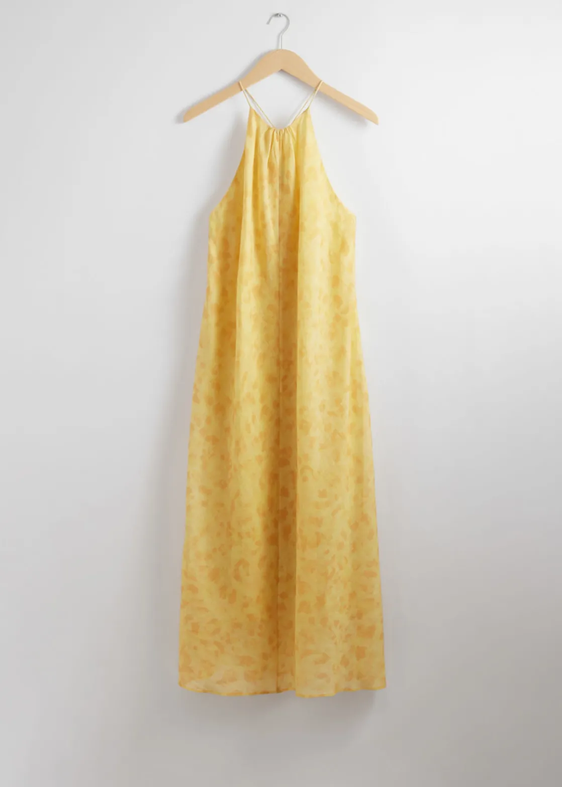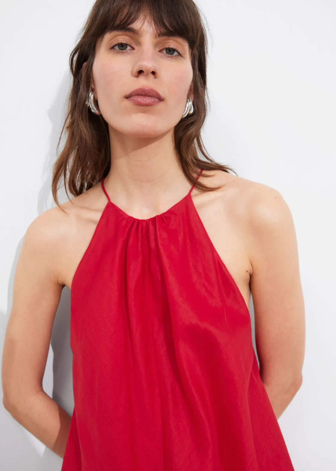 Sleeveless A-line midi dress featuring a halterneck with thin spaghetti straps.