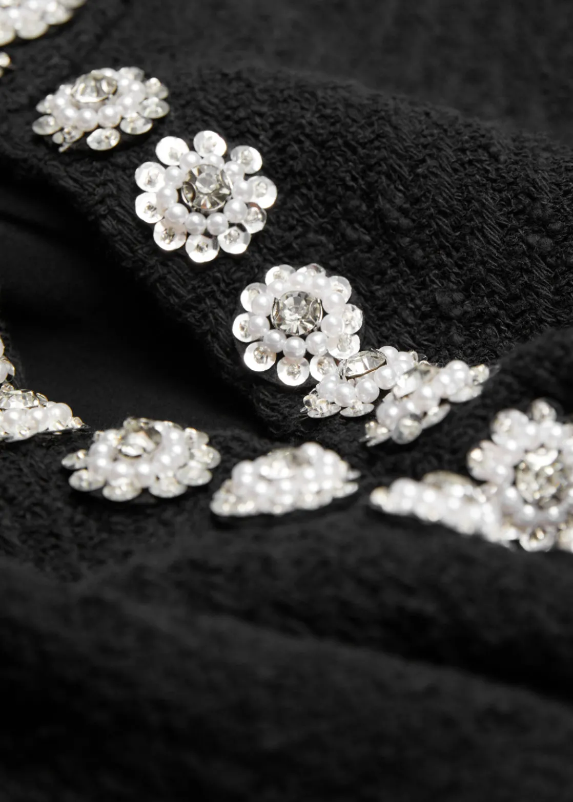 Sleeveless A-line mini dress adorned with floral rhinestone embellishments at the collar and chest.