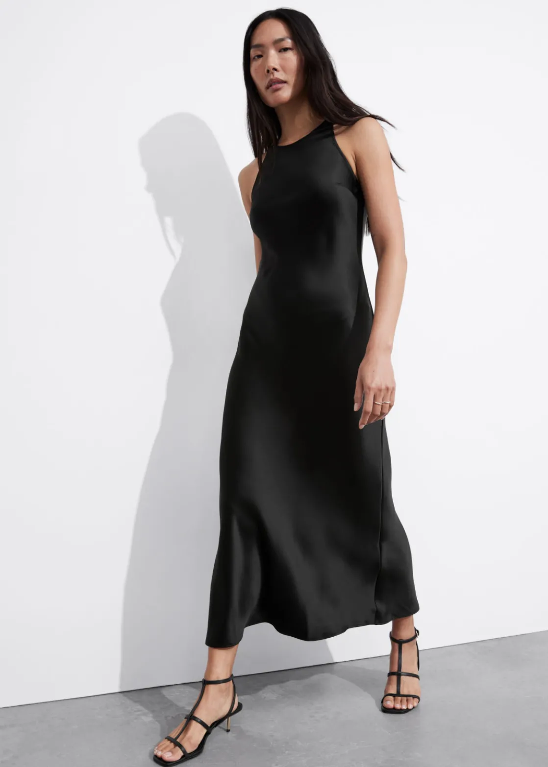 Sleeveless satin dress featuring a glossy, satin finish and a round neckline. Finished with a keyhole closure at the neck.