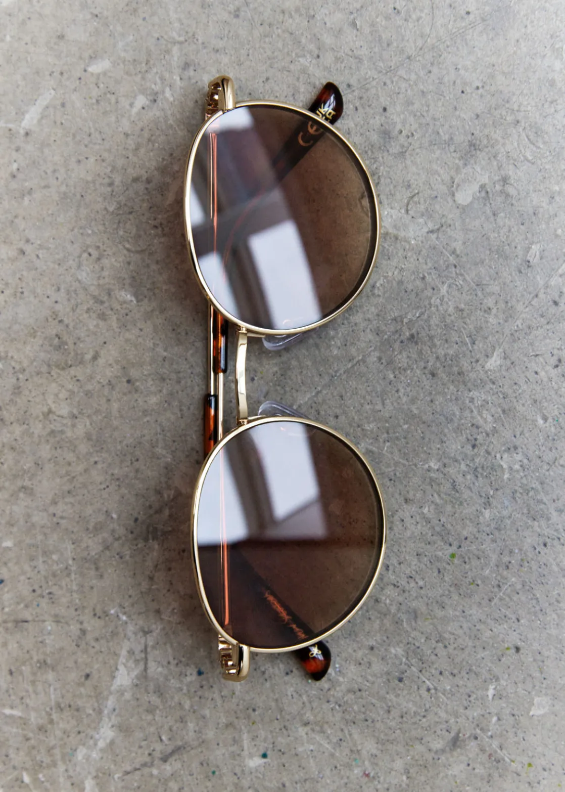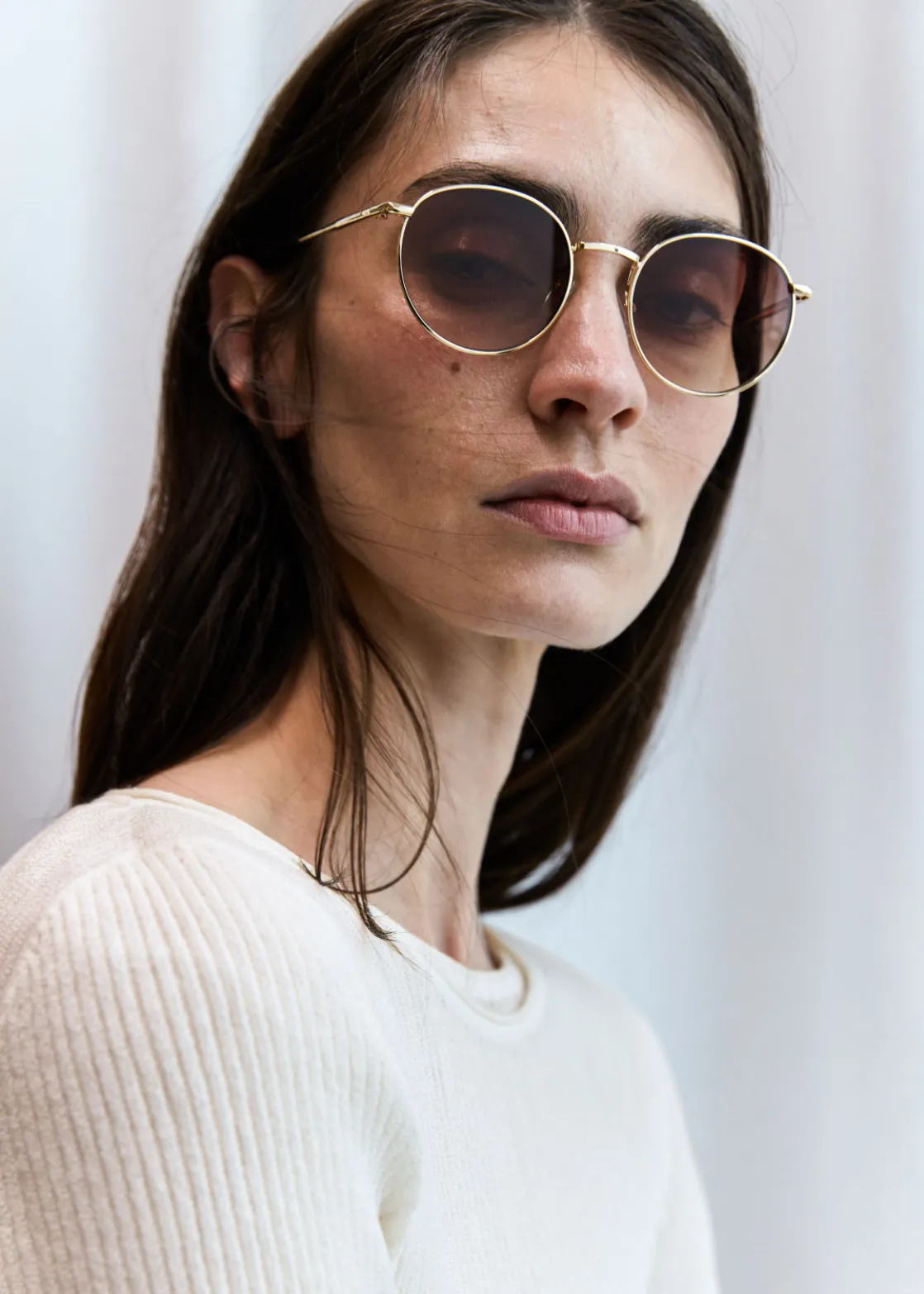These sunglasses have narrow, oval frames. Made from polished metal with a lightweight feel, they have slim arms complete with acetate tips.