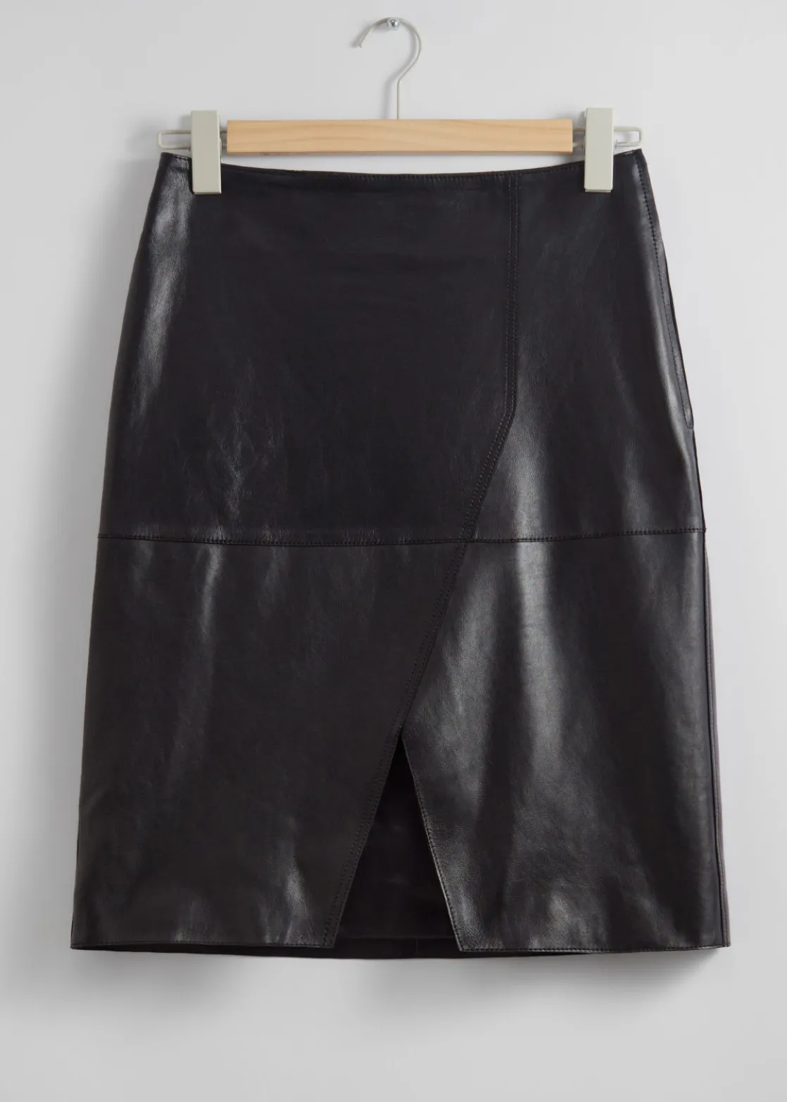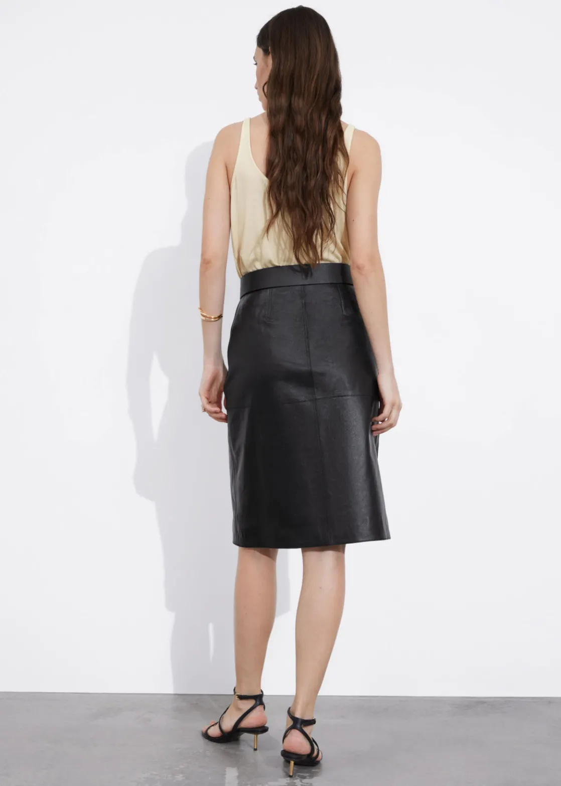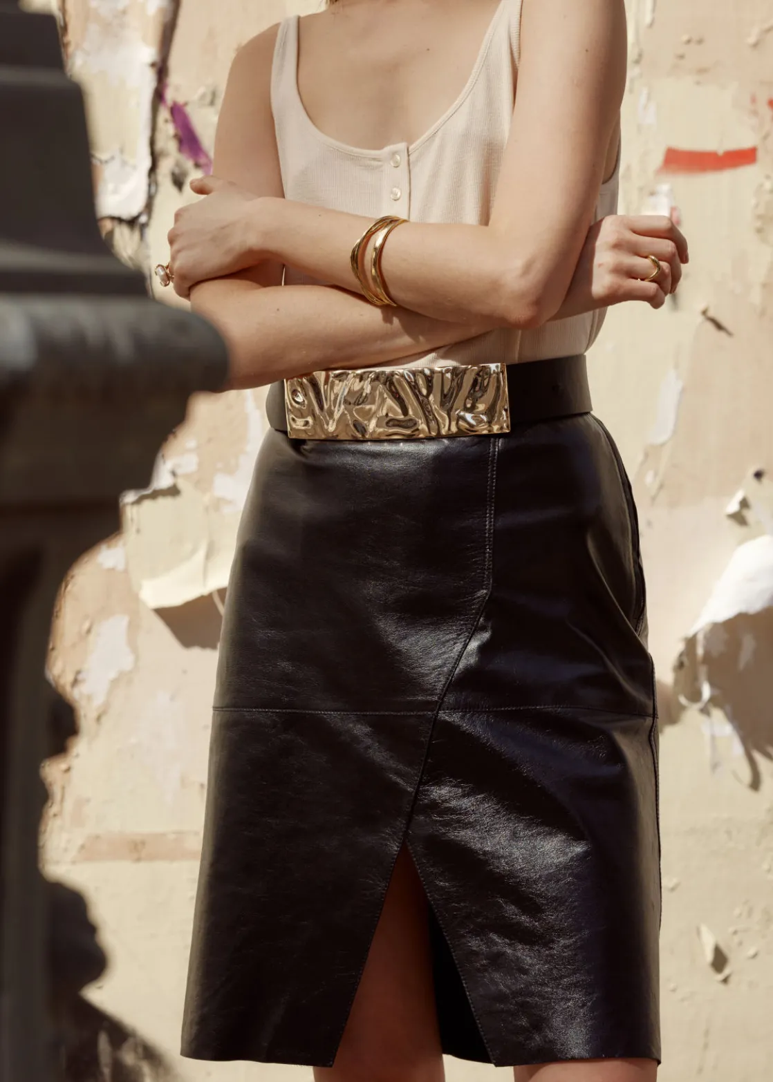 High-waist leather mini skirt featuring an overlapping finish and a centre front slit.