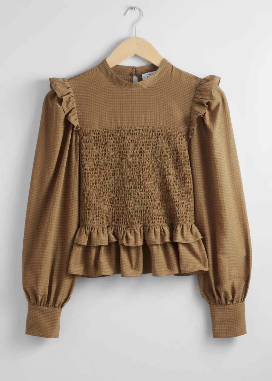 Long-sleeve blouse featuring a smocked midsection and frilled detailing at the shoulders and at the hemline.