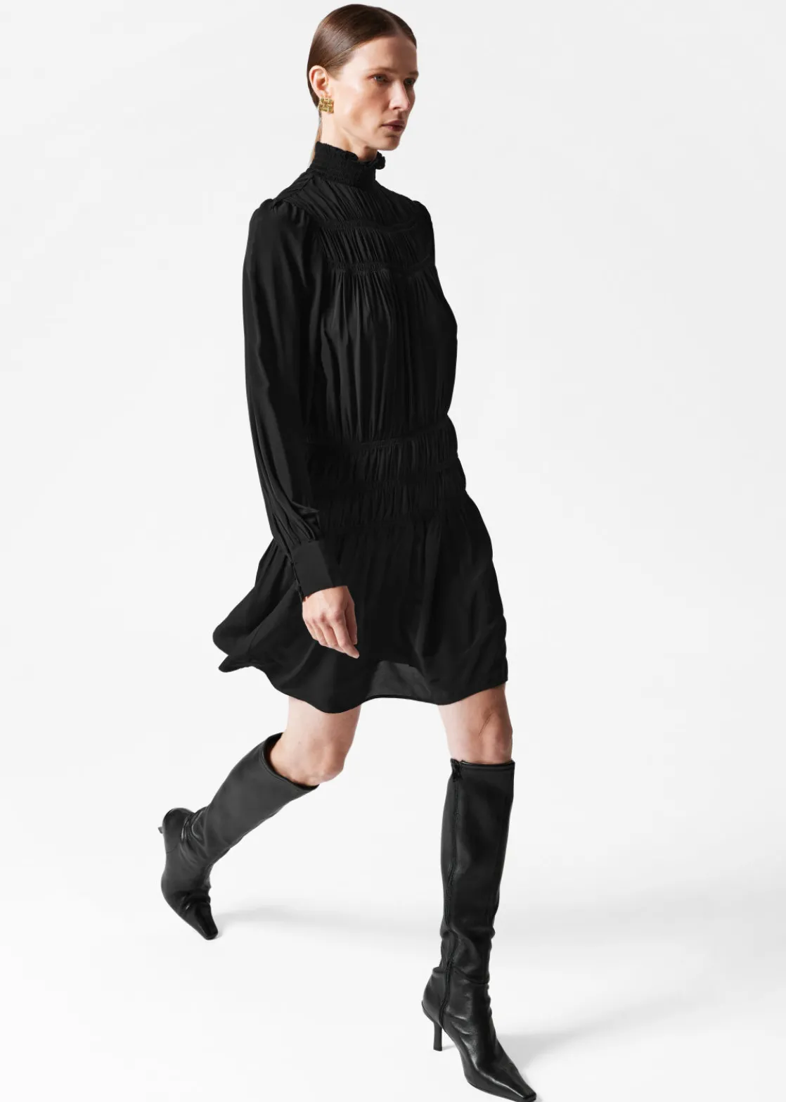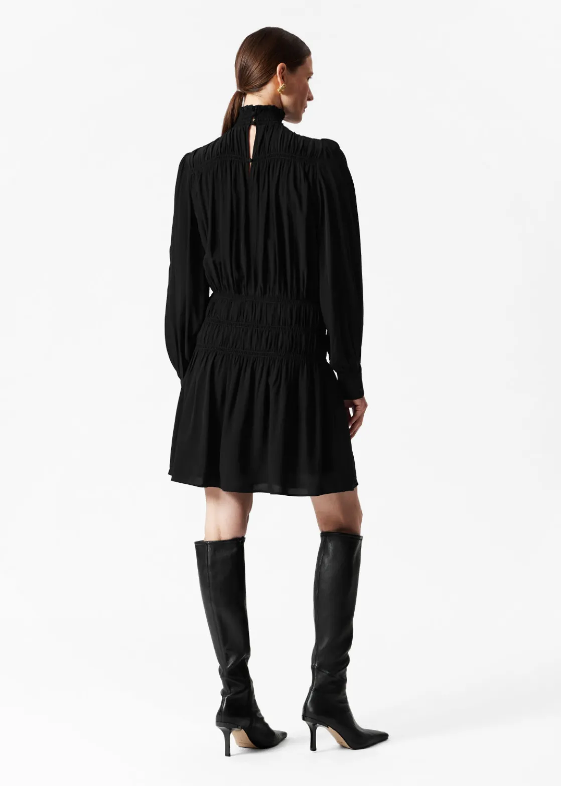 Flouncy mini dress featuring a high, smocked neck and gathered detailing at the waist and at the chest.