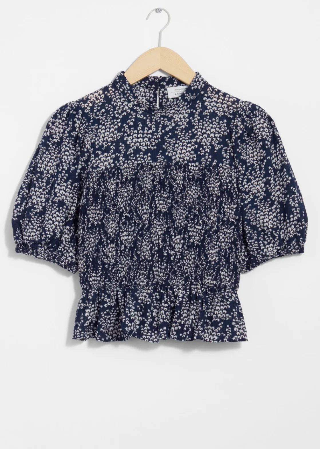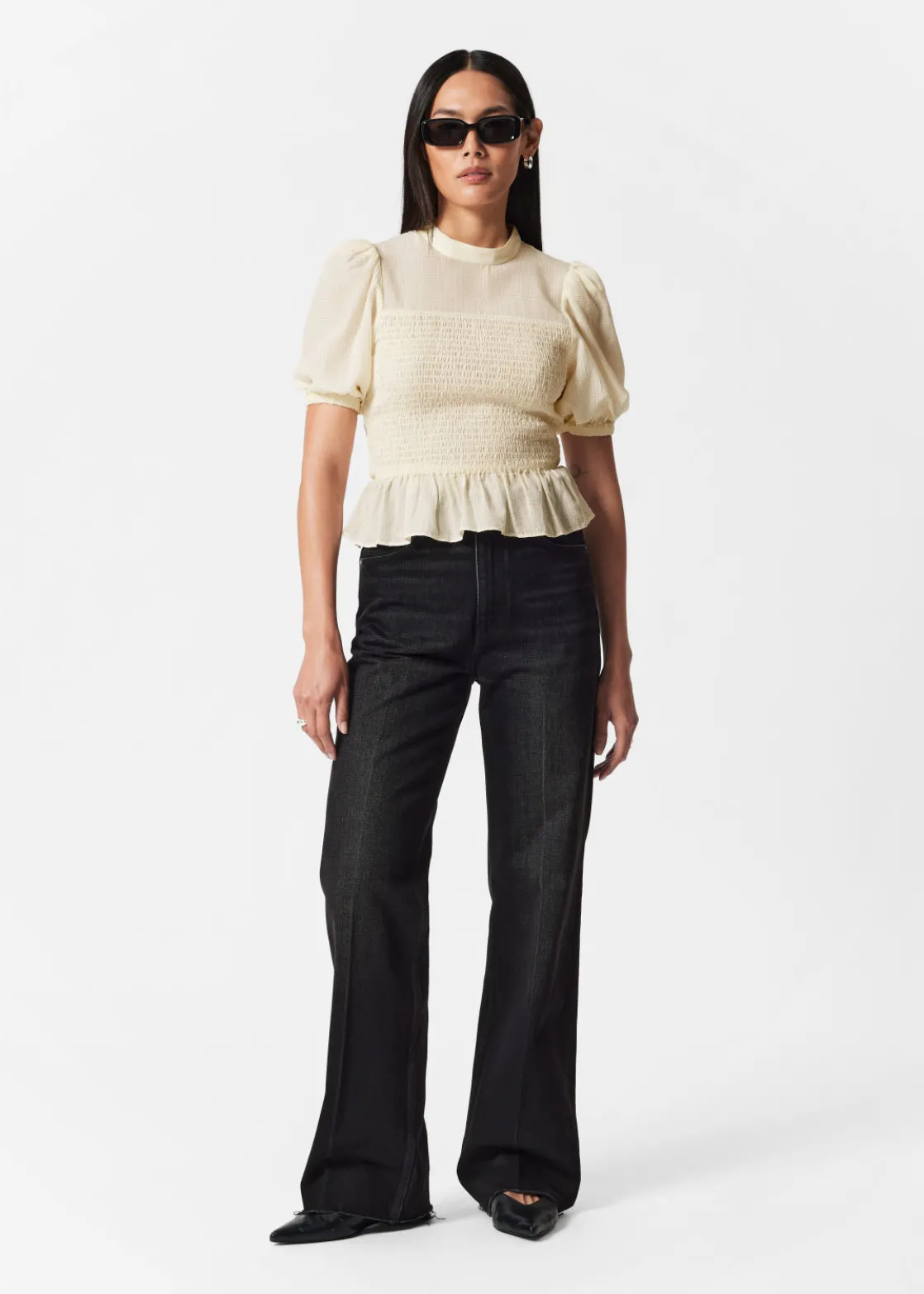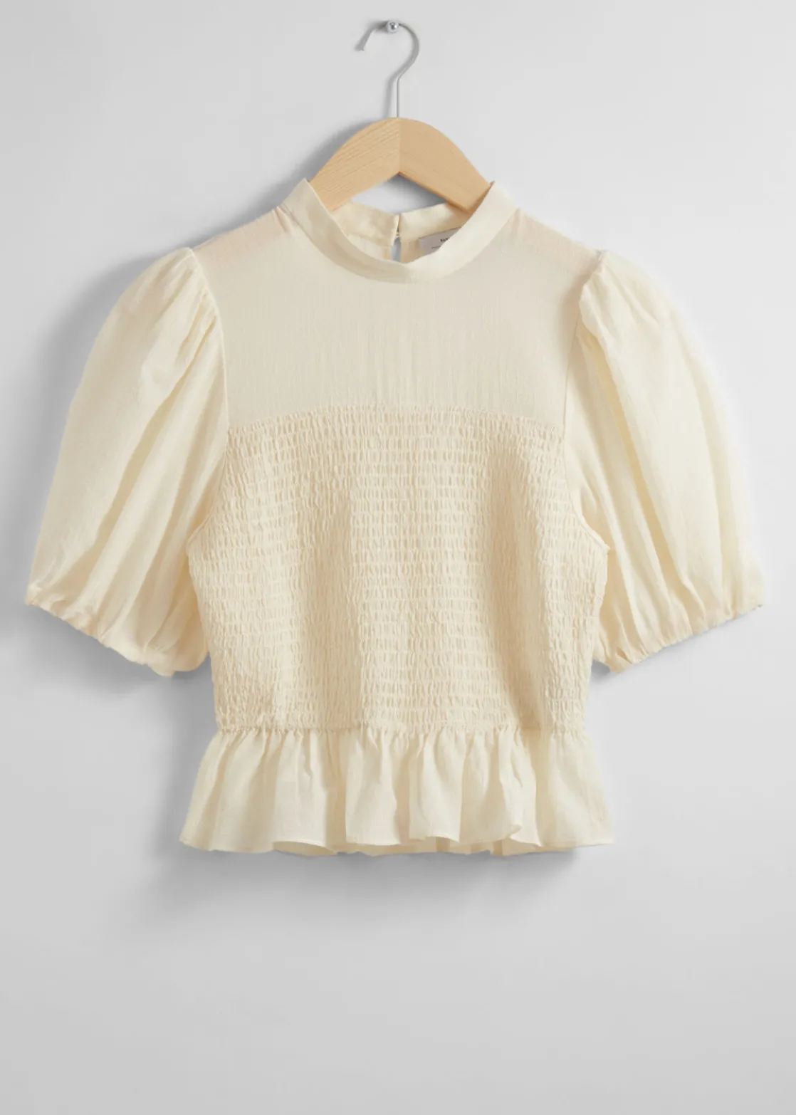 Blouse featuring short puff sleeves, a smocked body and a peplum hemline.