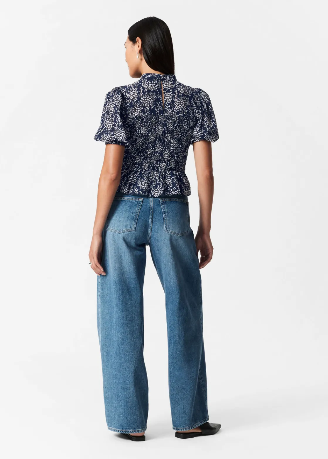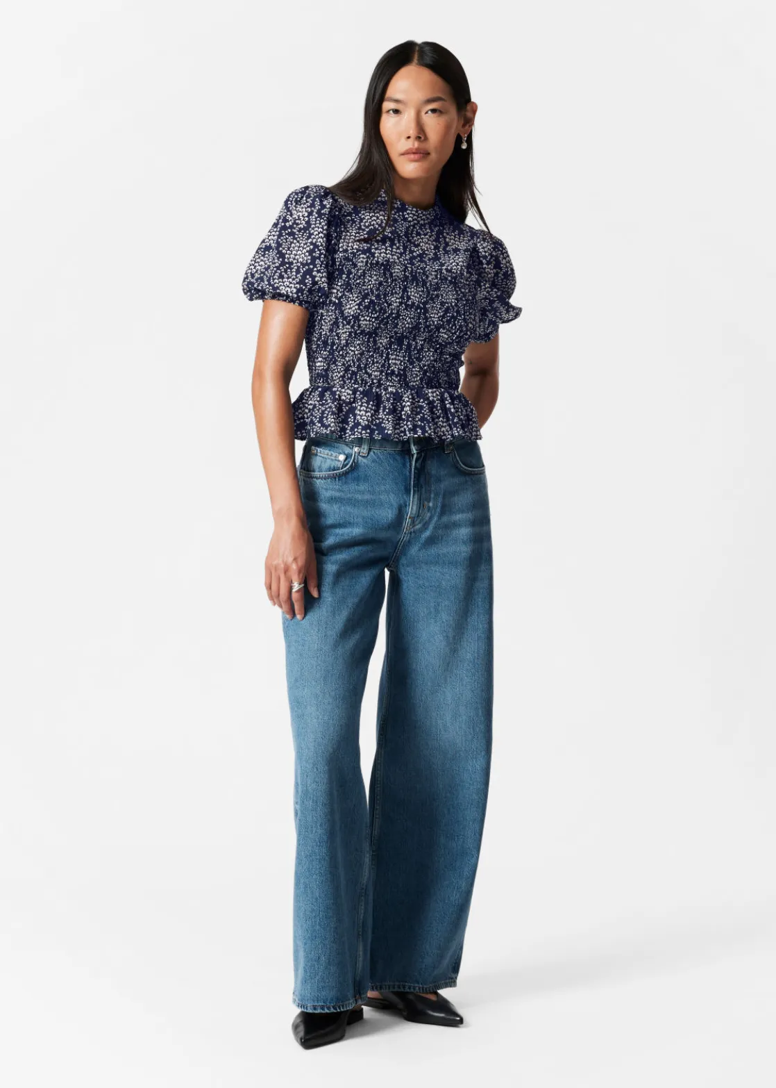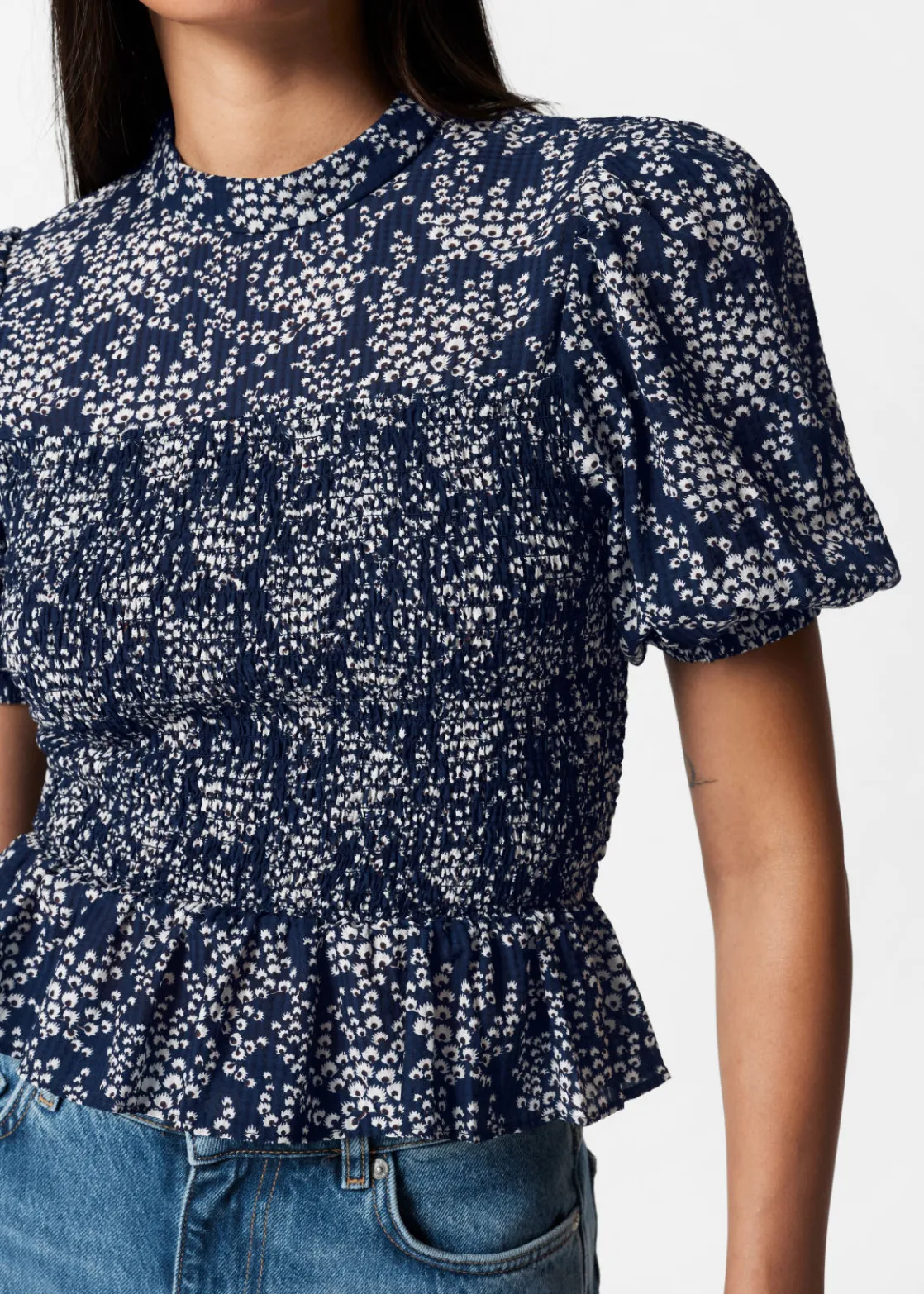 Blouse featuring short puff sleeves, a smocked body and a peplum hemline.