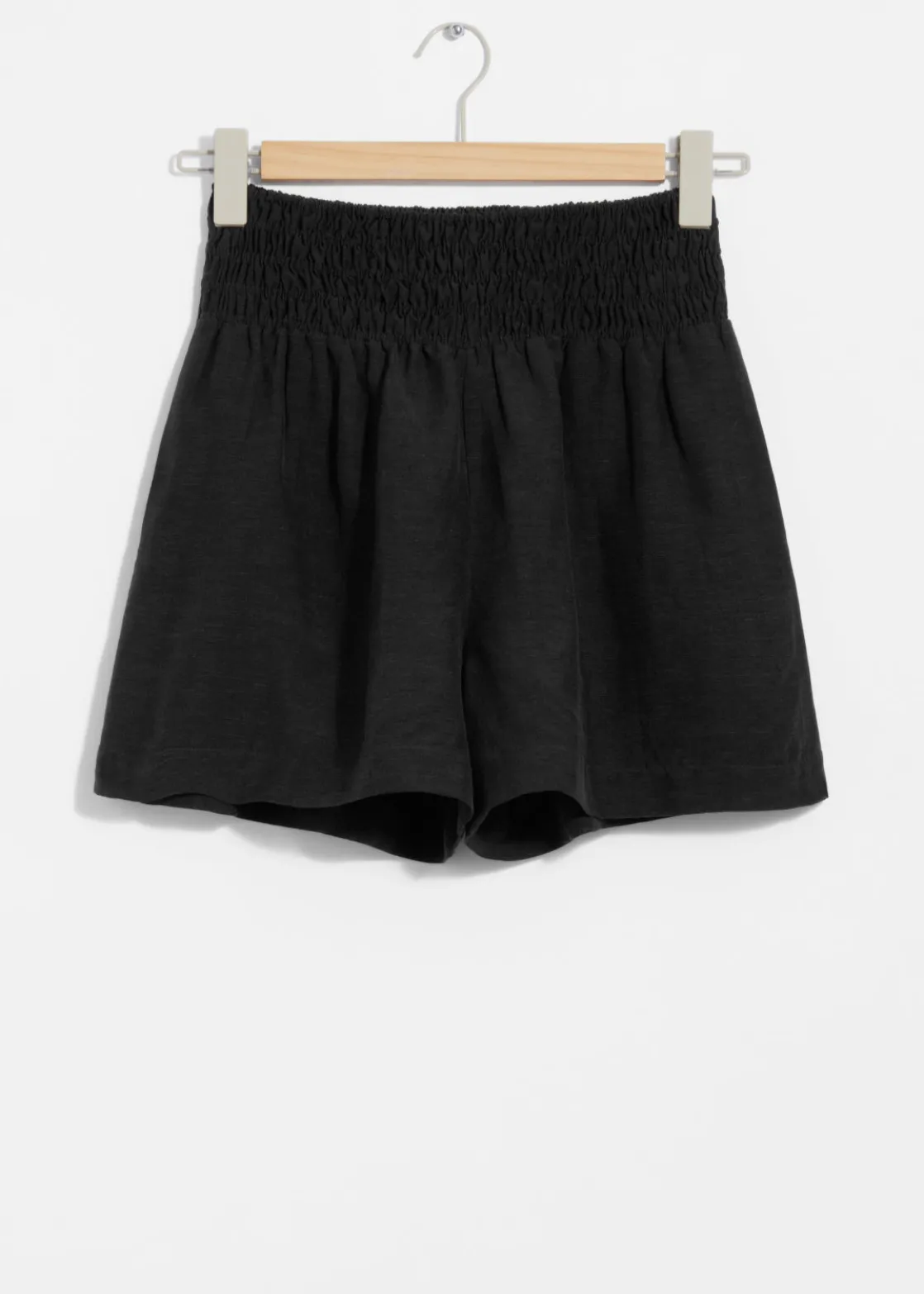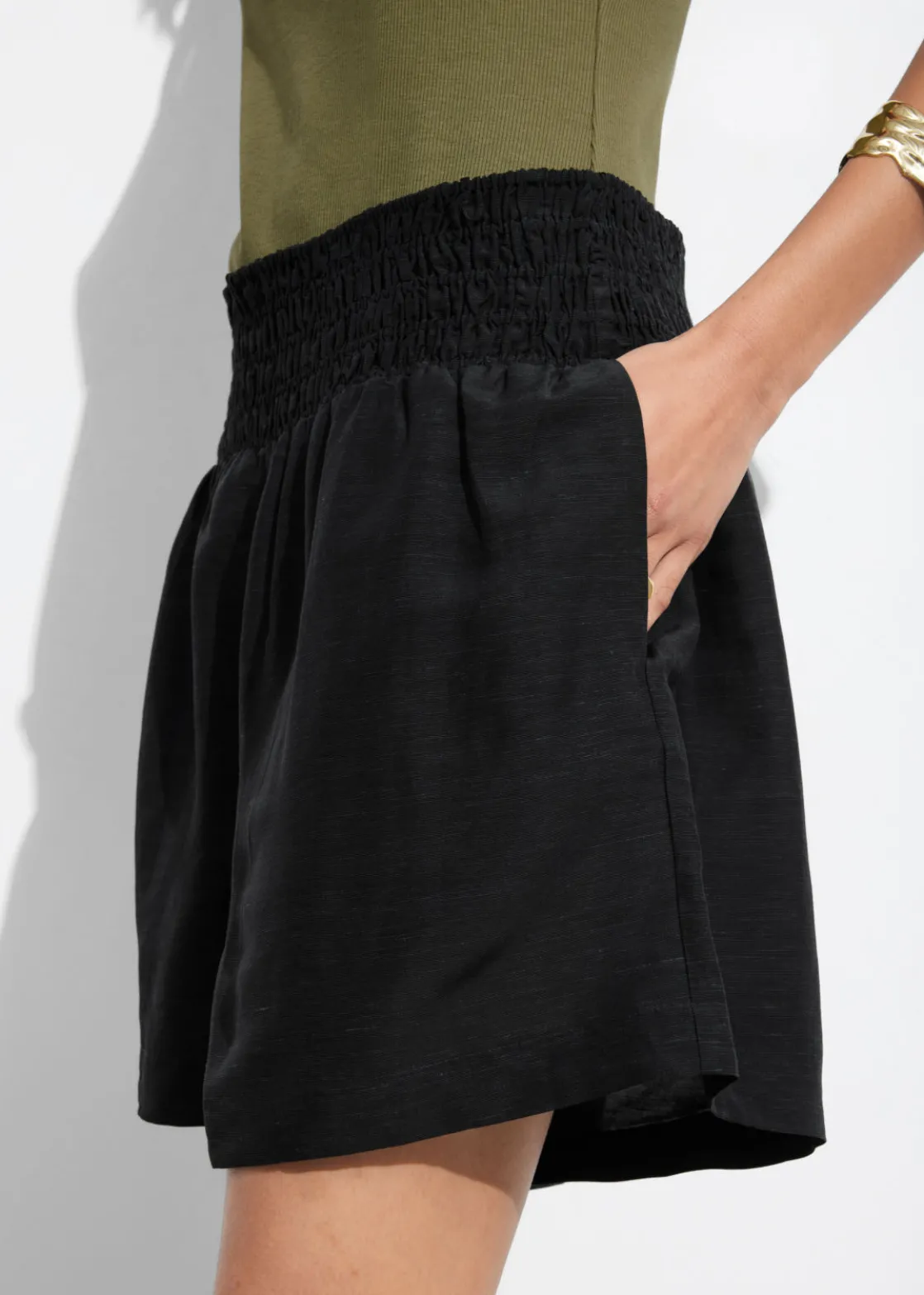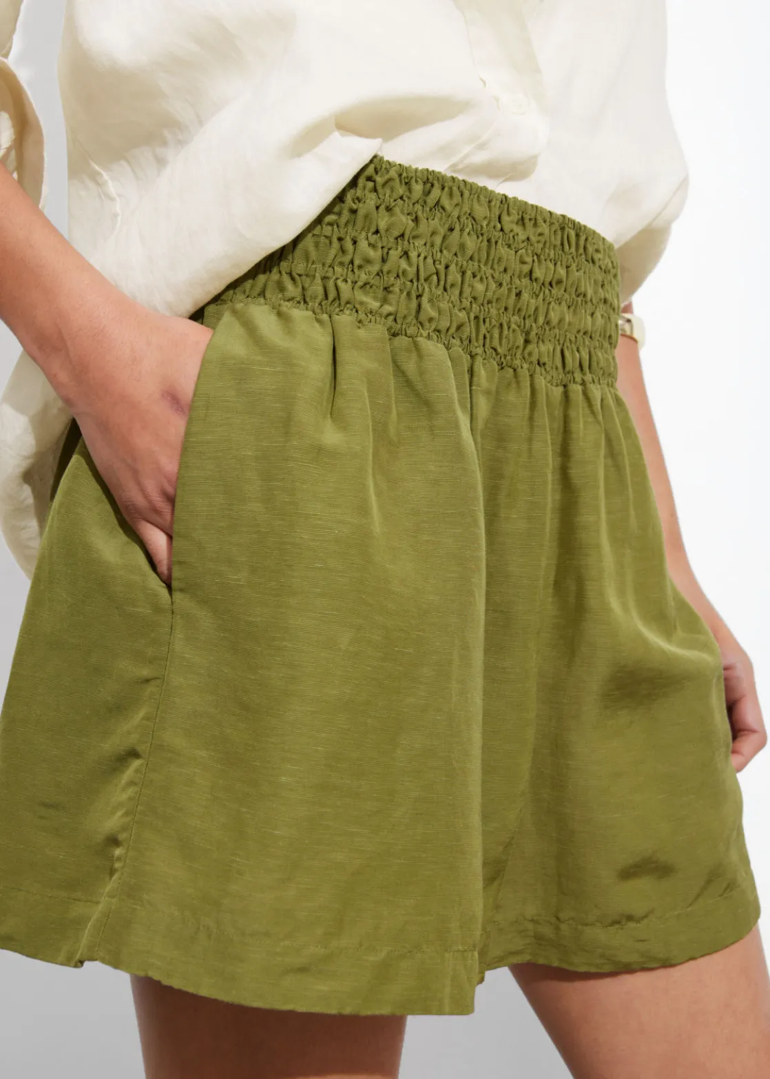 High-waist shorts featuring a wide, smocked waistband. Finished with duo side pockets.