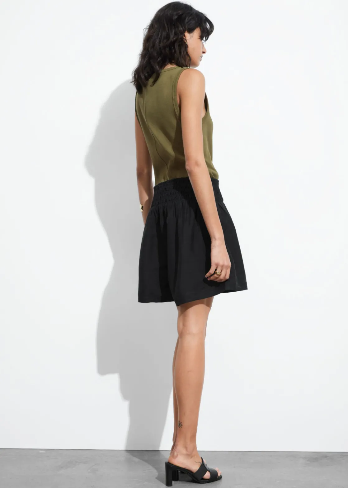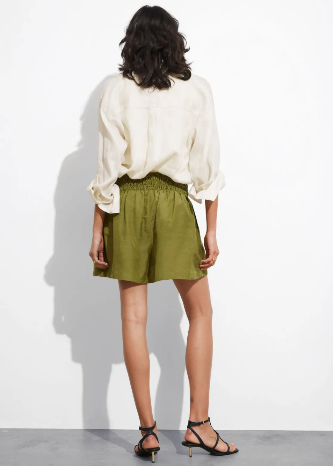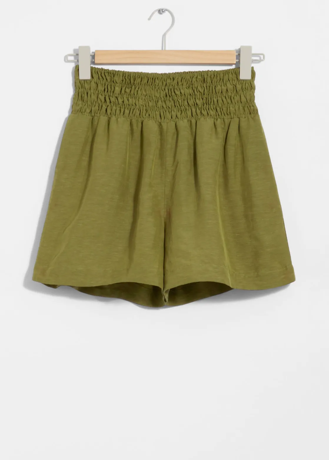 High-waist shorts featuring a wide, smocked waistband. Finished with duo side pockets.