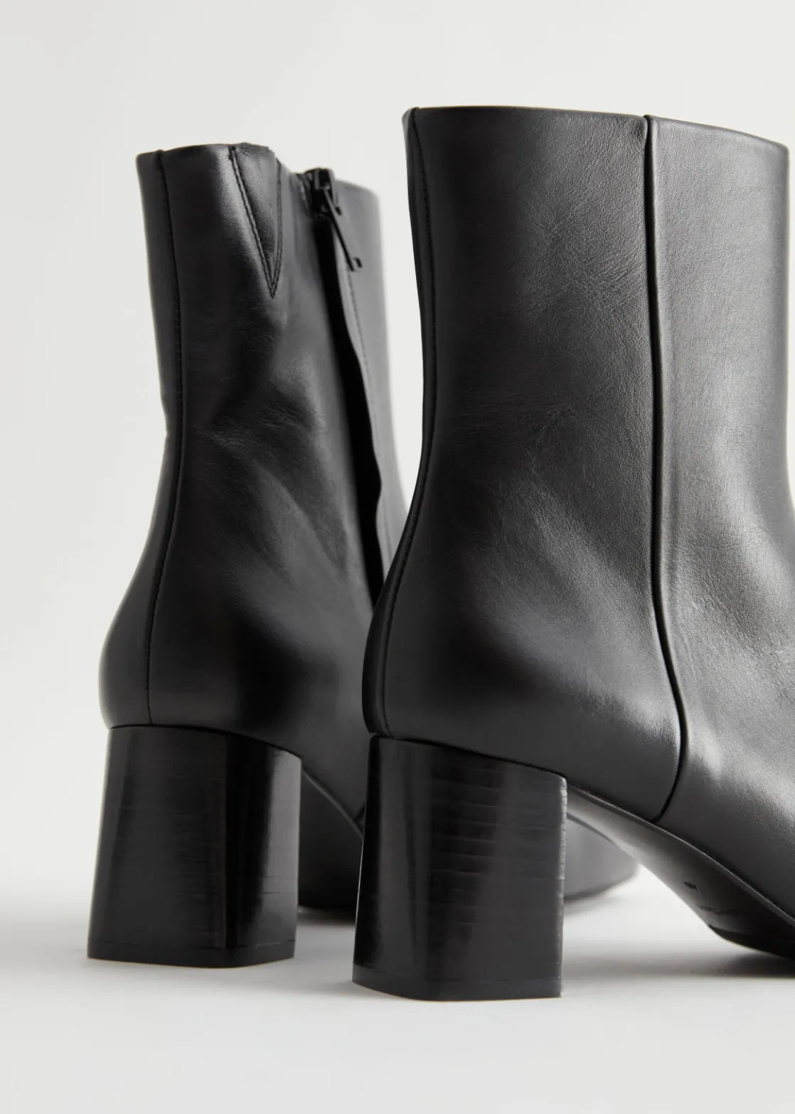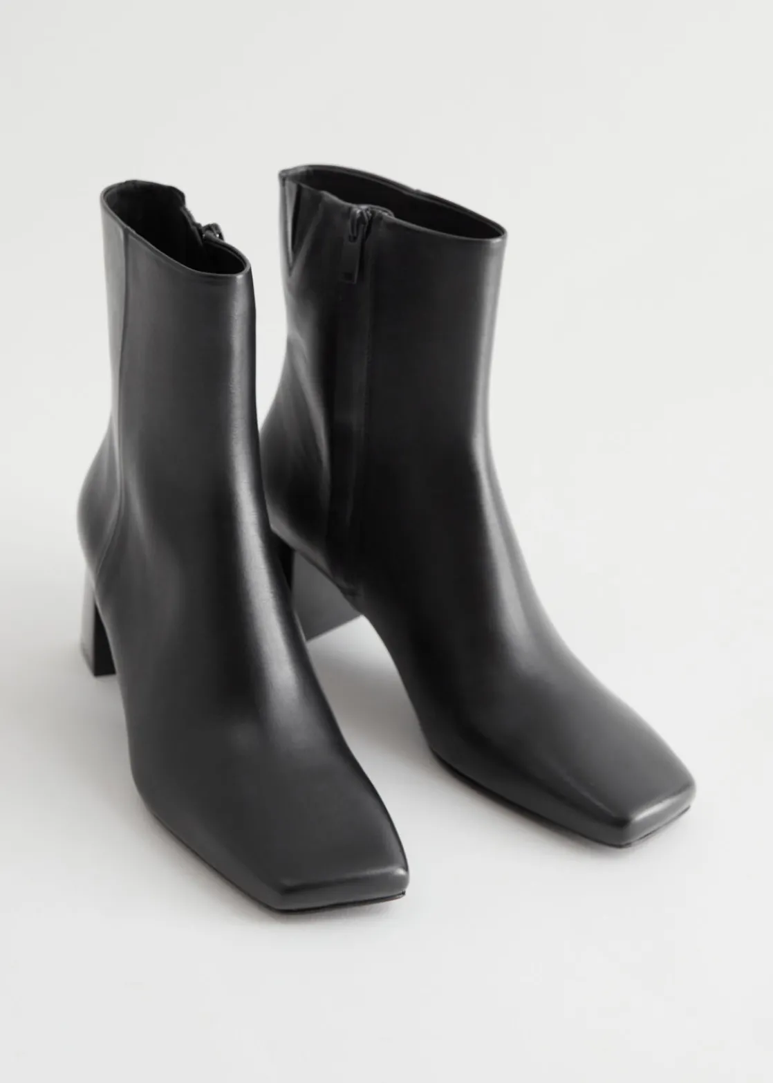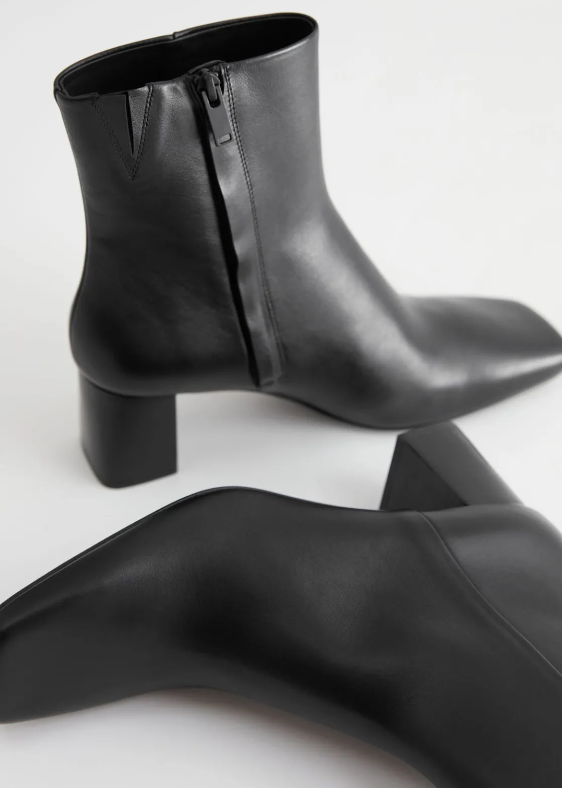 Squared-toe ankle boots made from smooth leather, chunky block heels and concealed side zippers.