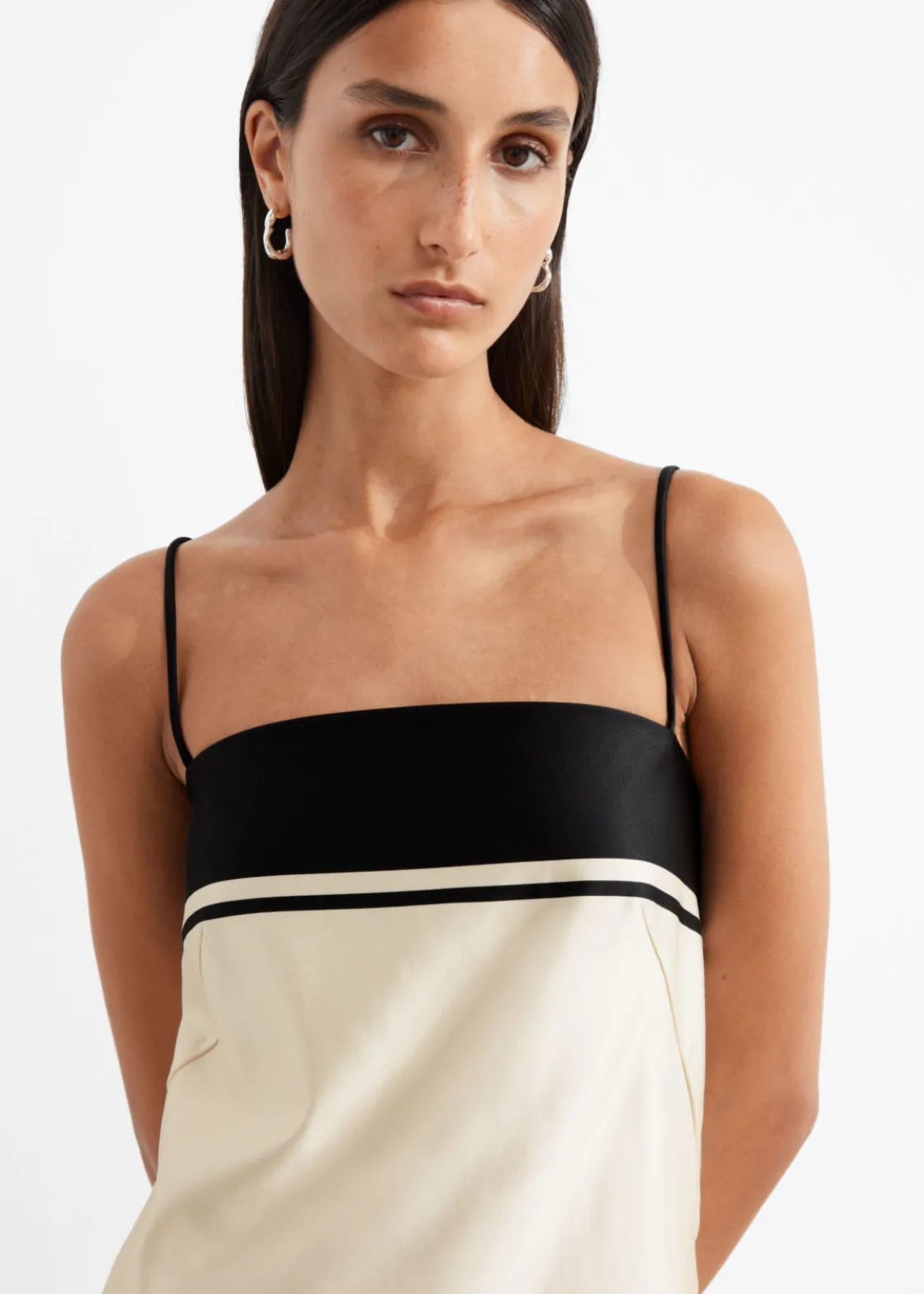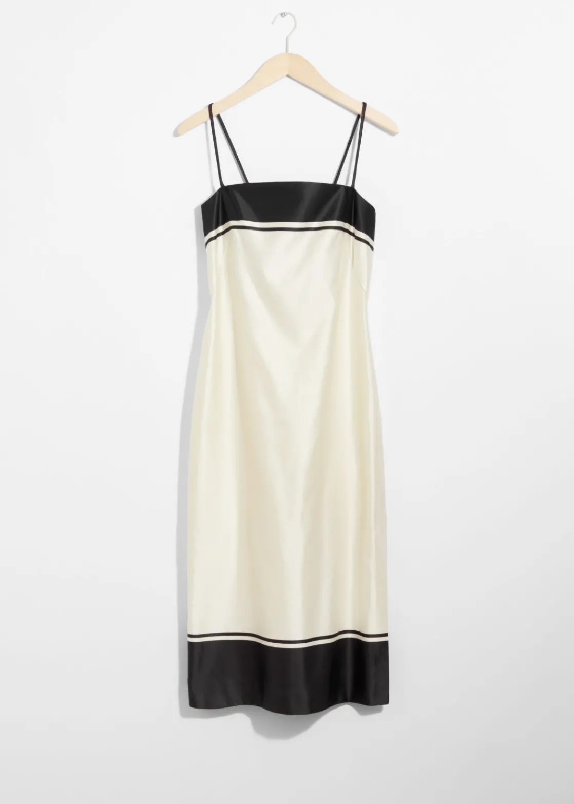 Satin midi dress featuring thin shoulder straps and a square neckline. Fastened with a zipper at the back.