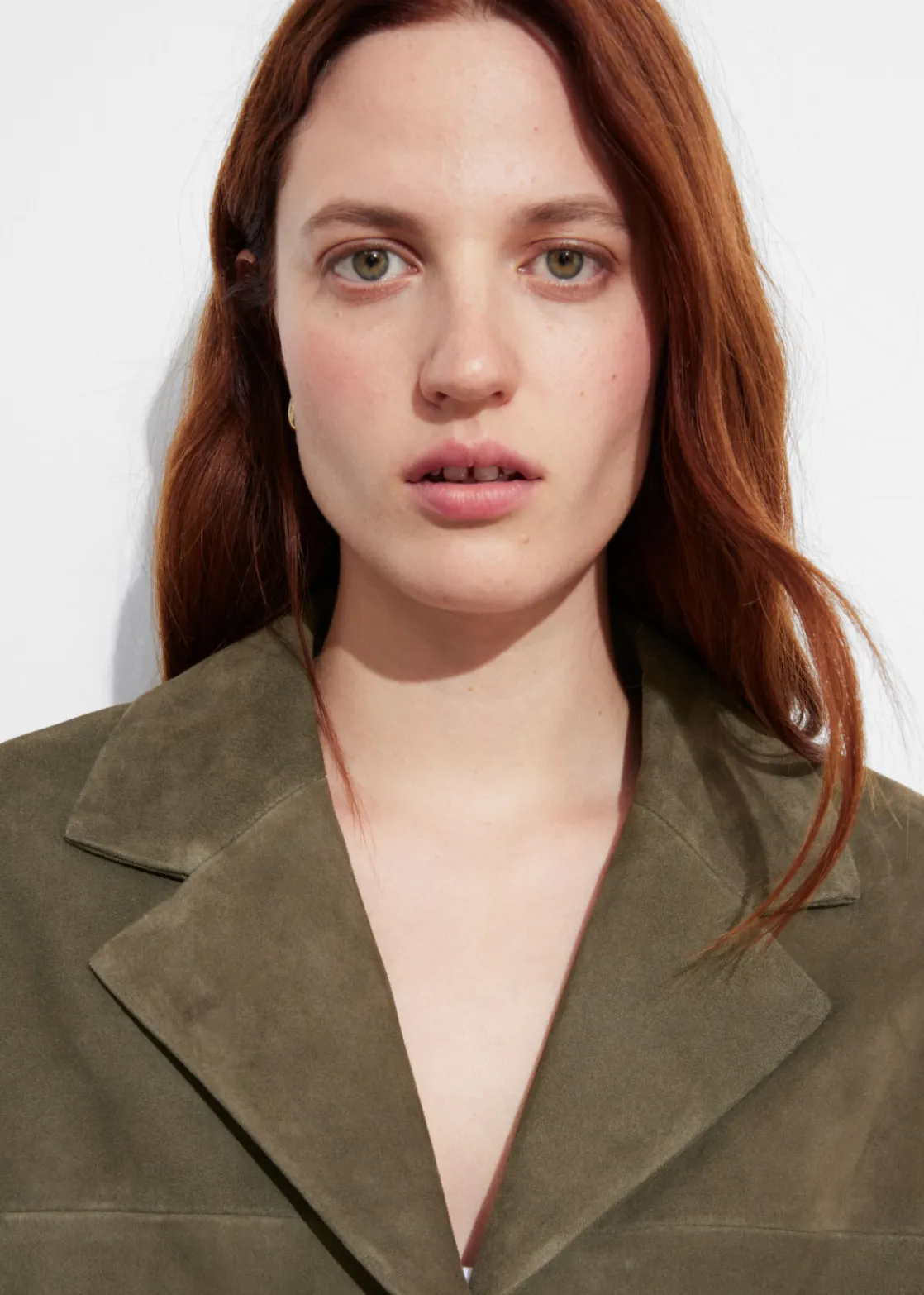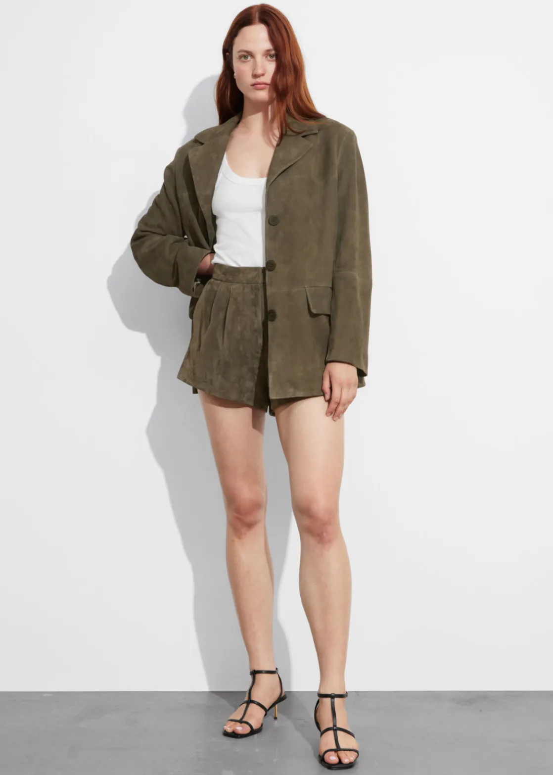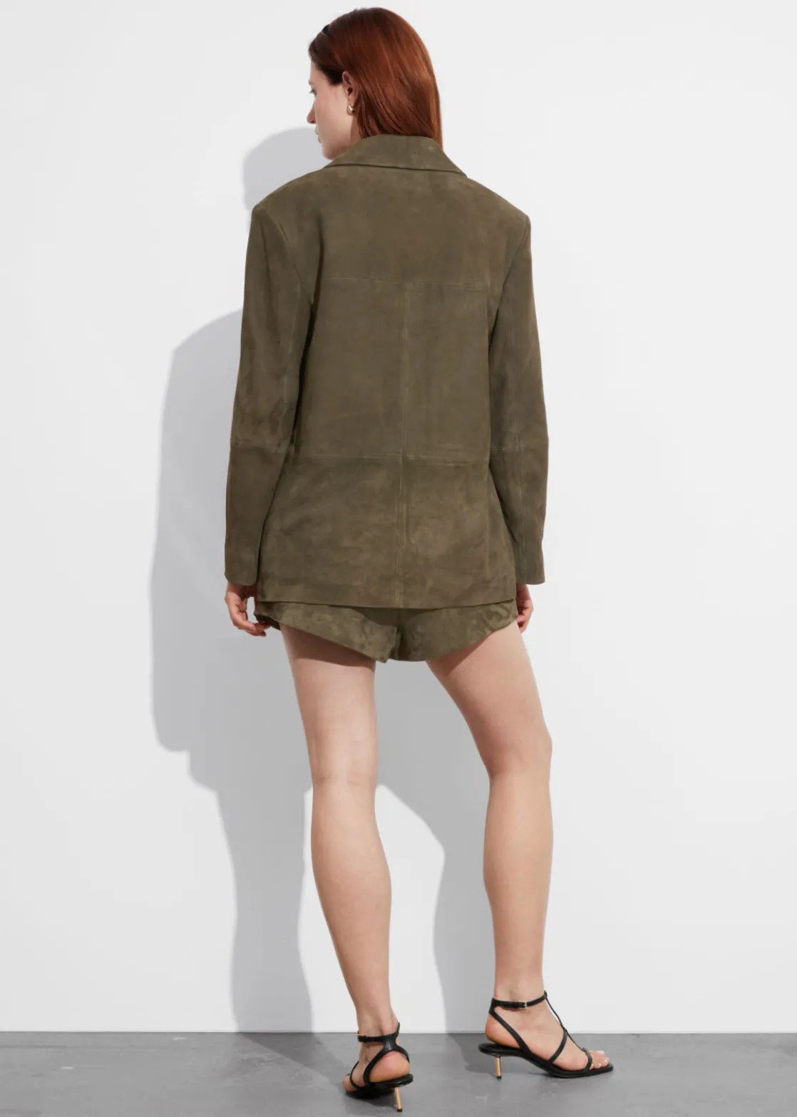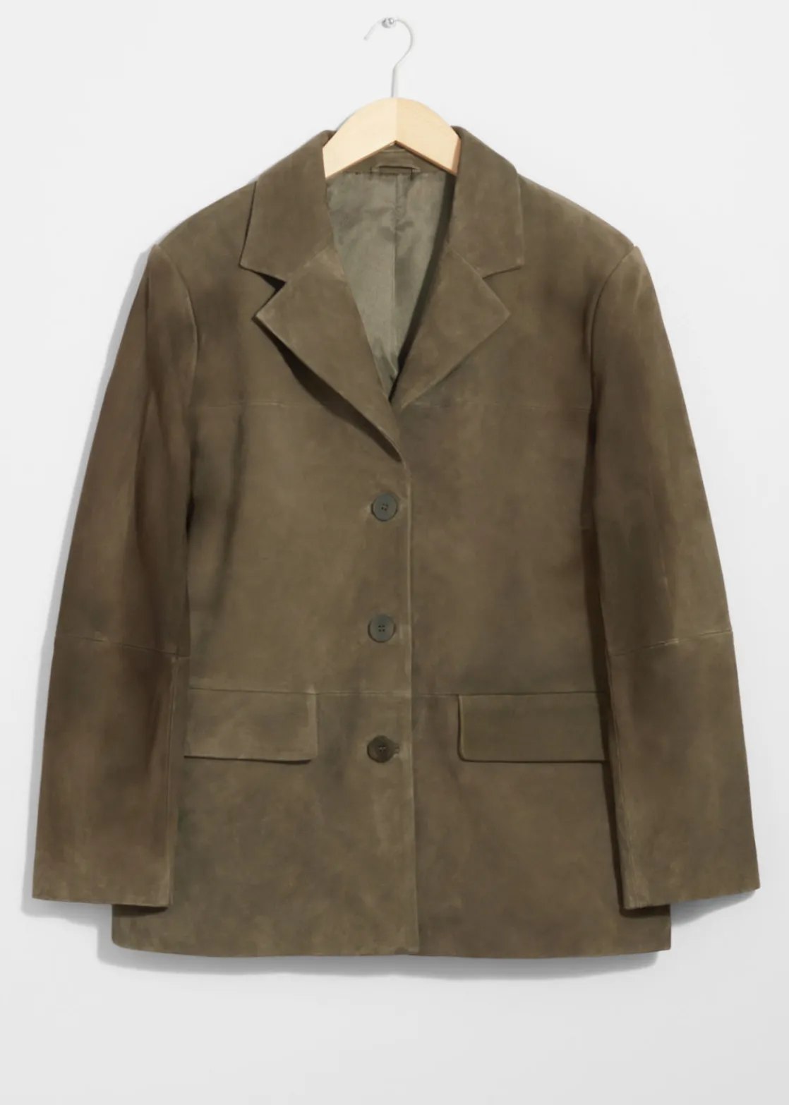 Single-breasted blazer crafted from suede. Finished with padded shoulders.