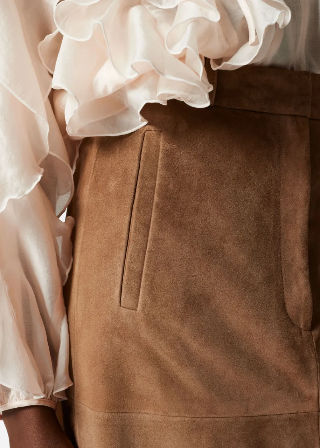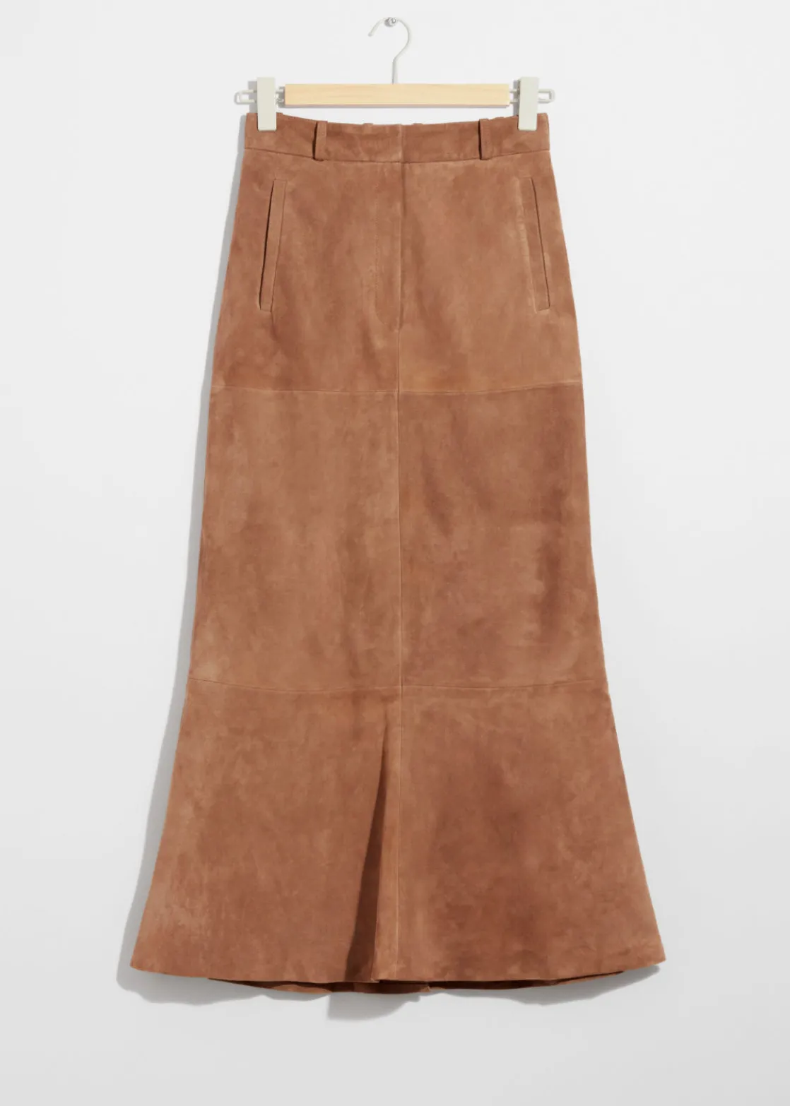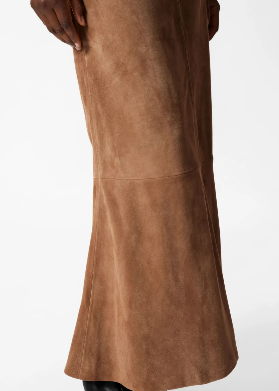 Suede midi skirt featuring a high waist and a flared silhouette.