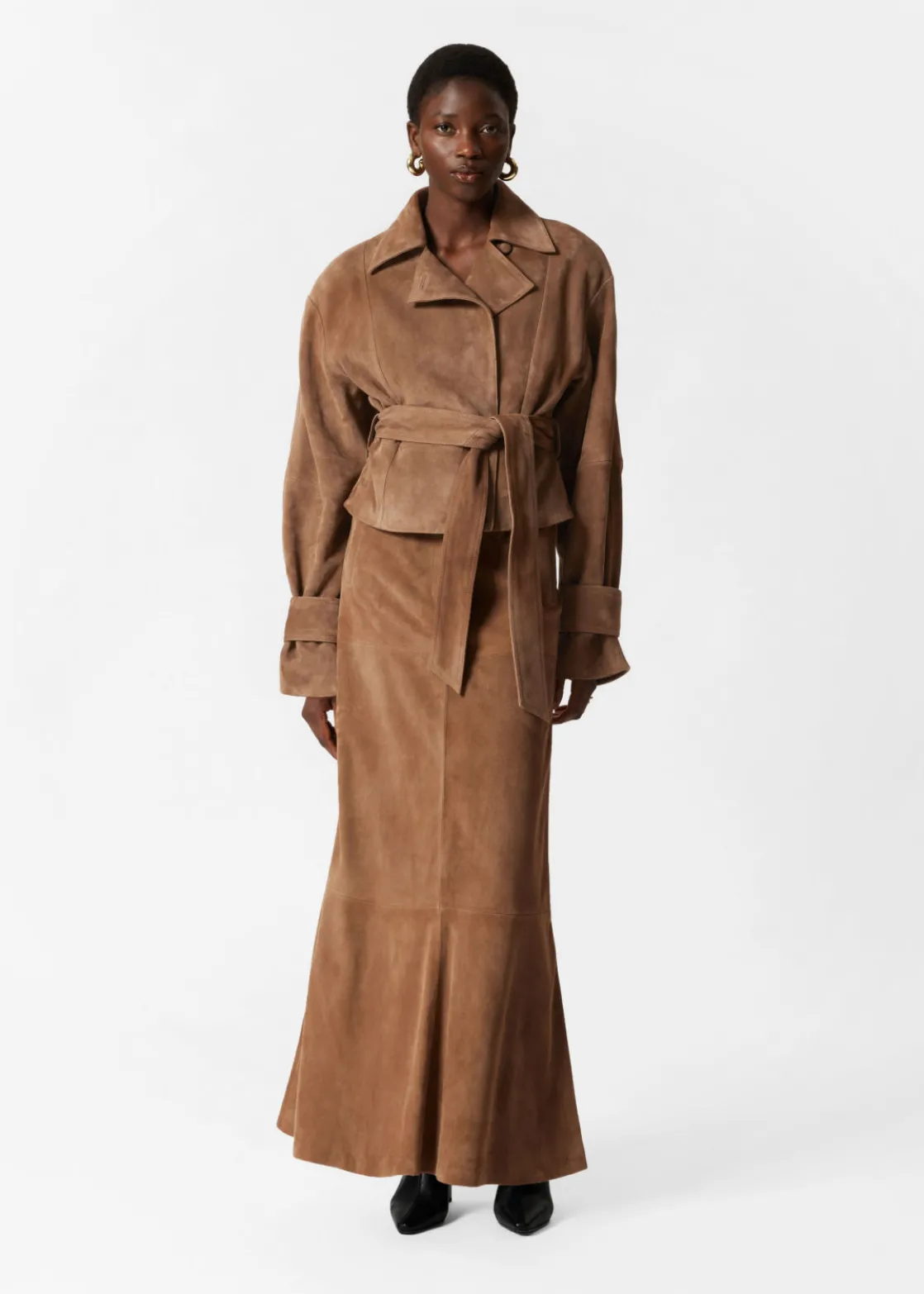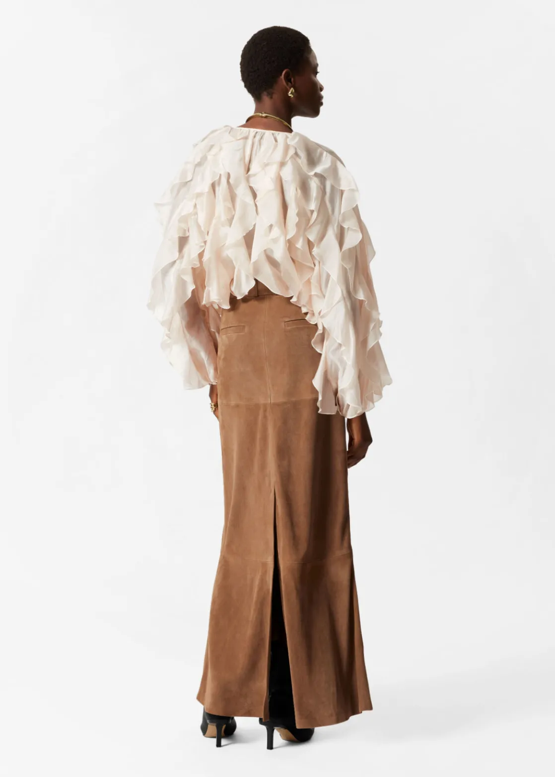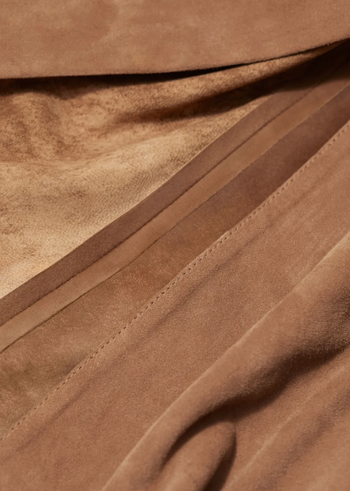 Suede midi skirt featuring a high waist and a flared silhouette.