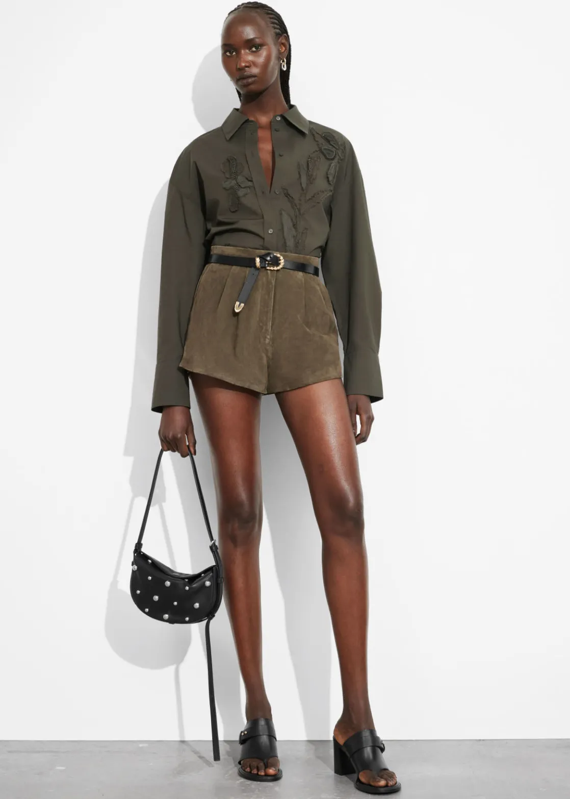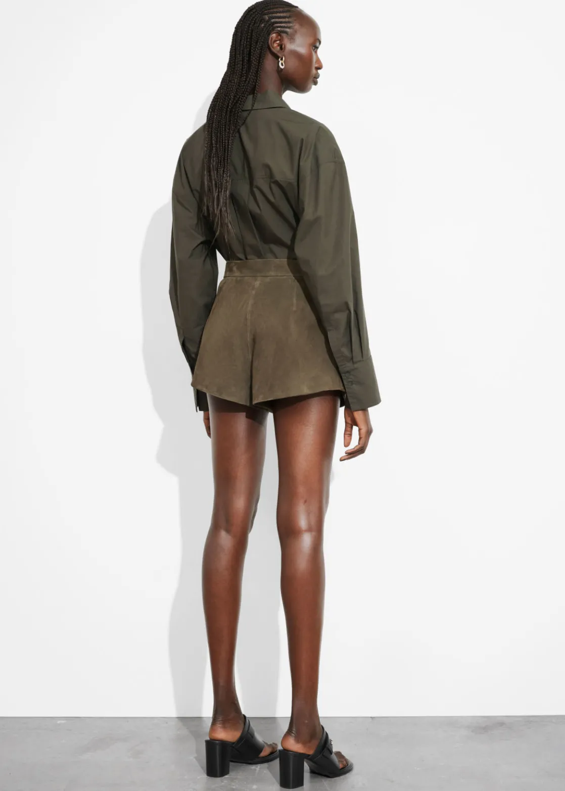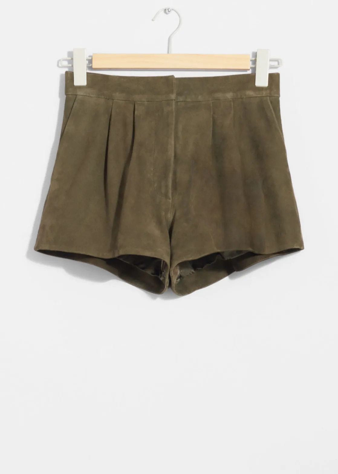 High-waist suede shorts featuring duo pockets. Secured with a zip fly and a hook and bar closure.
