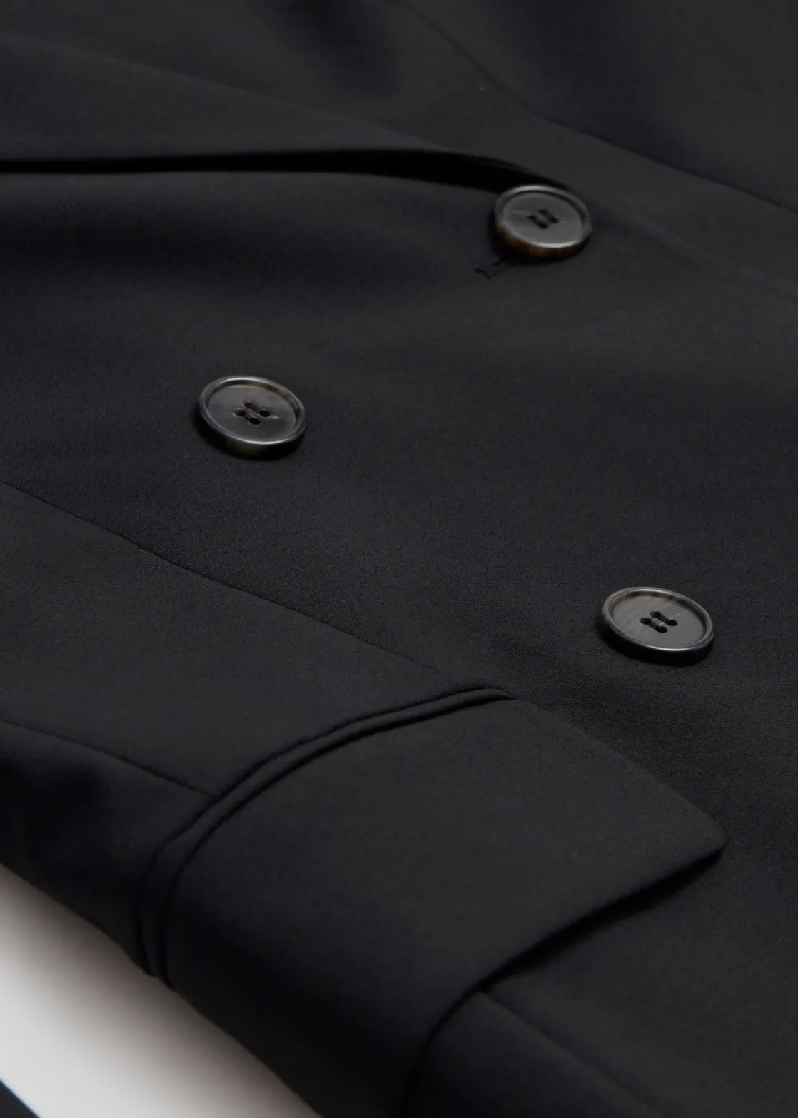 Double-breasted blazer with a tailored, fitted silhouette finished with padded shoulders.