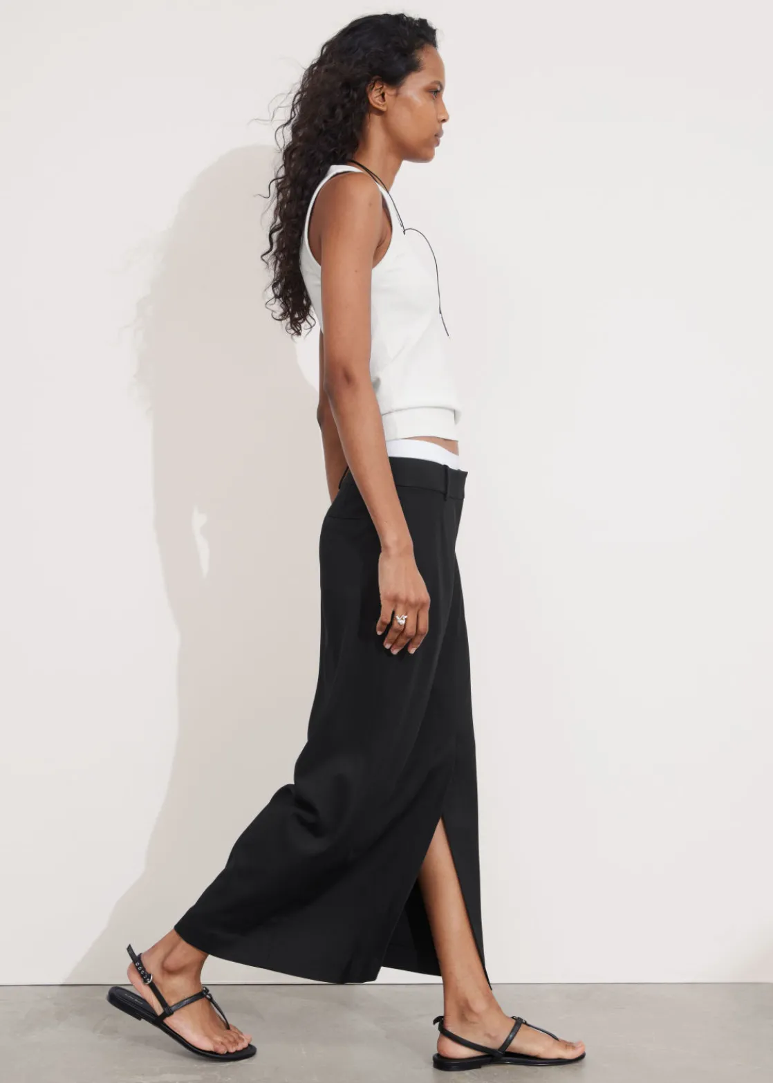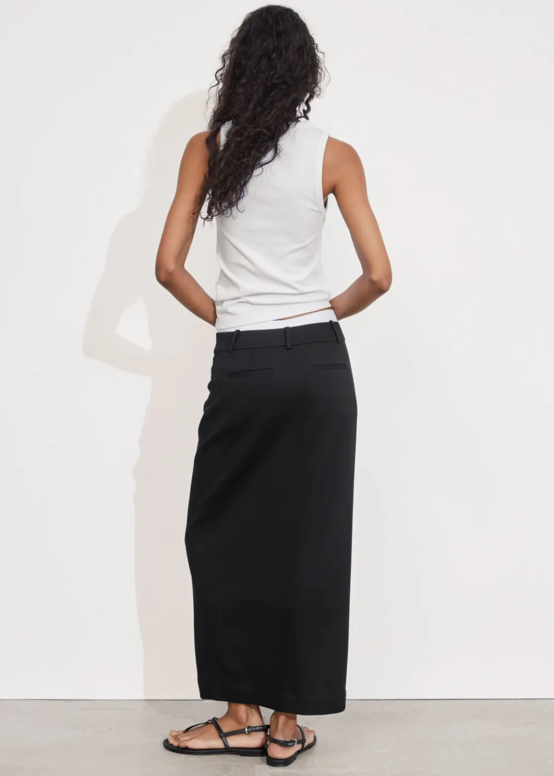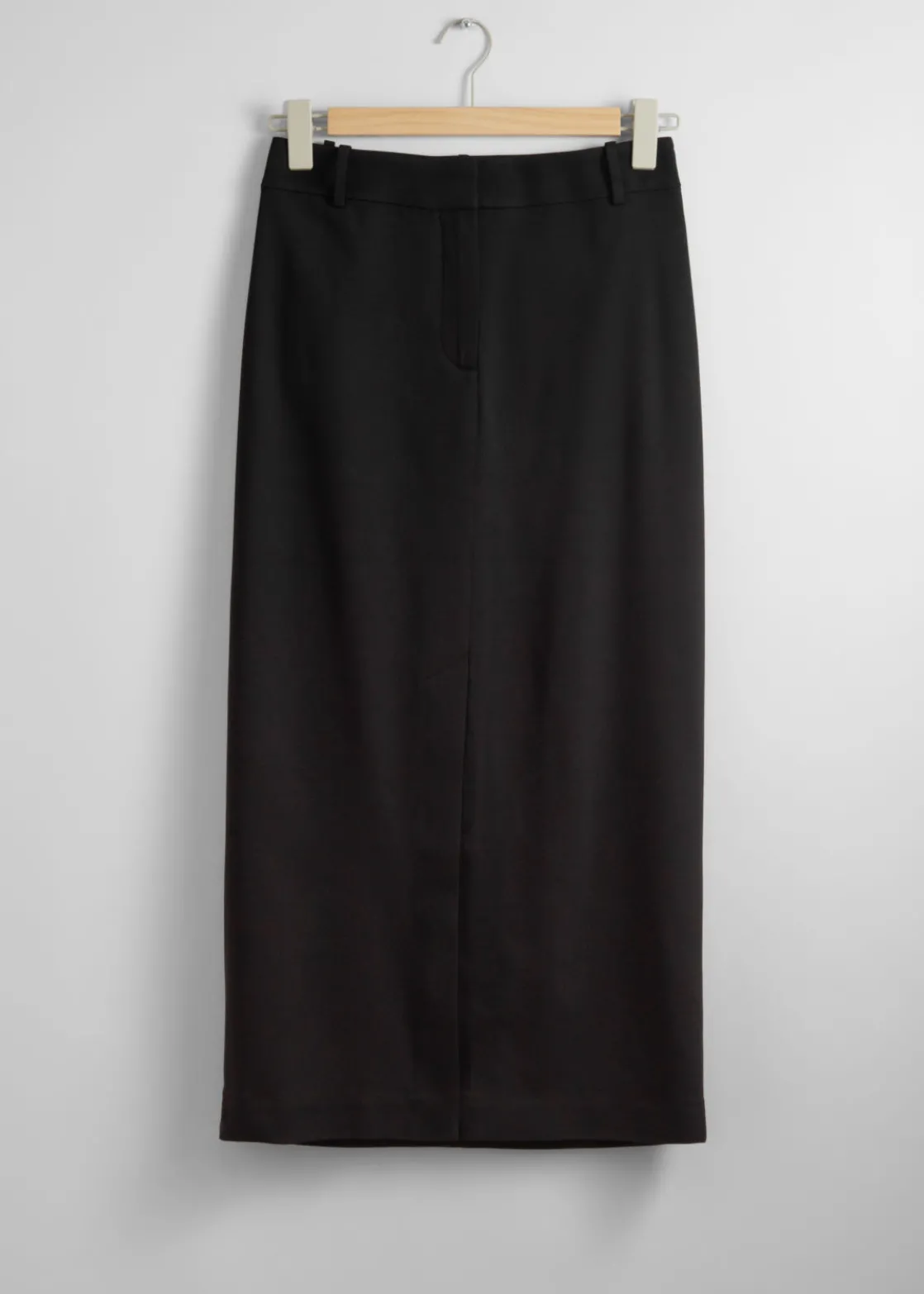 Tailored pencil midi skirt detailed with belt loops and duo welt pockets at the back.