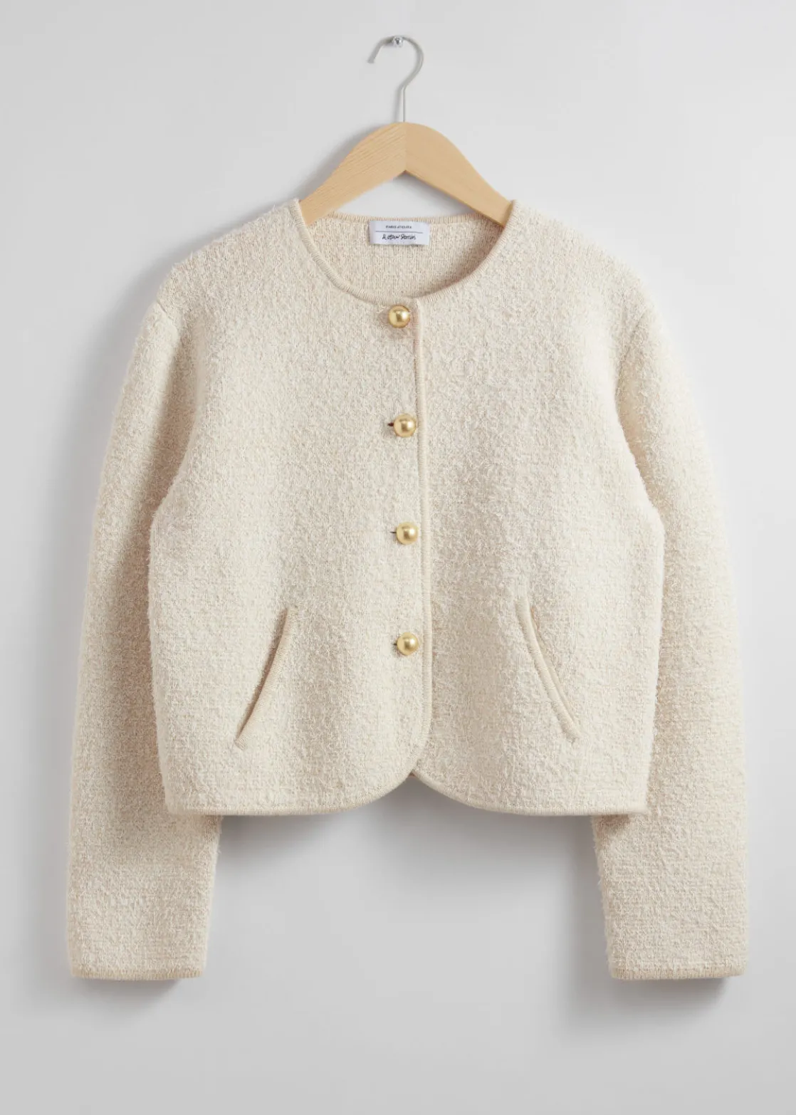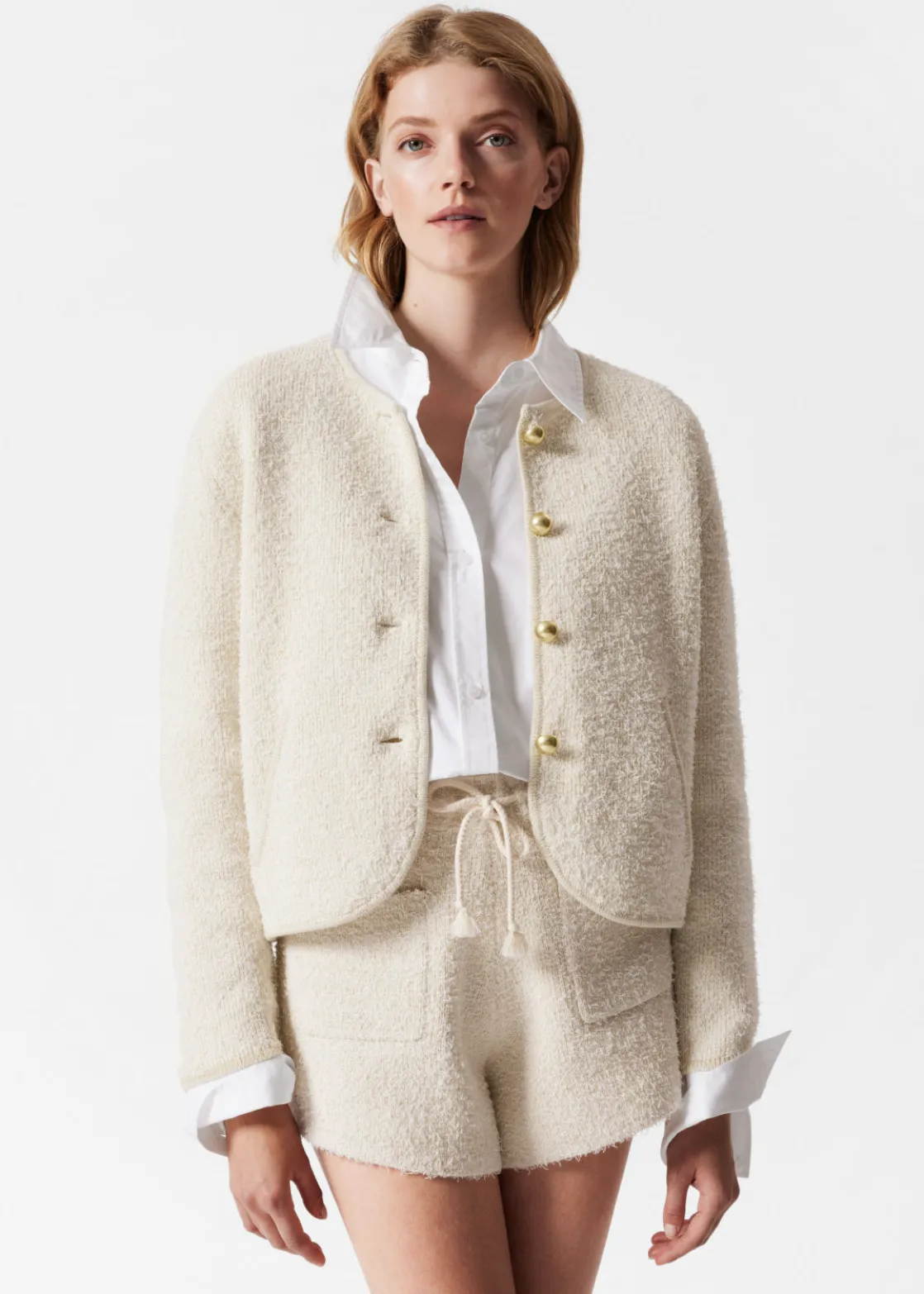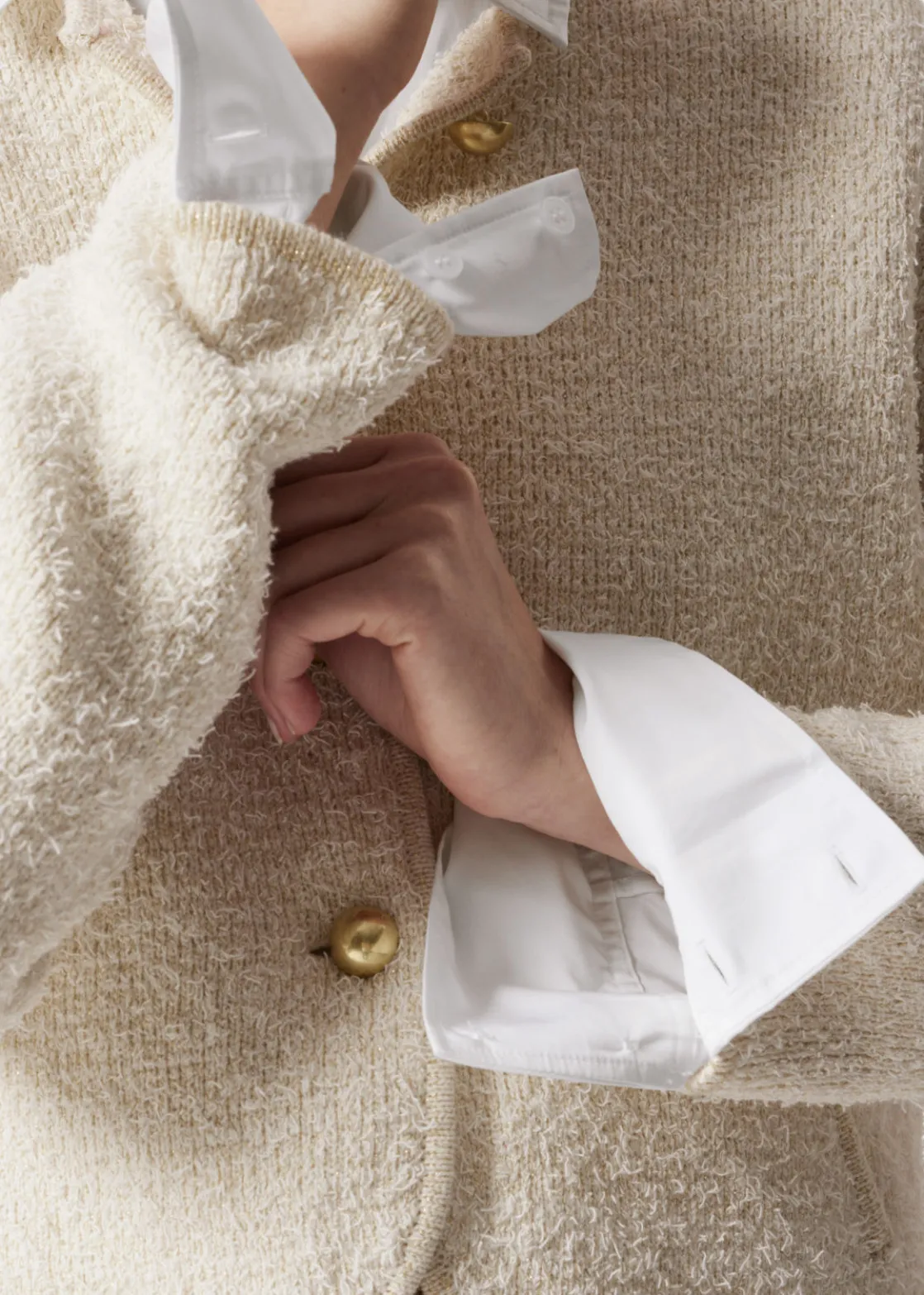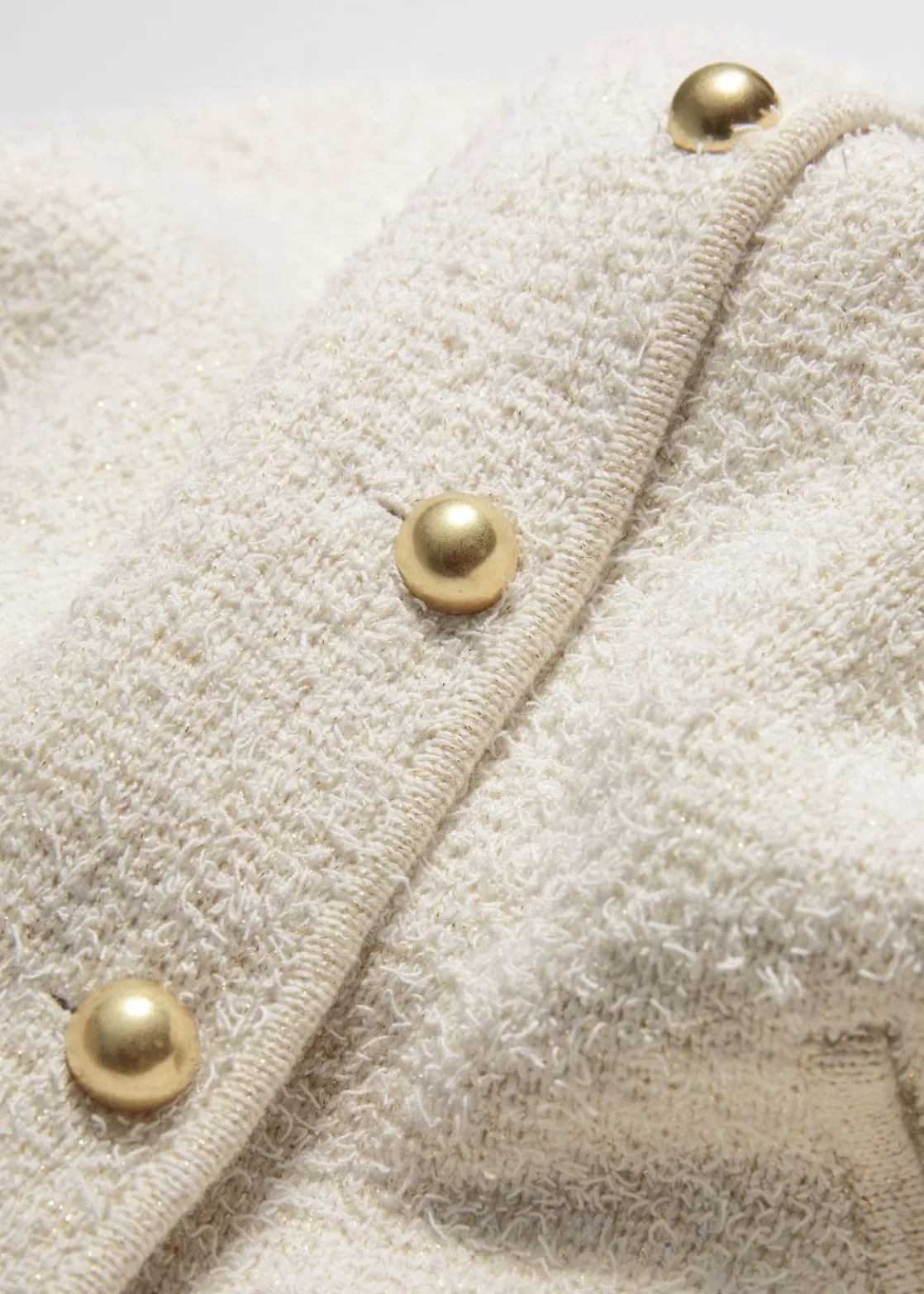 Cropped long-sleeve cardigan featuring a textured finish flecked with glittery lurex threads.