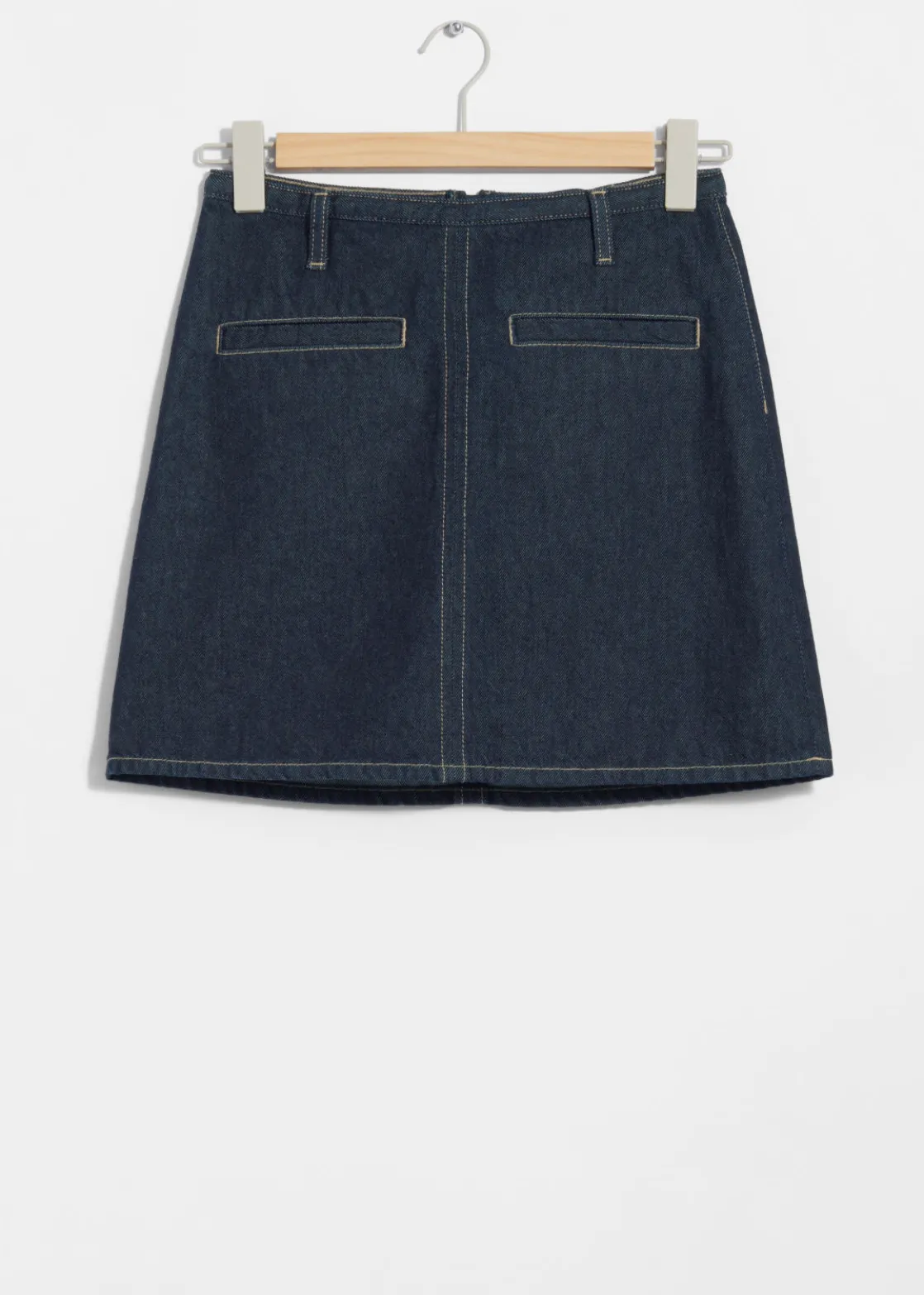 Denim mini skirt detailed duo welt pockets at the front, belt loops and topstitched detailing. Fastened with a zipper at the back.