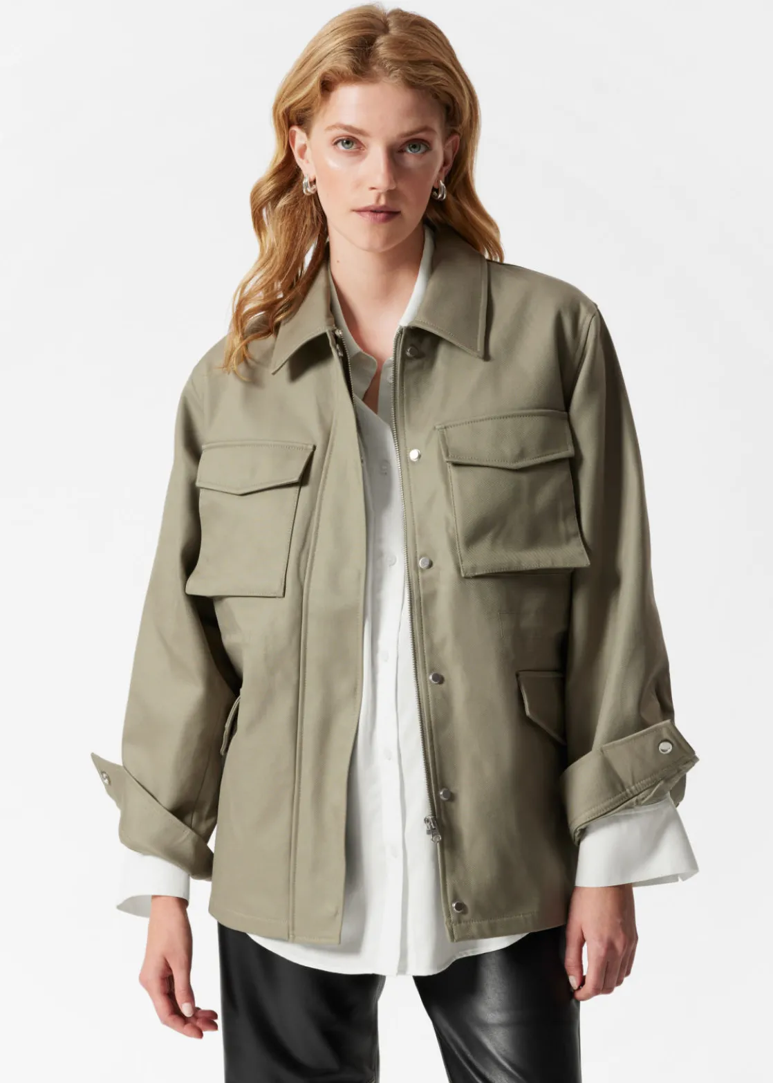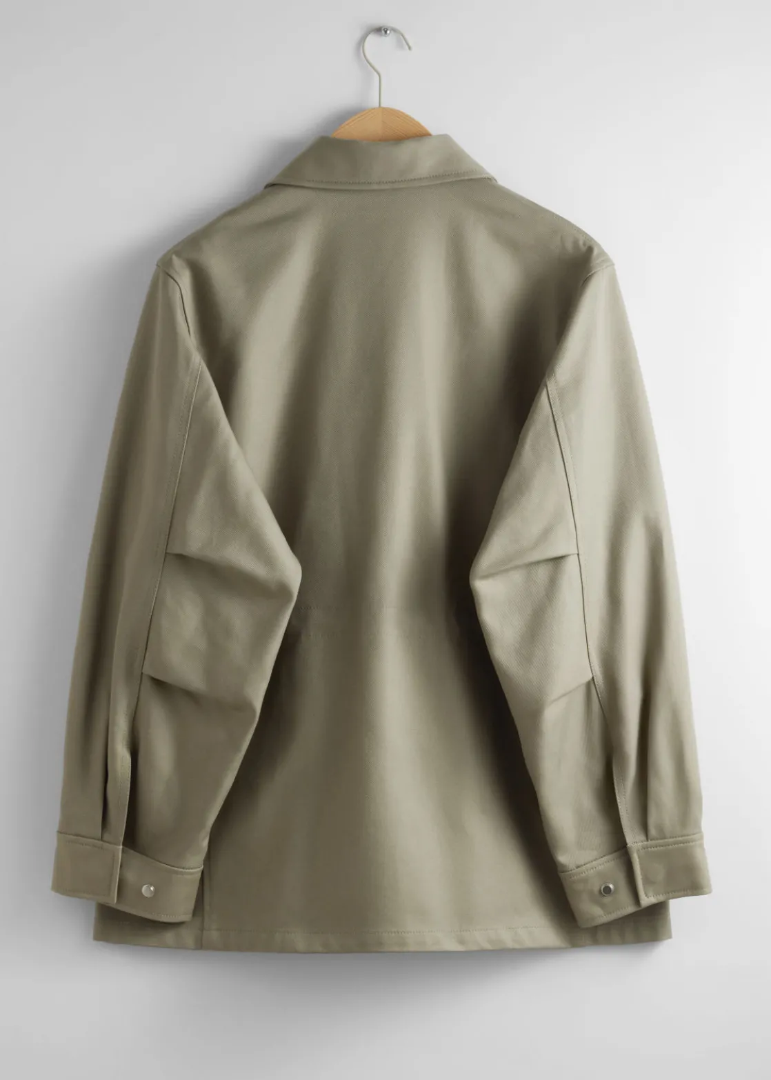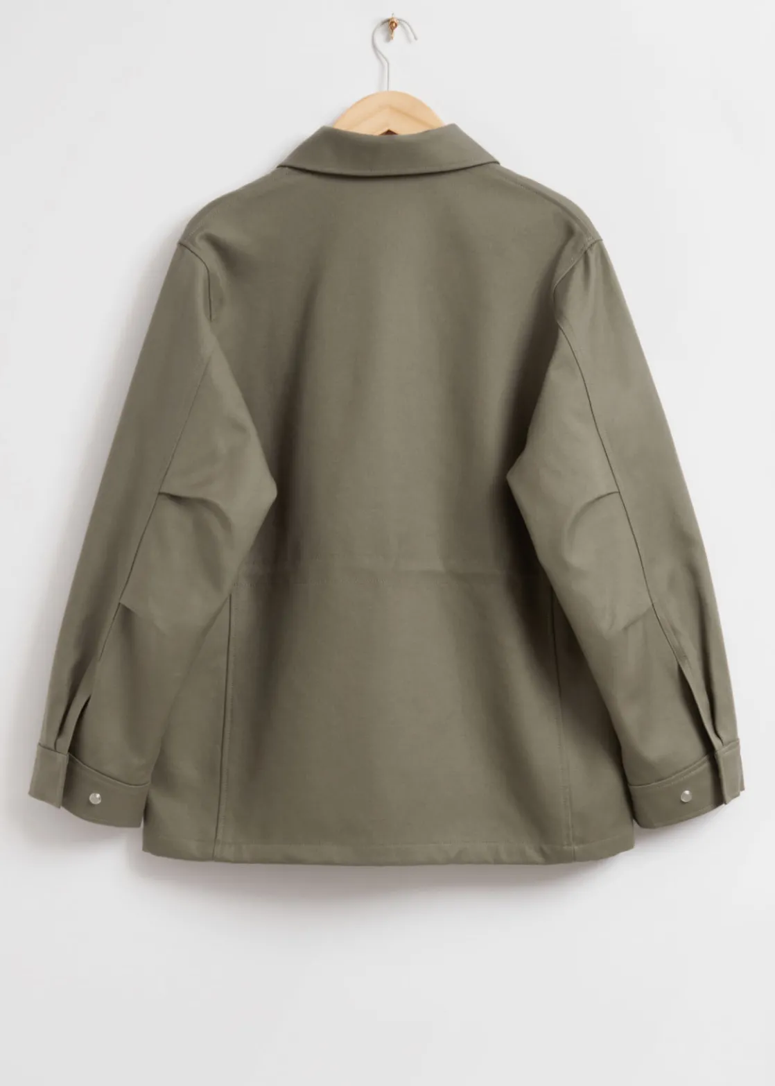 Utility jacket featuring duo chest patch pockets, duo front flap pockets and a drawstring waist.