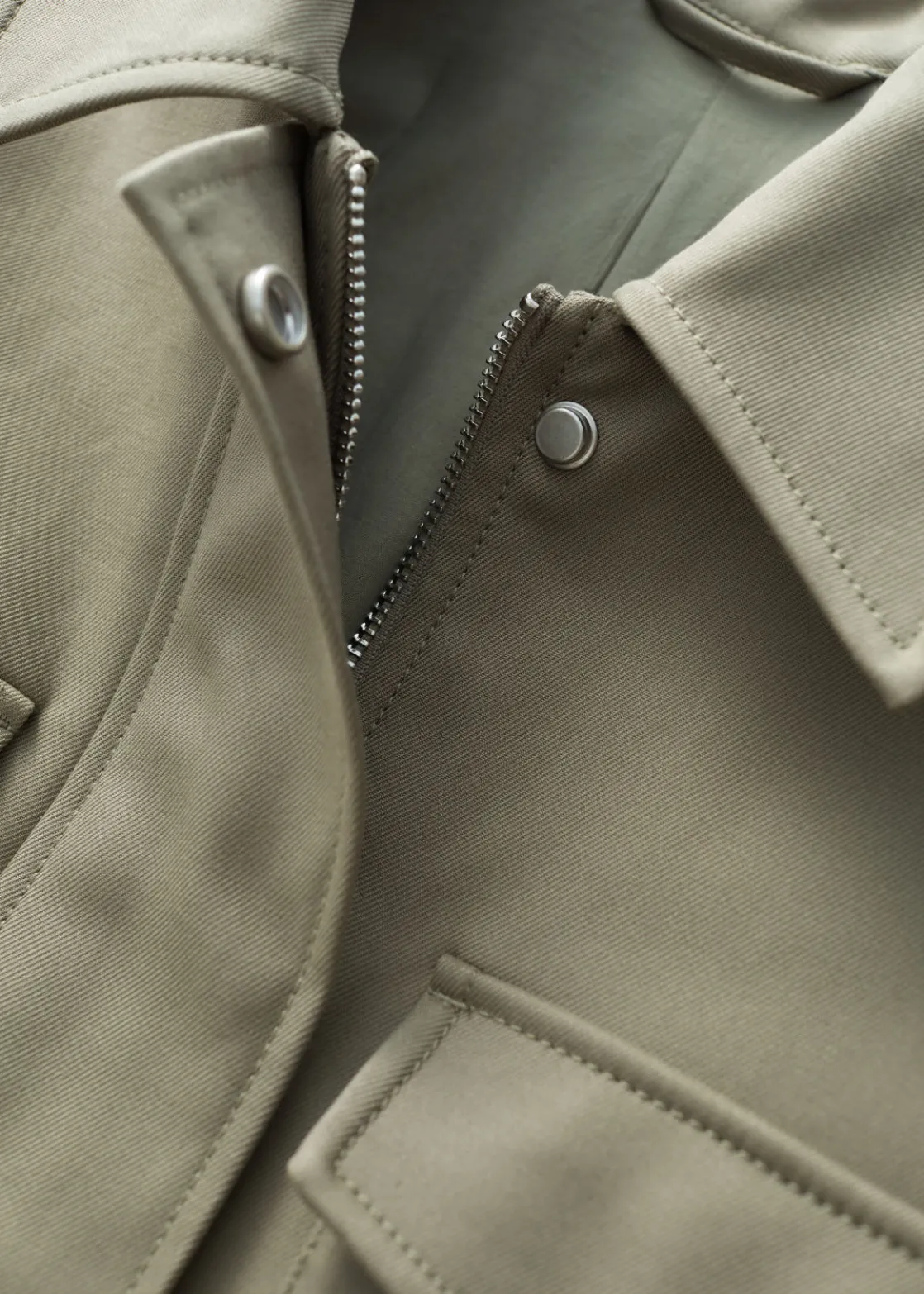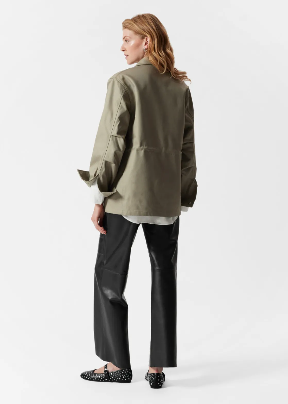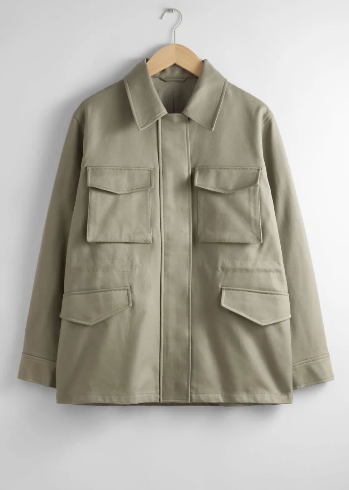 Utility jacket featuring duo chest patch pockets, duo front flap pockets and a drawstring waist.