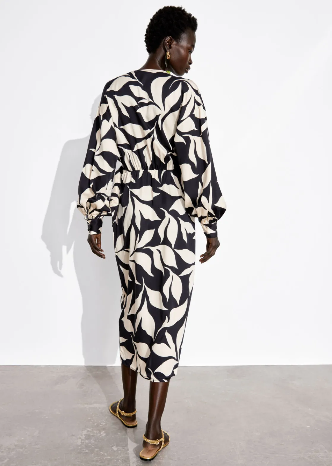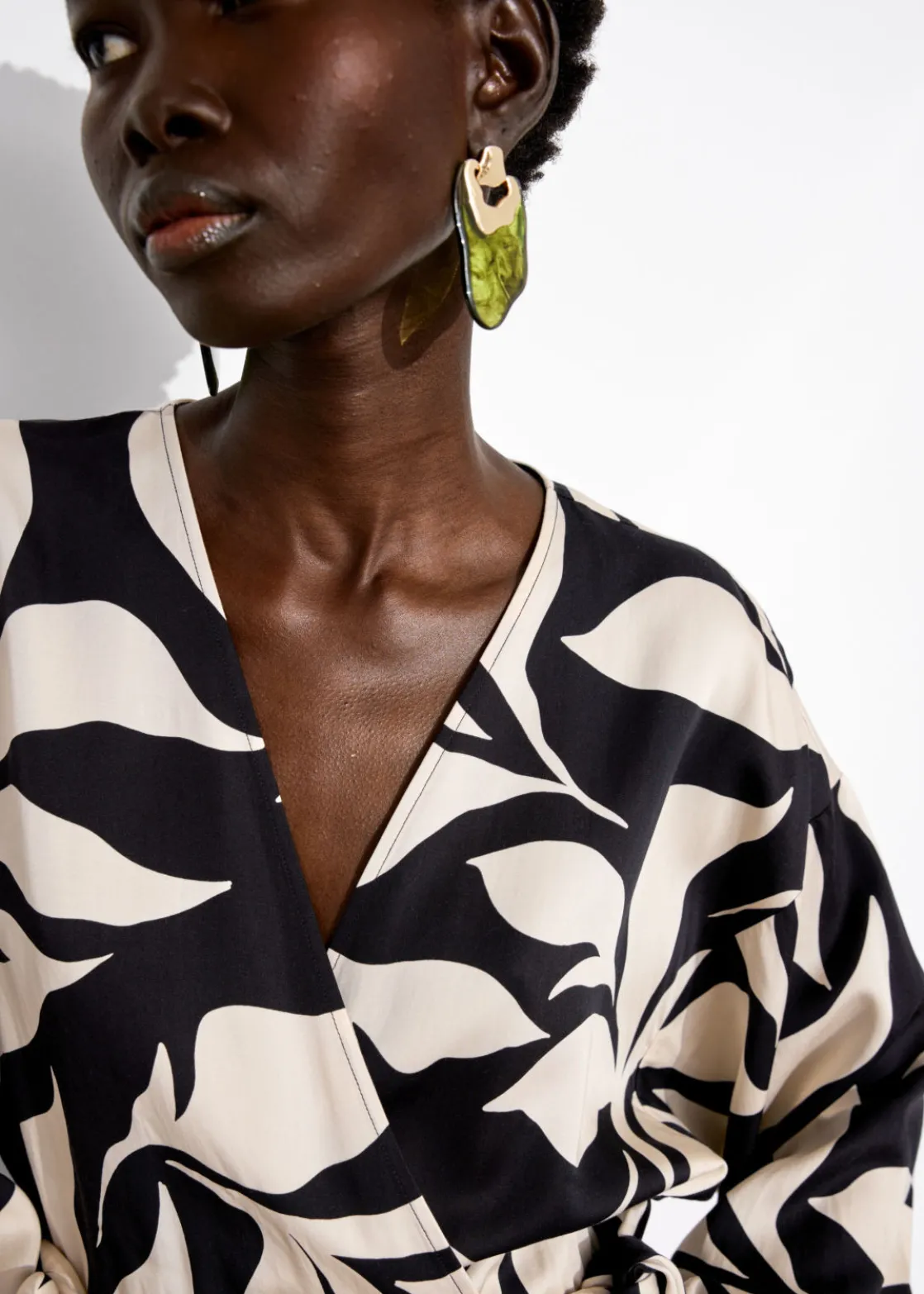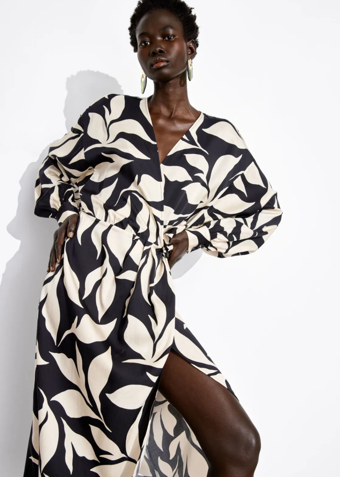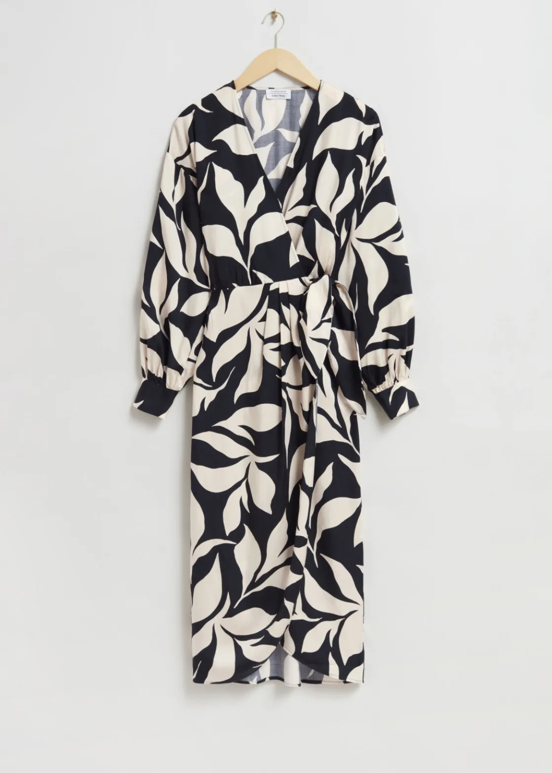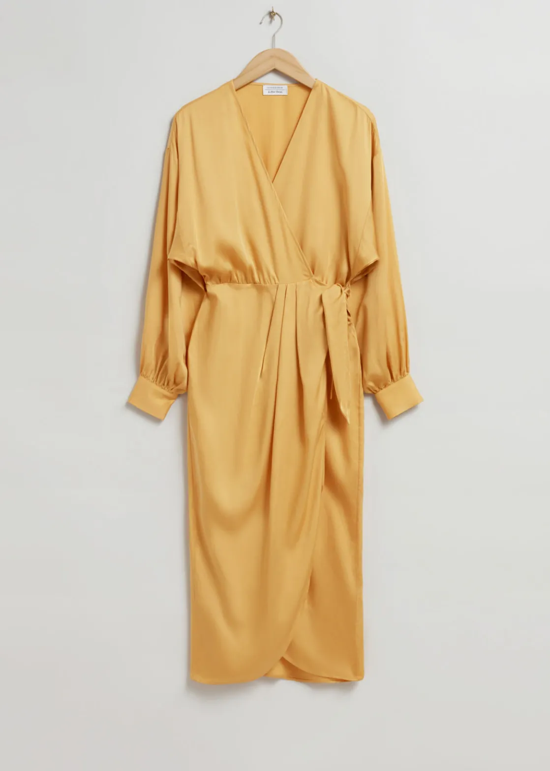 V-neck wrap dress crafted from soft, silky textured fabric. Designed with long voluminous blouson sleeves and an adjustable wrap-around waistline featuring a draped skirt with a rounded tulip hemline in a midi length cut.