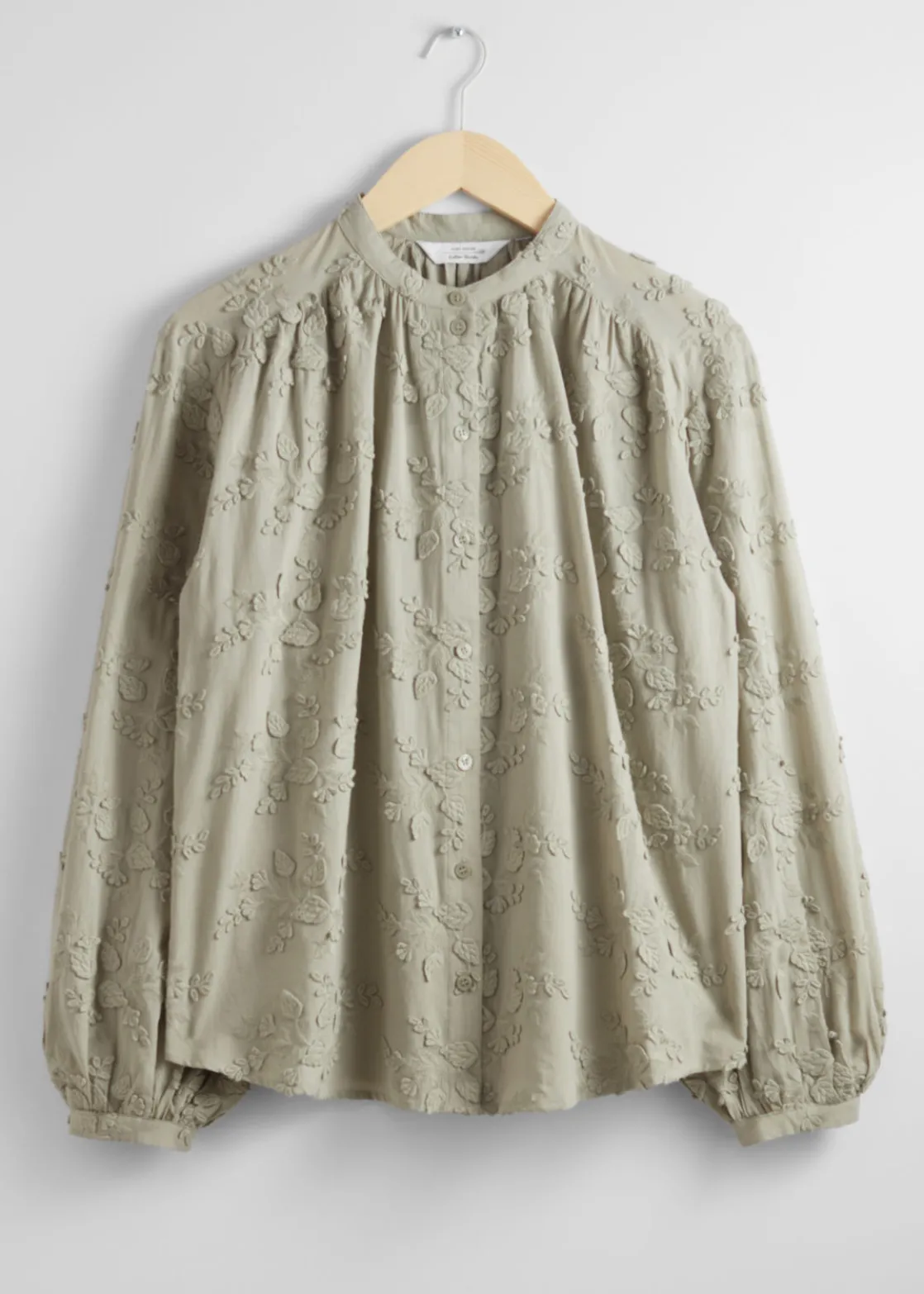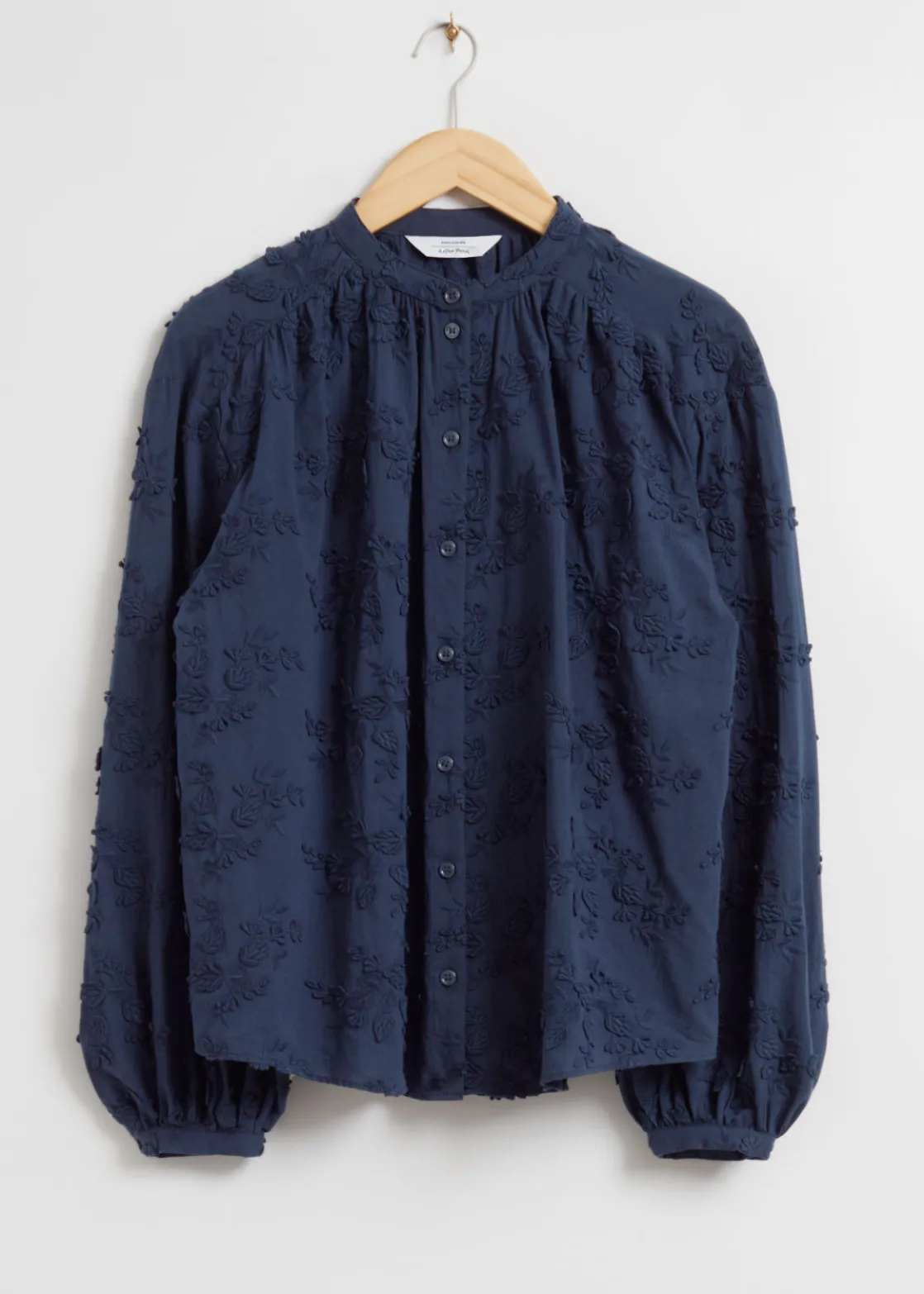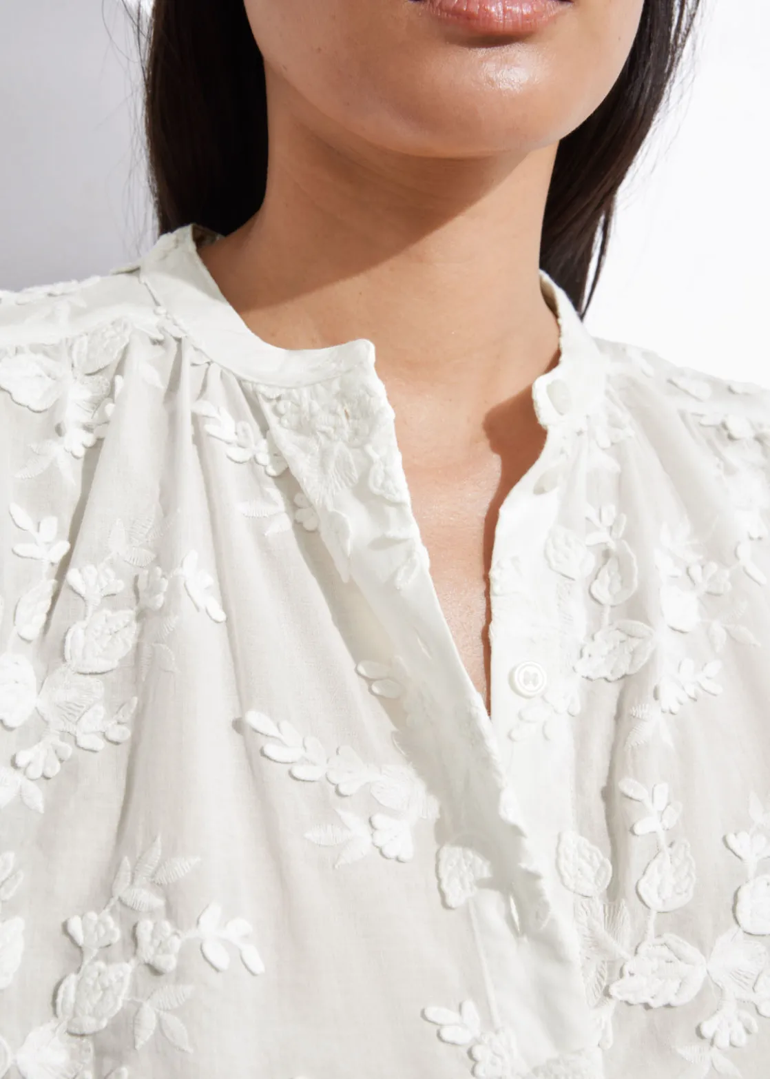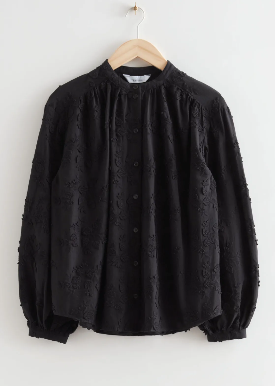 Voluminous blouse featuring a stand-up collar, floral appliqué detailing and long sleeves with gathered cuffs.