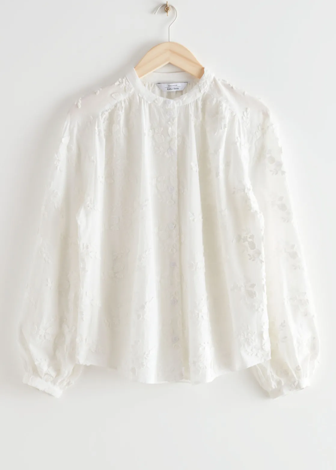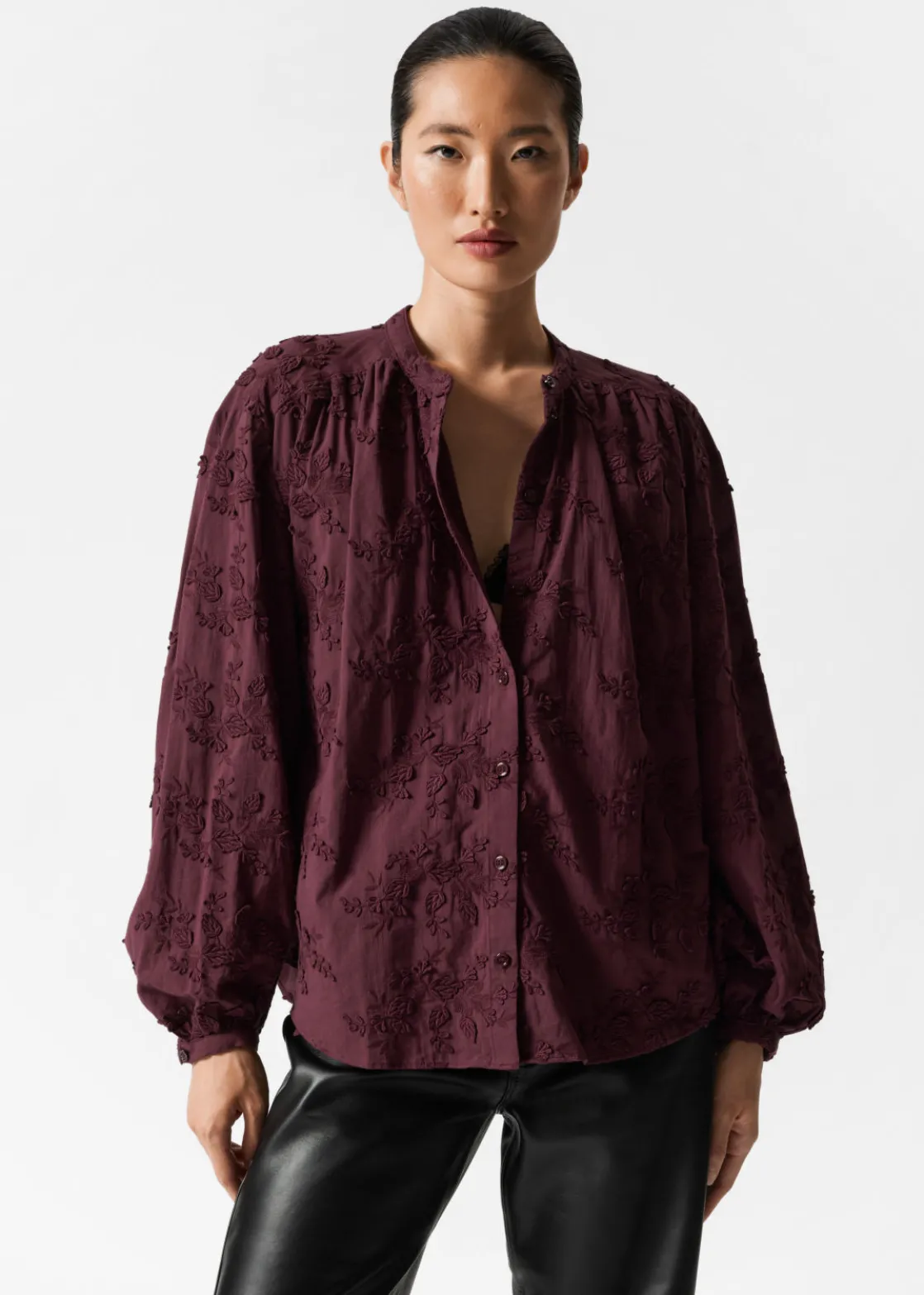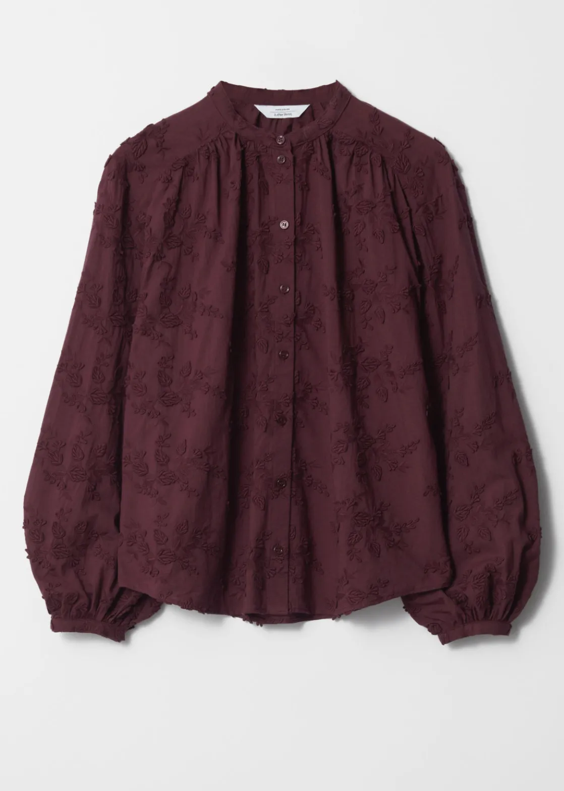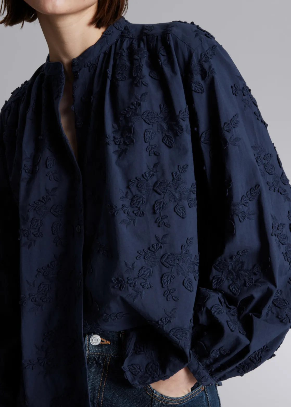 Voluminous blouse featuring a stand-up collar, floral appliqué detailing and long sleeves with gathered cuffs.
