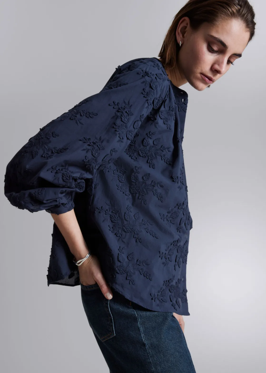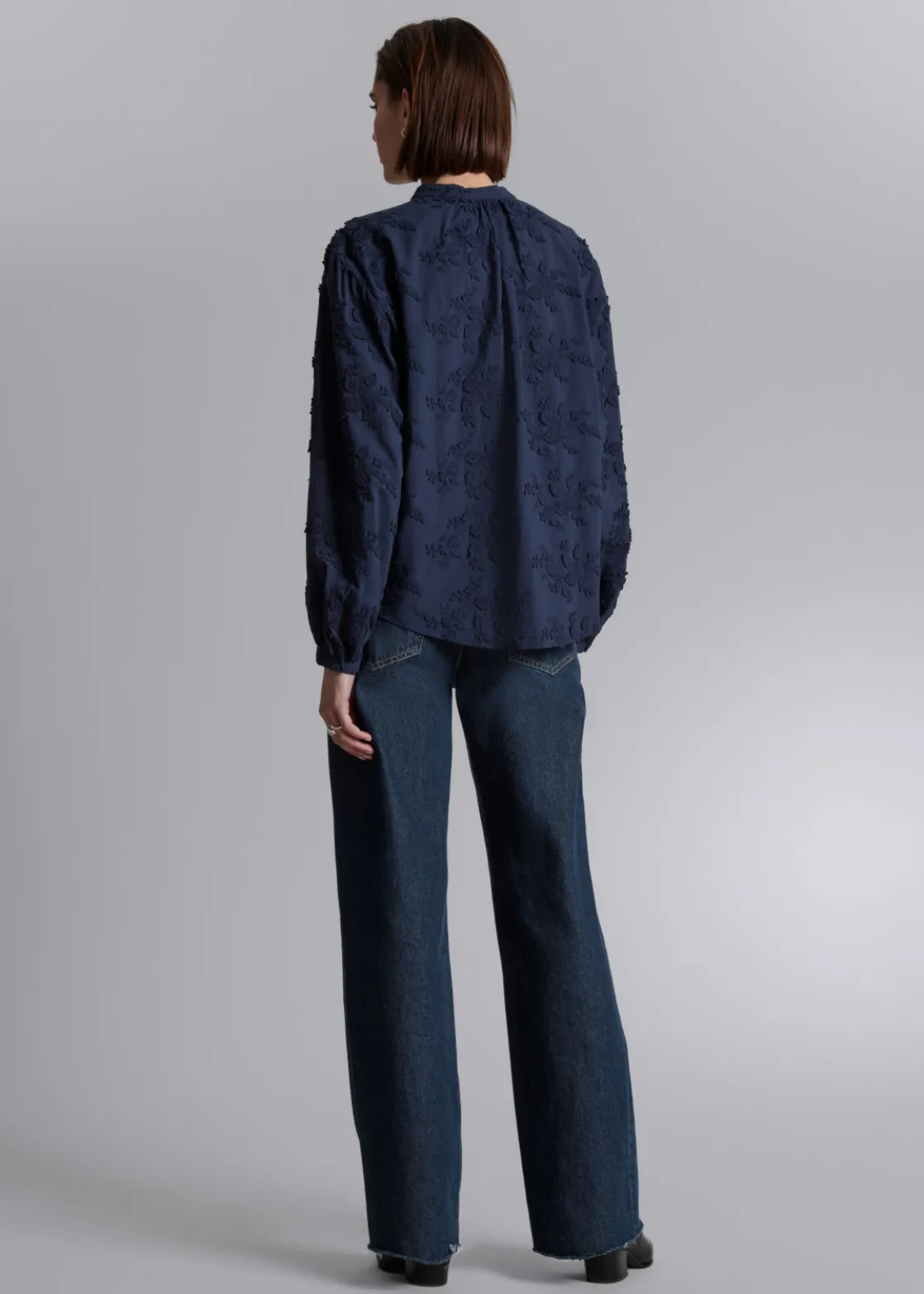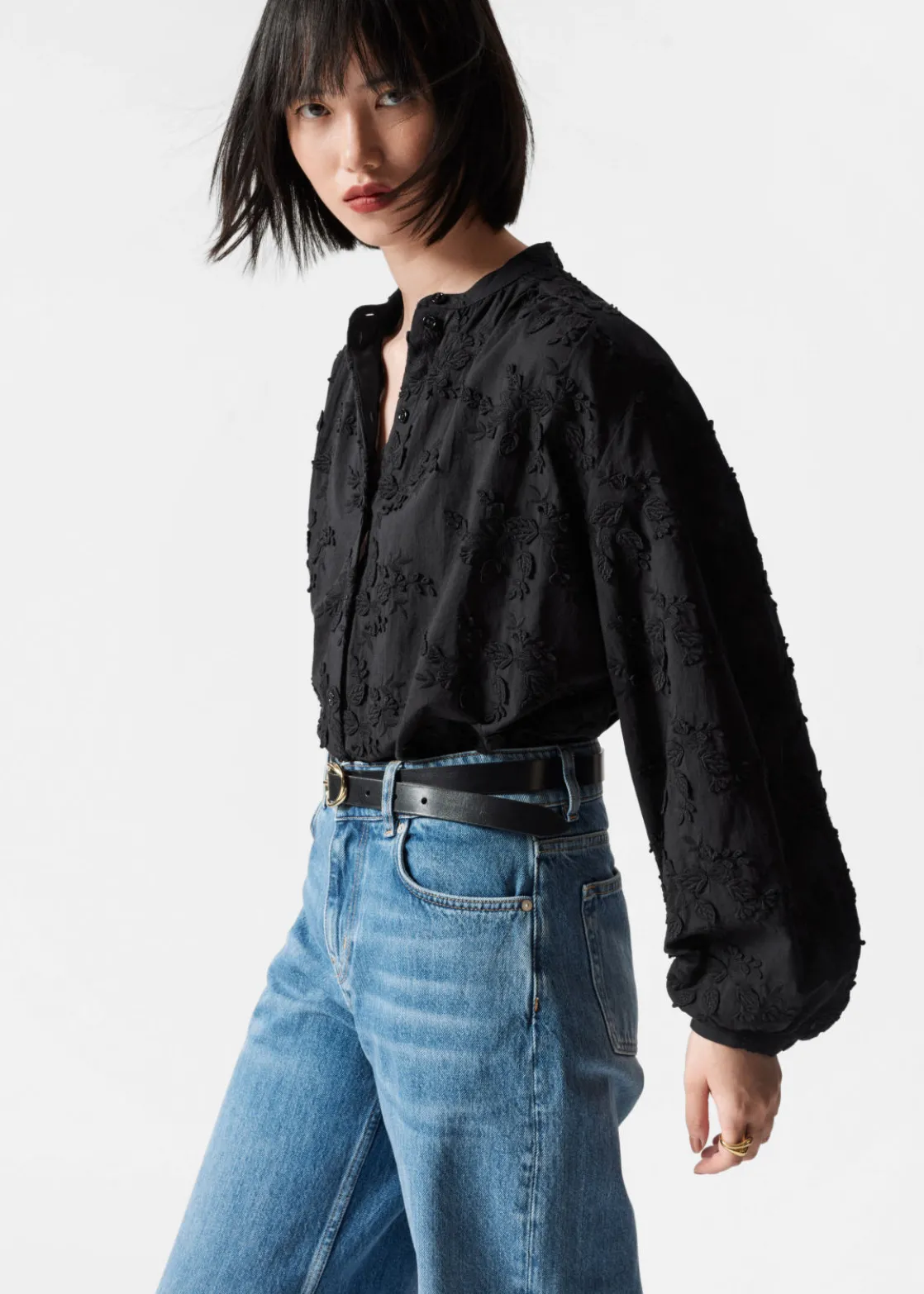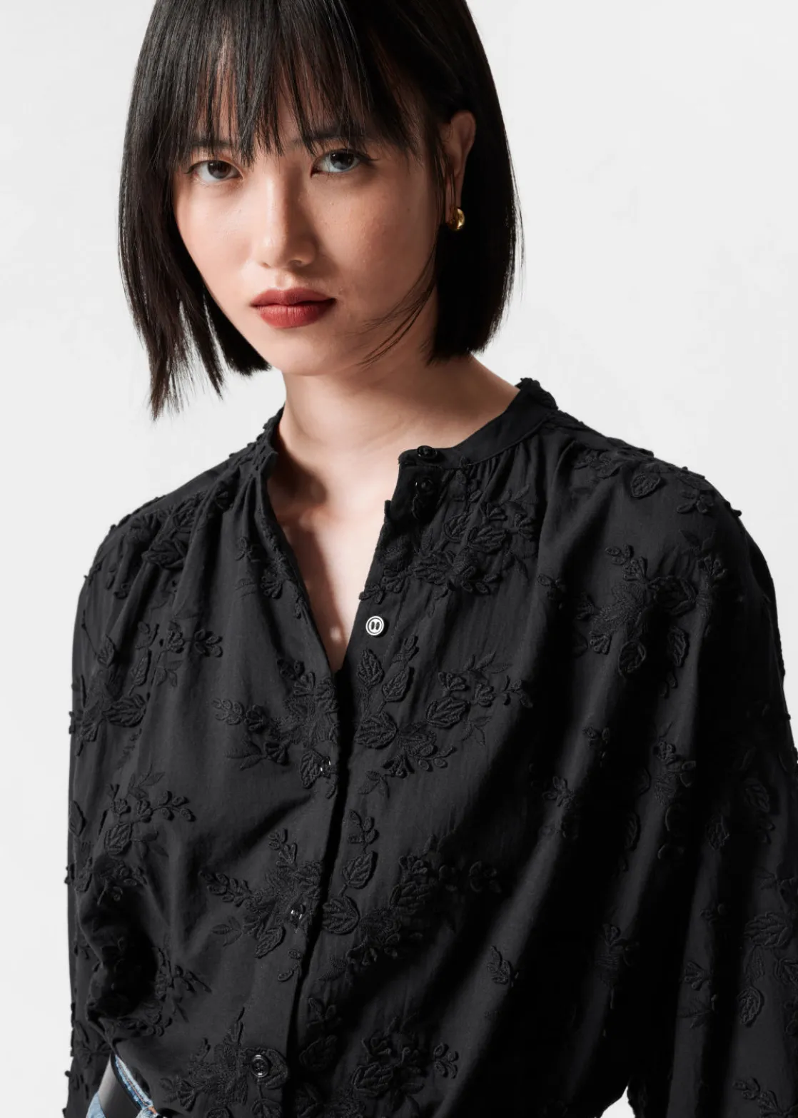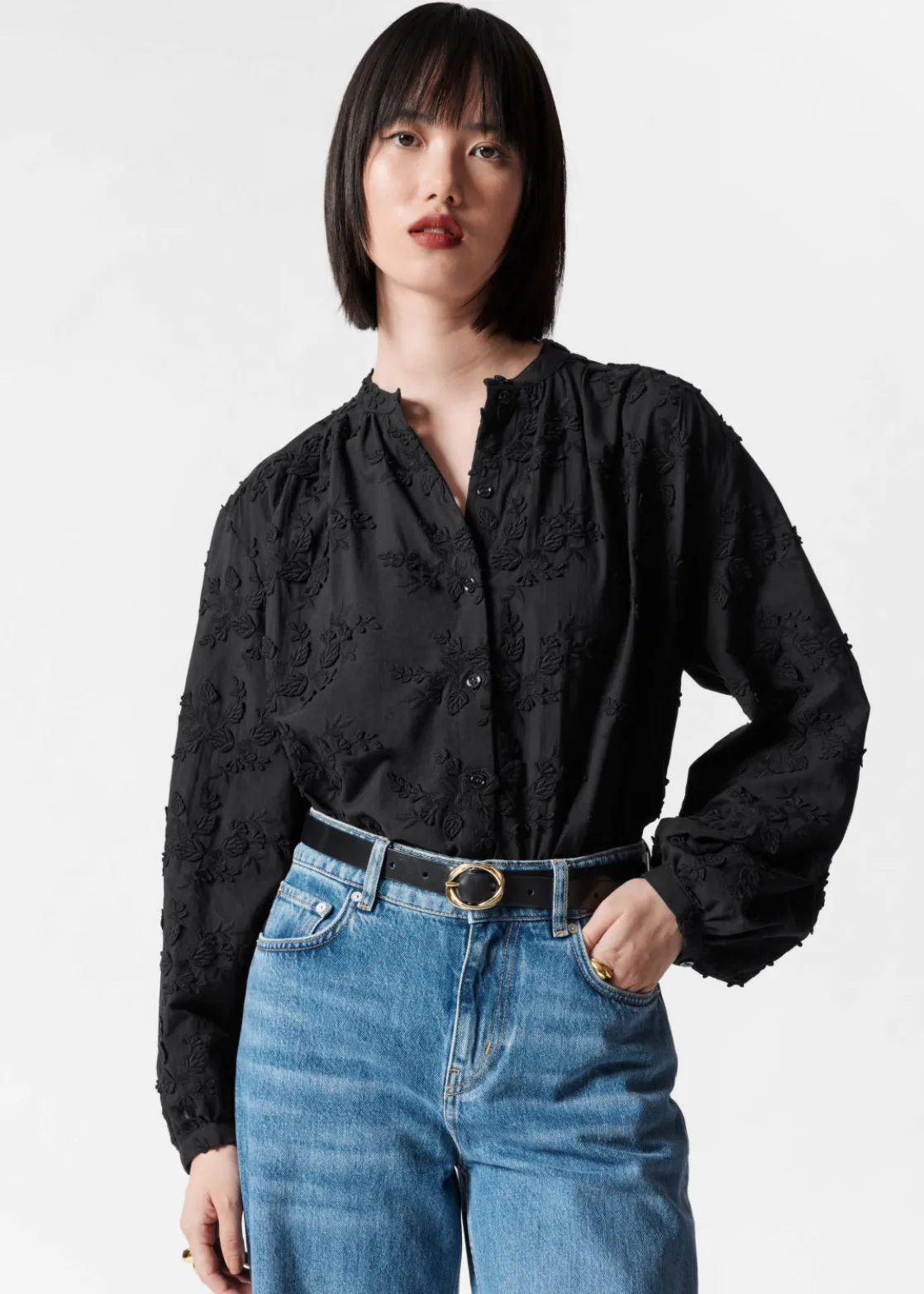 Voluminous blouse featuring a stand-up collar, floral appliqué detailing and long sleeves with gathered cuffs.