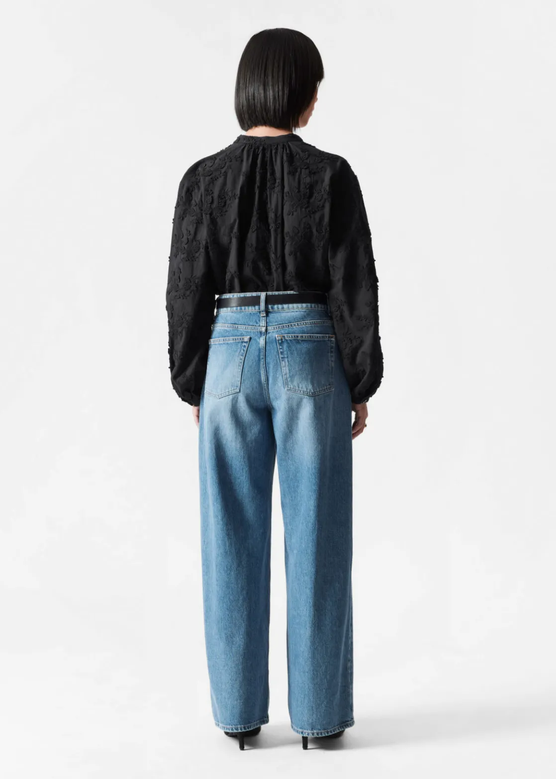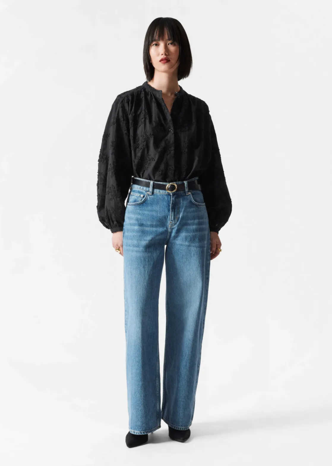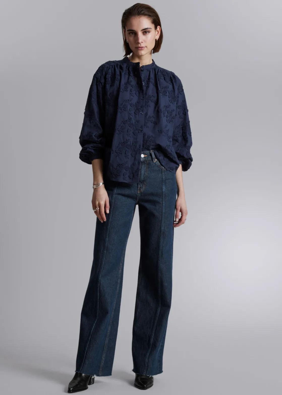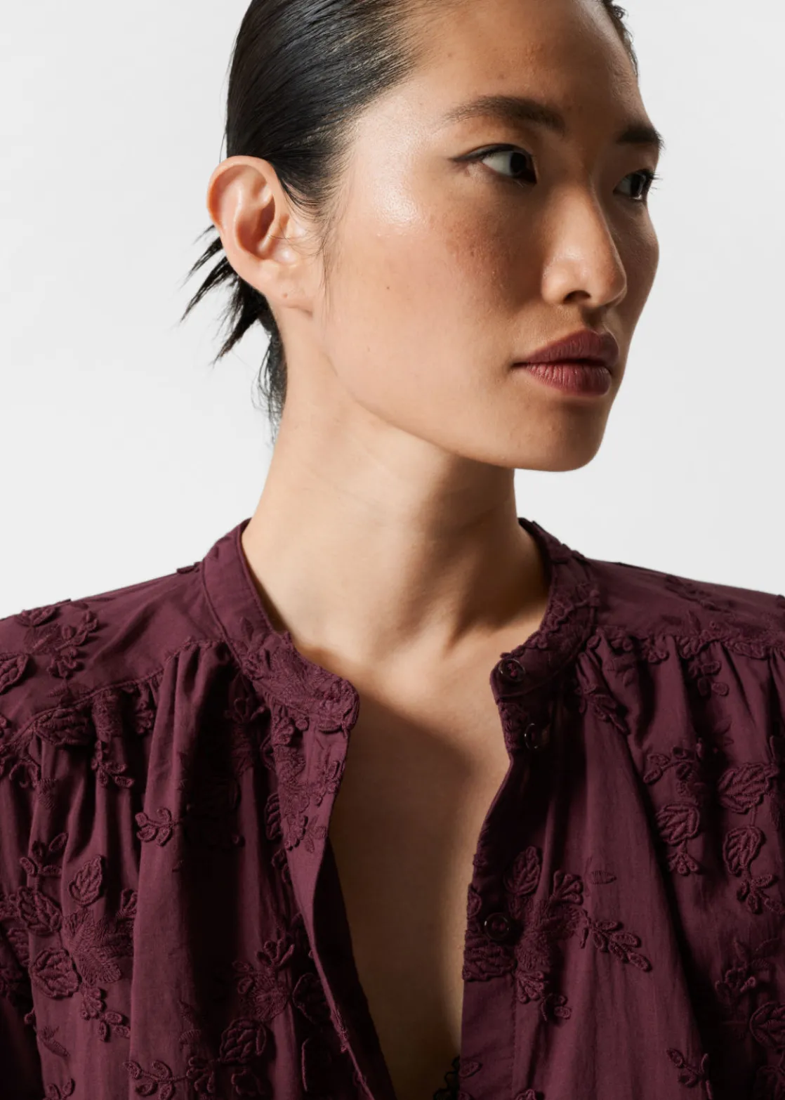 Voluminous blouse featuring a stand-up collar, floral appliqué detailing and long sleeves with gathered cuffs.
