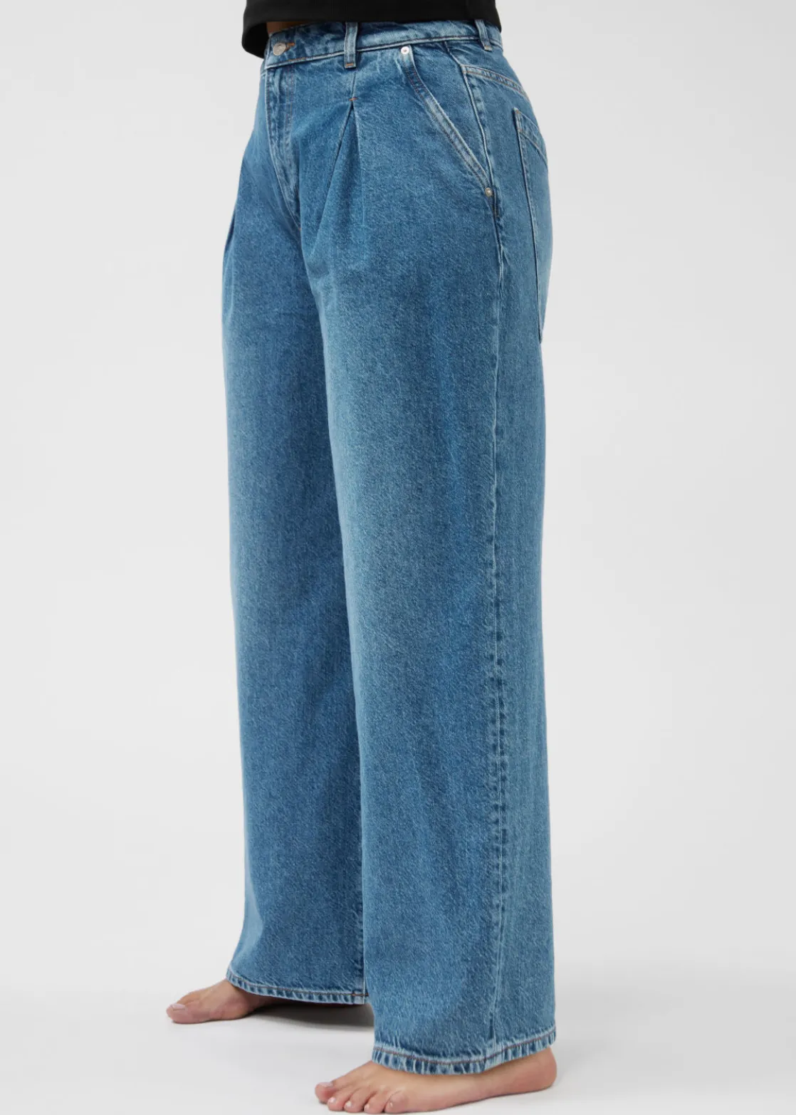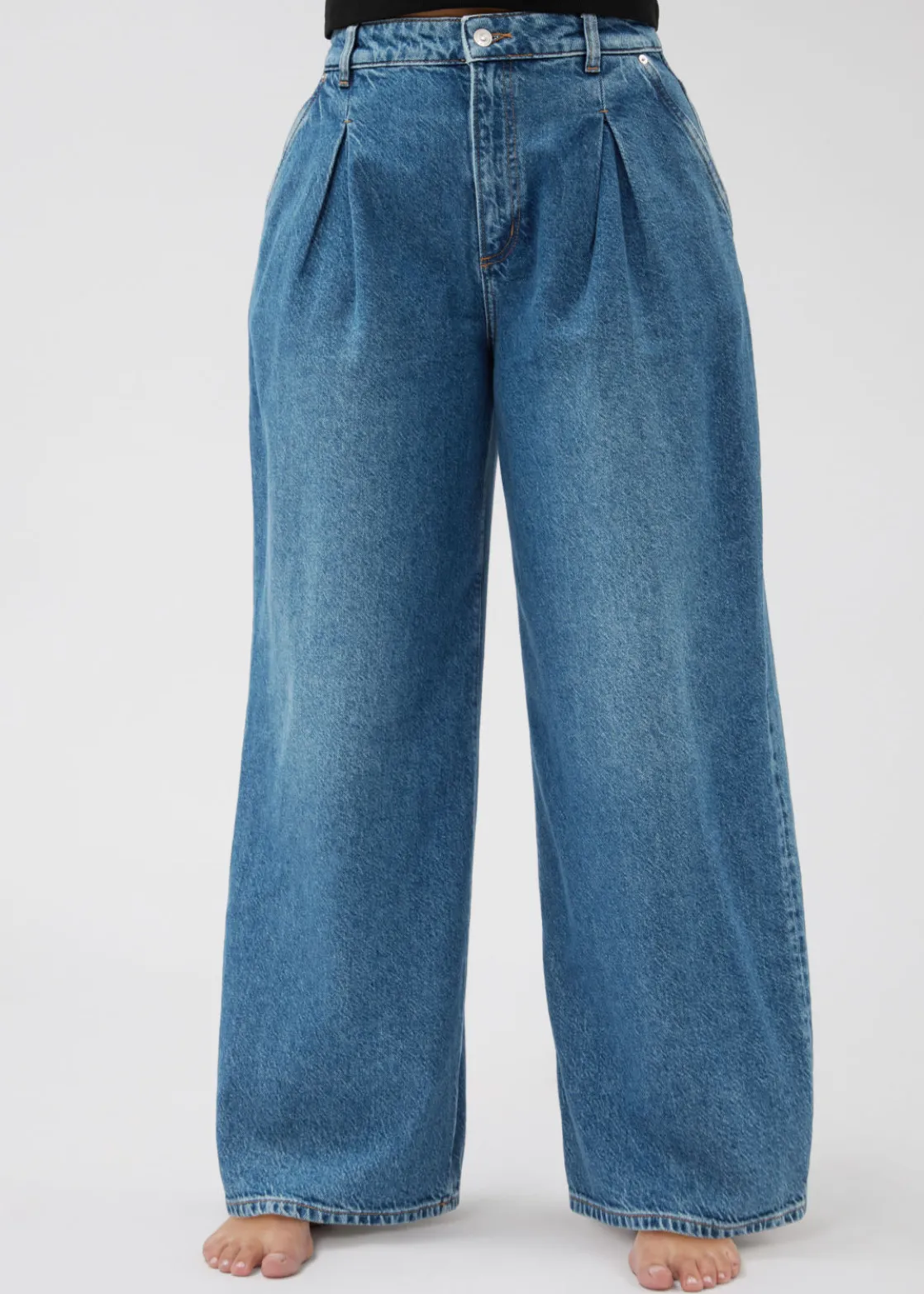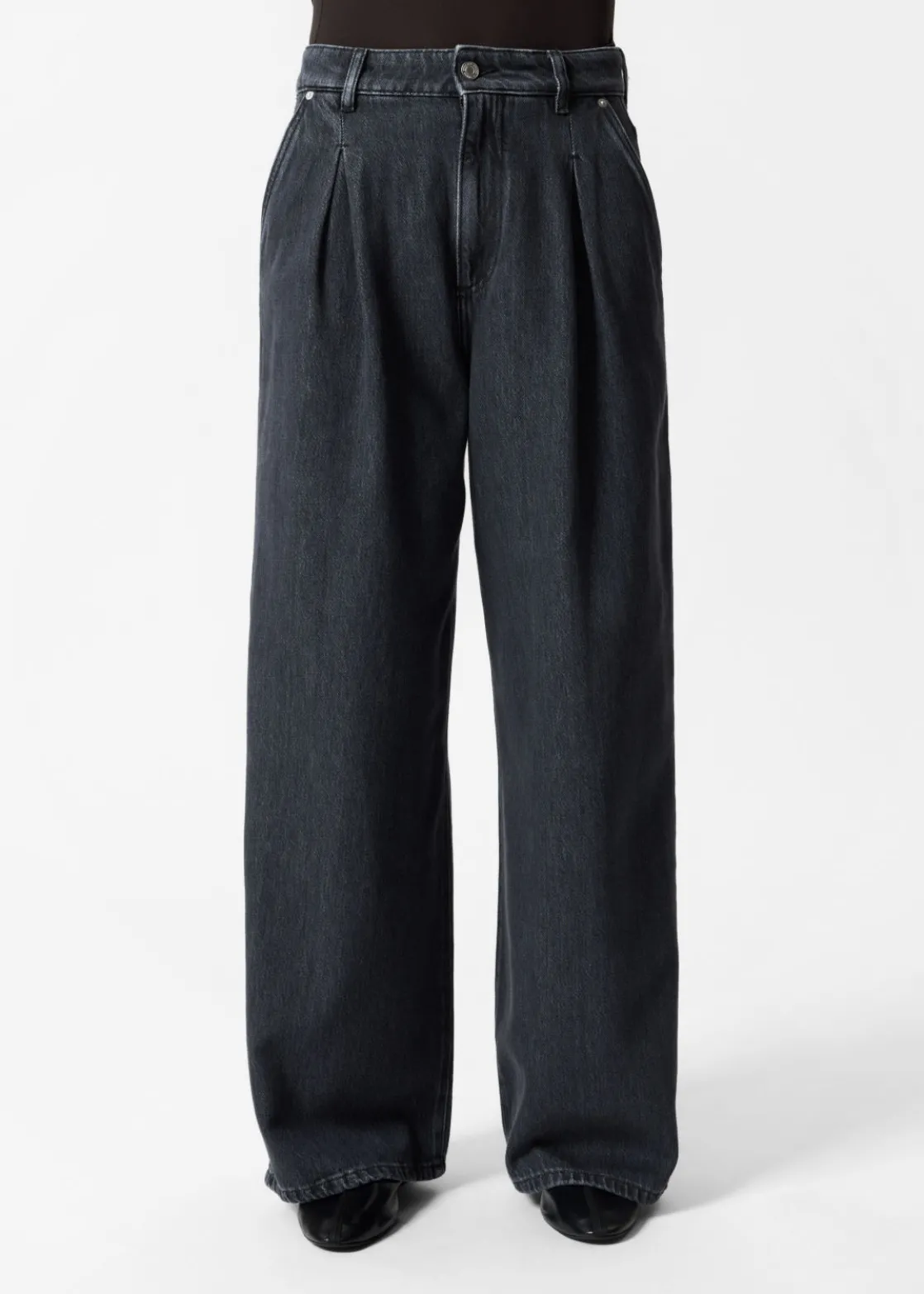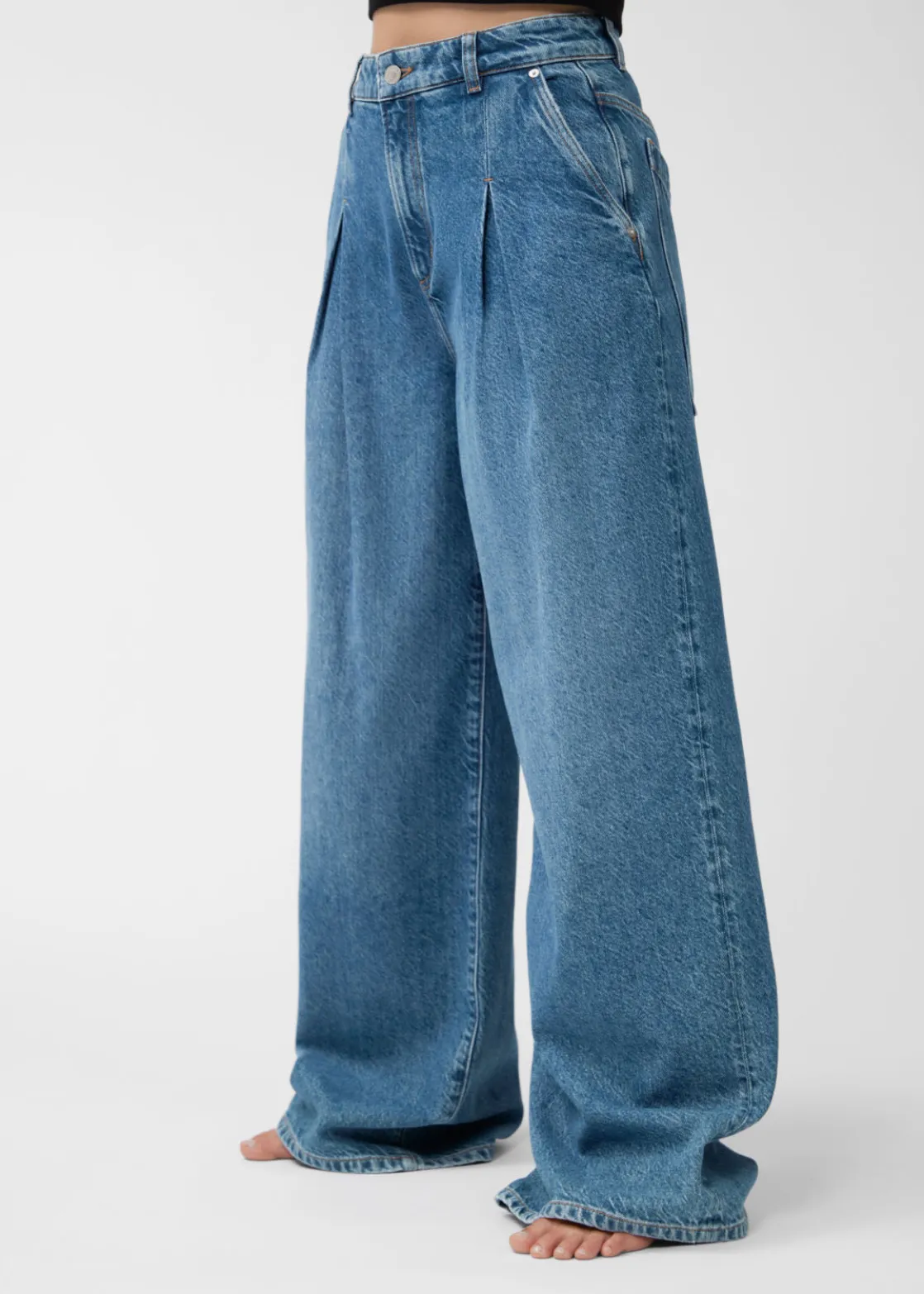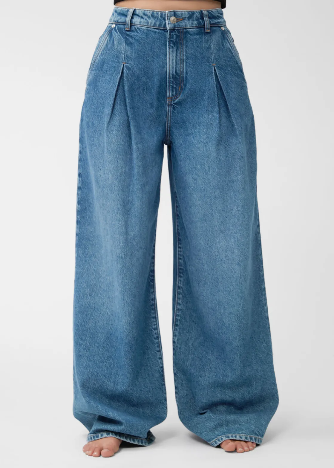 Denim jeans featuring a wide, slouchy silhouette. Detailed with pleats at the front and duo large pockets at the back.
