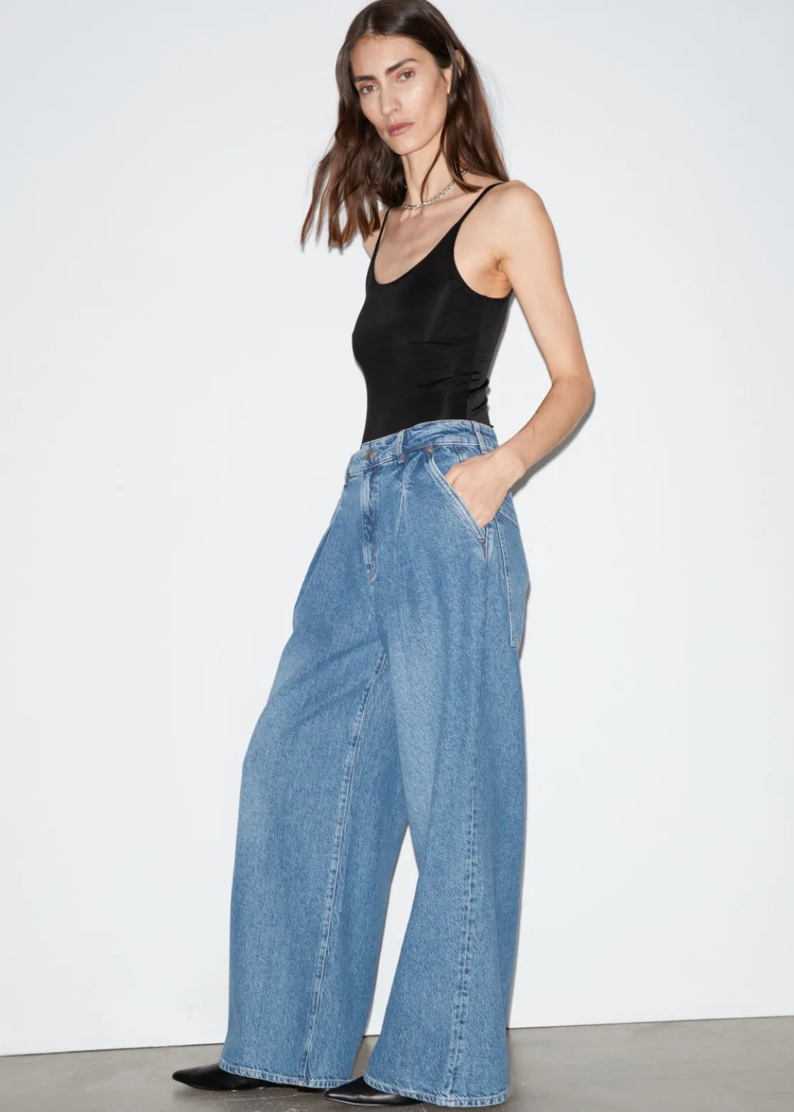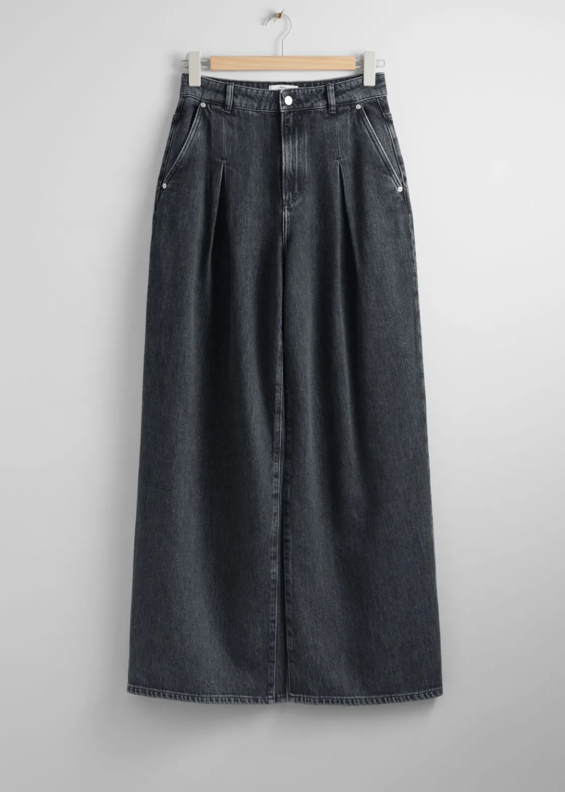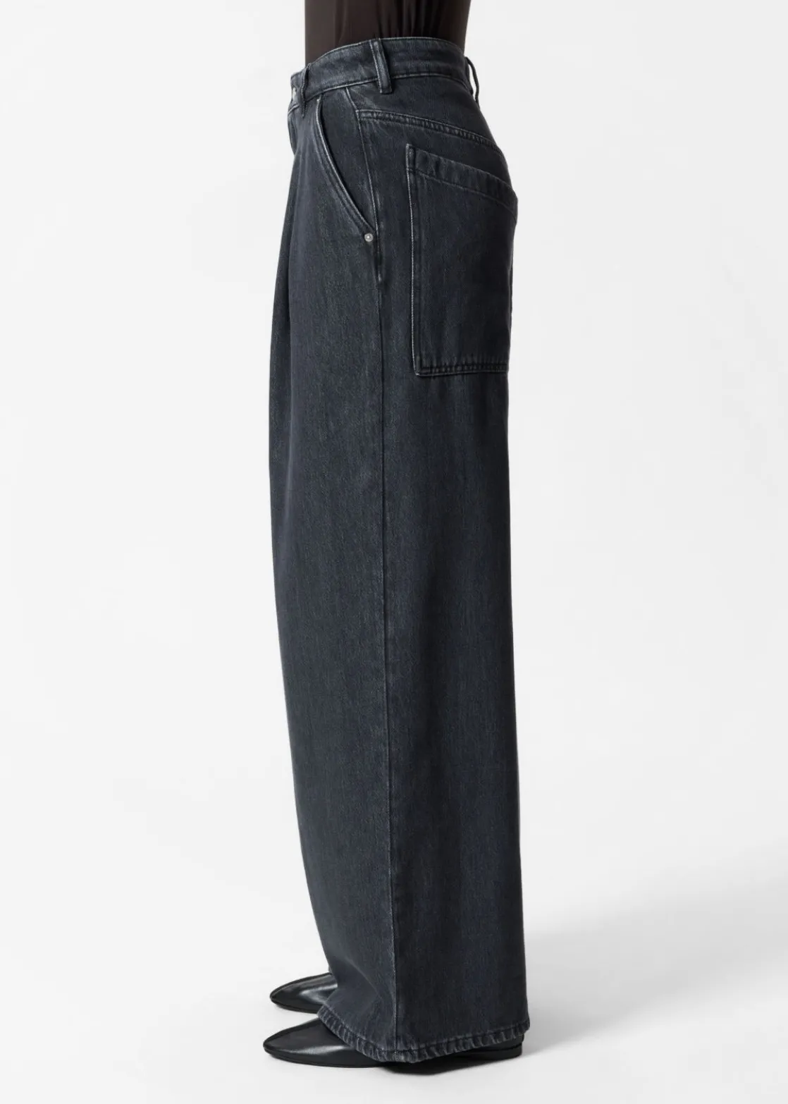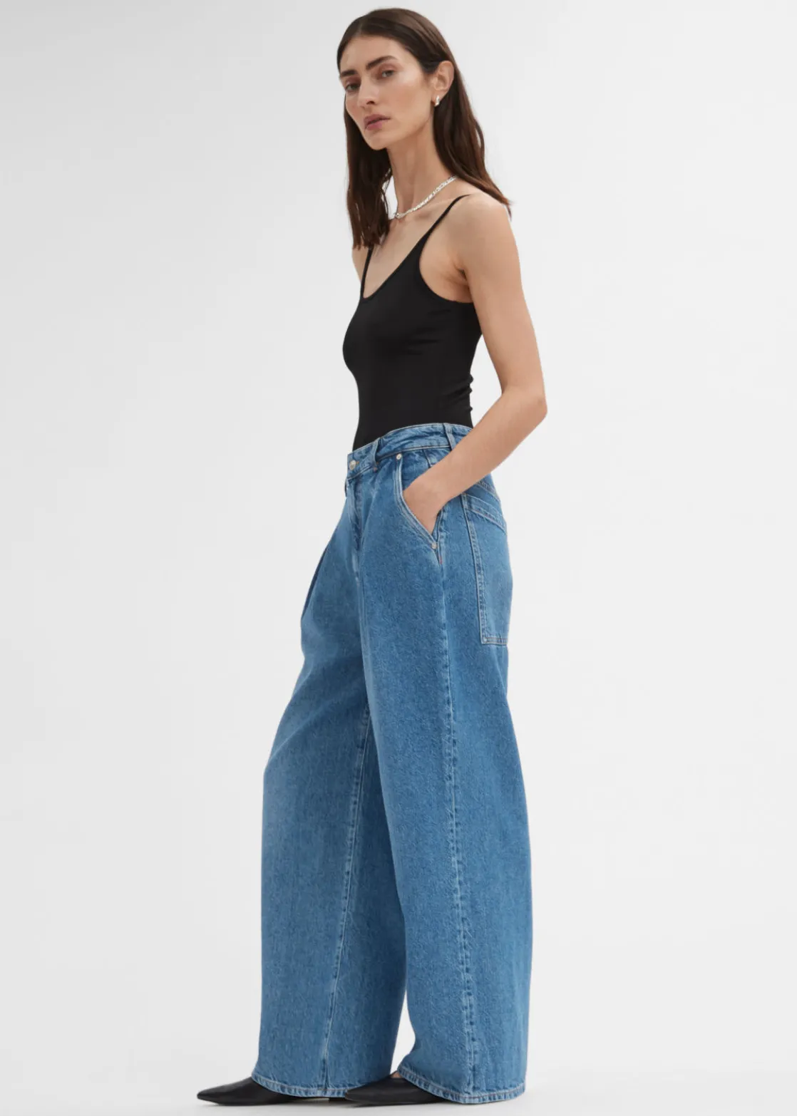 Denim jeans featuring a wide, slouchy silhouette. Detailed with pleats at the front and duo large pockets at the back.