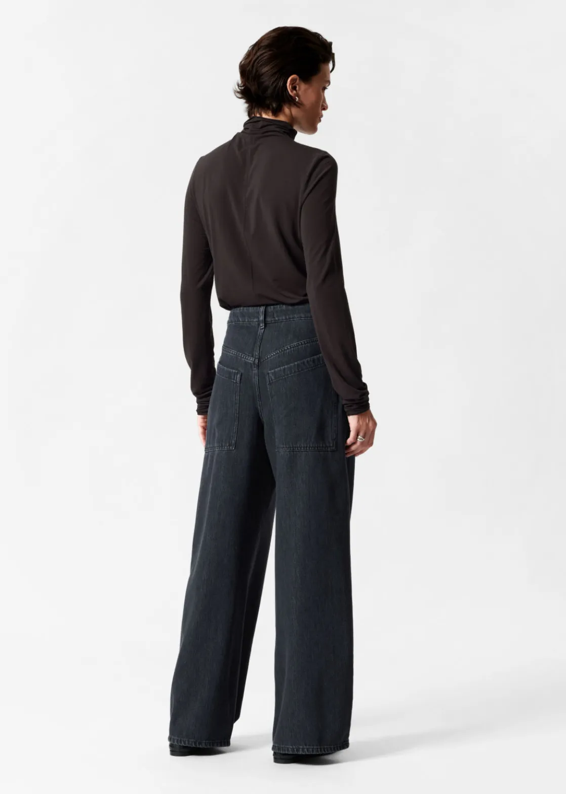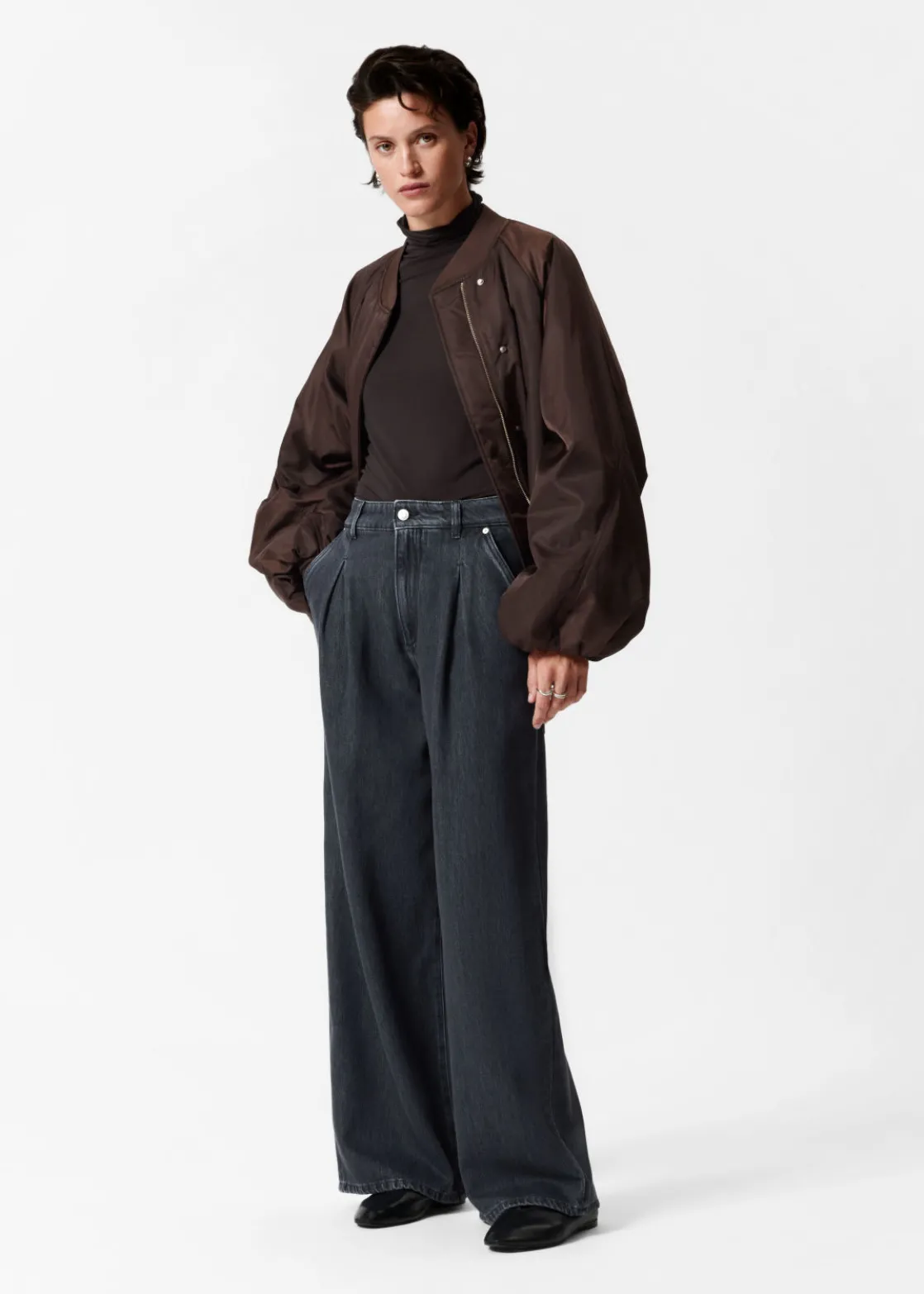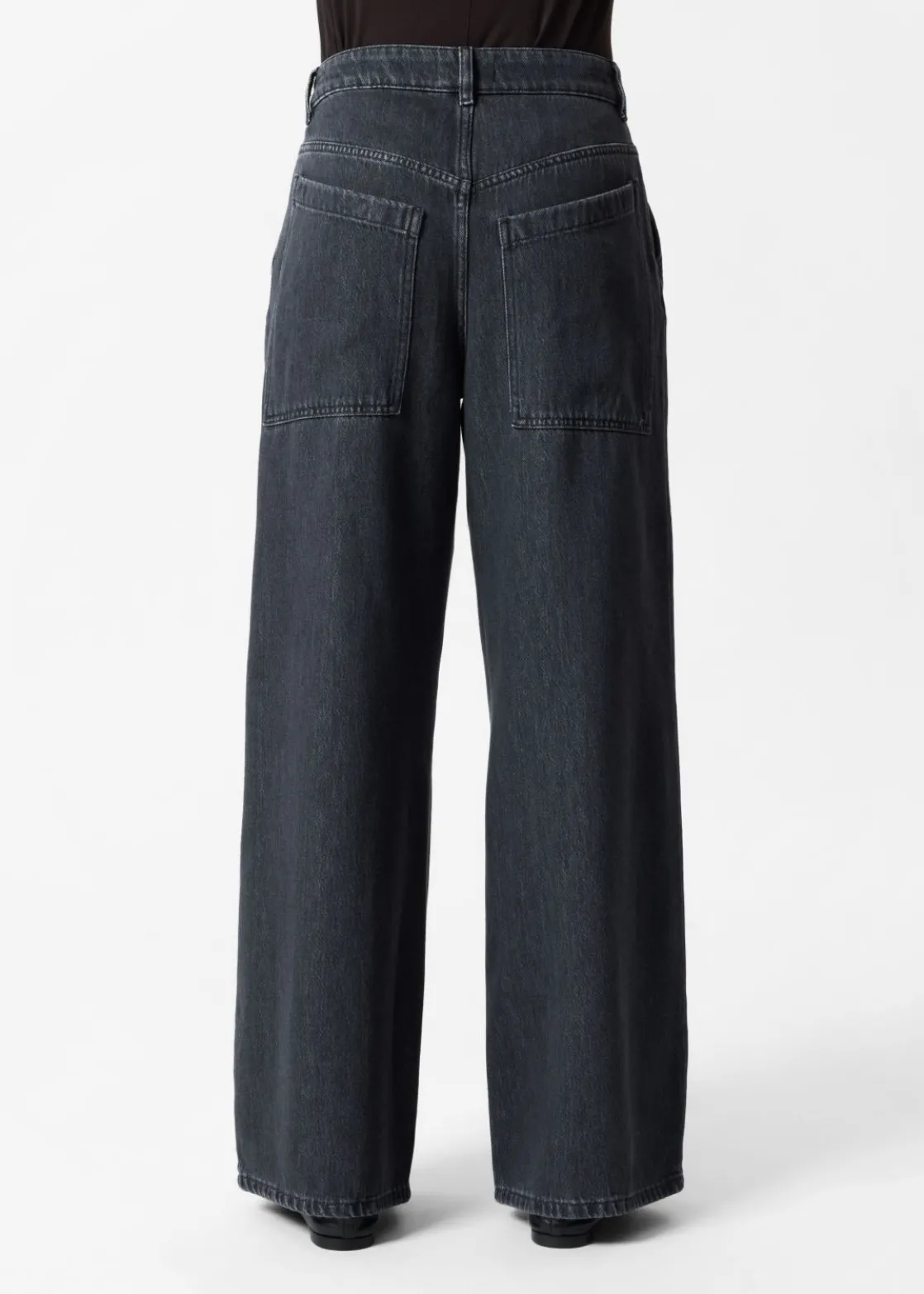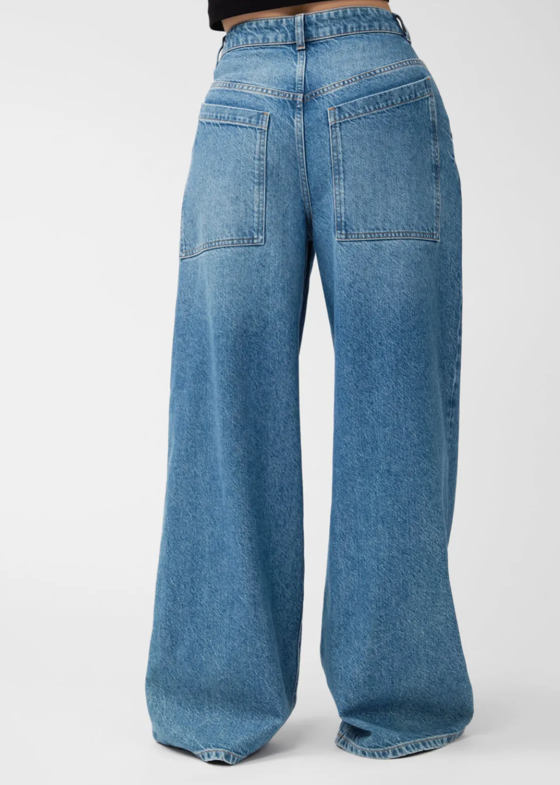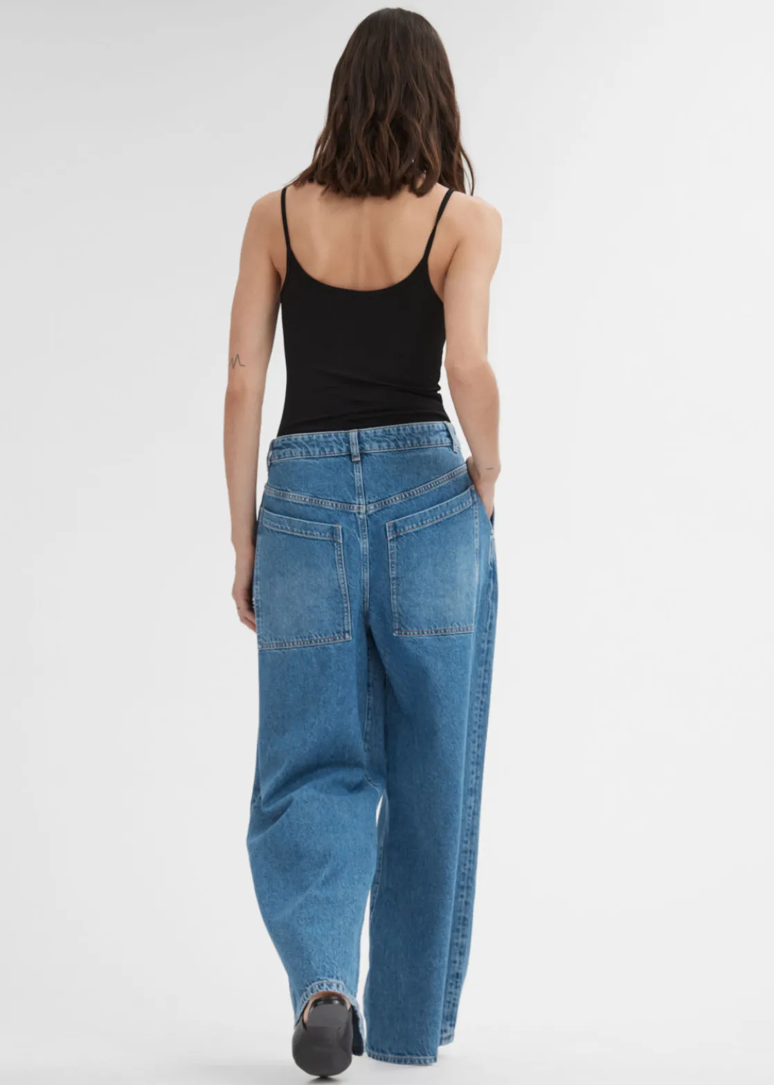 Denim jeans featuring a wide, slouchy silhouette. Detailed with pleats at the front and duo large pockets at the back.