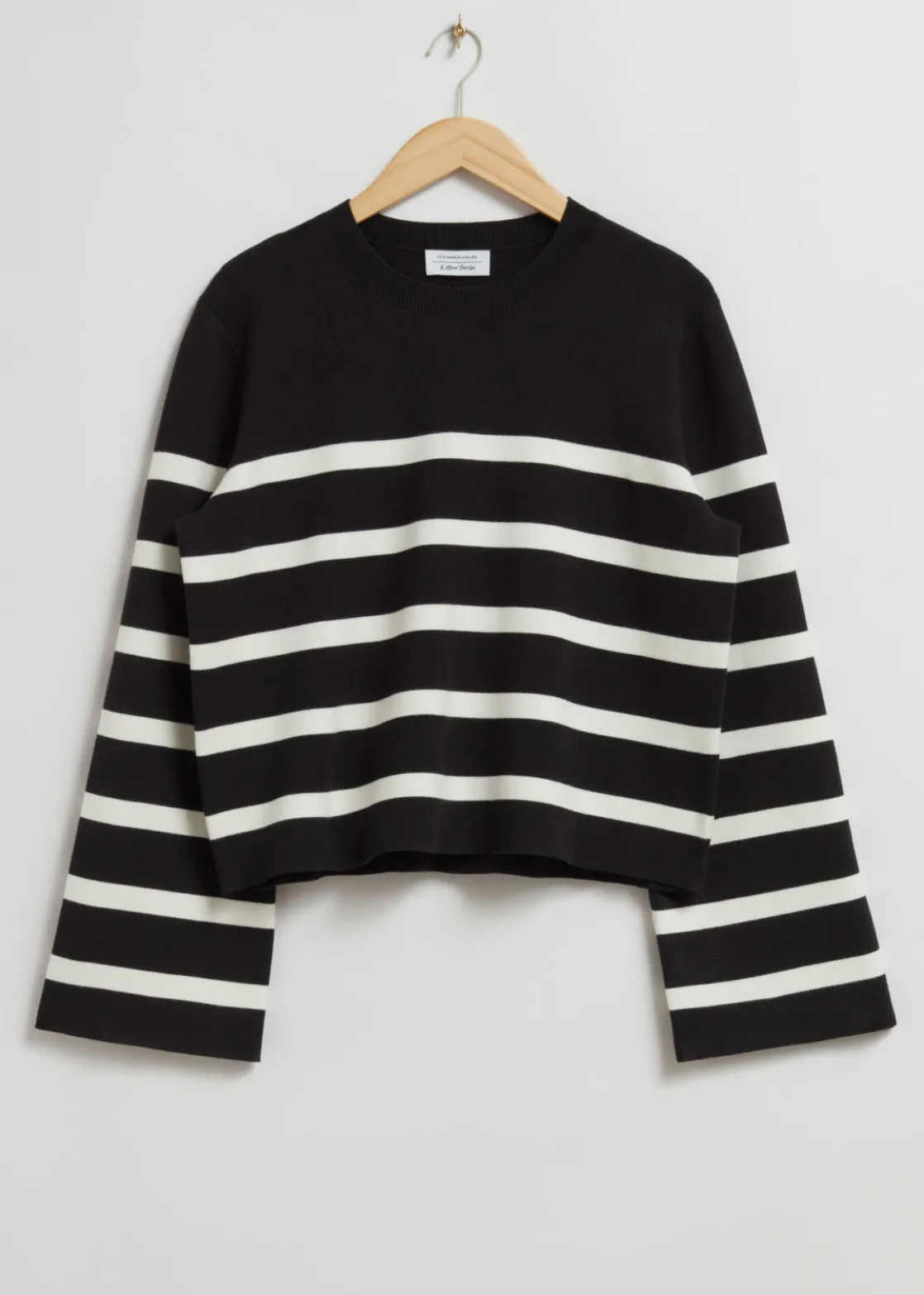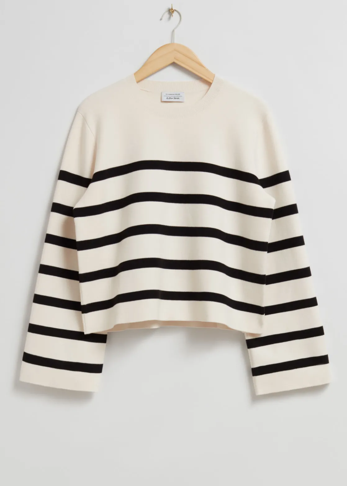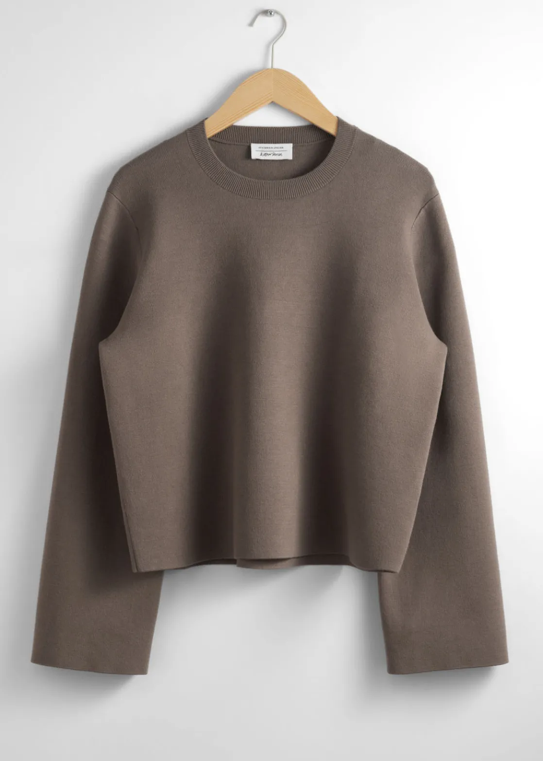 Knitted sweater designed with a round-cut neckline and straight, wide sleeves.