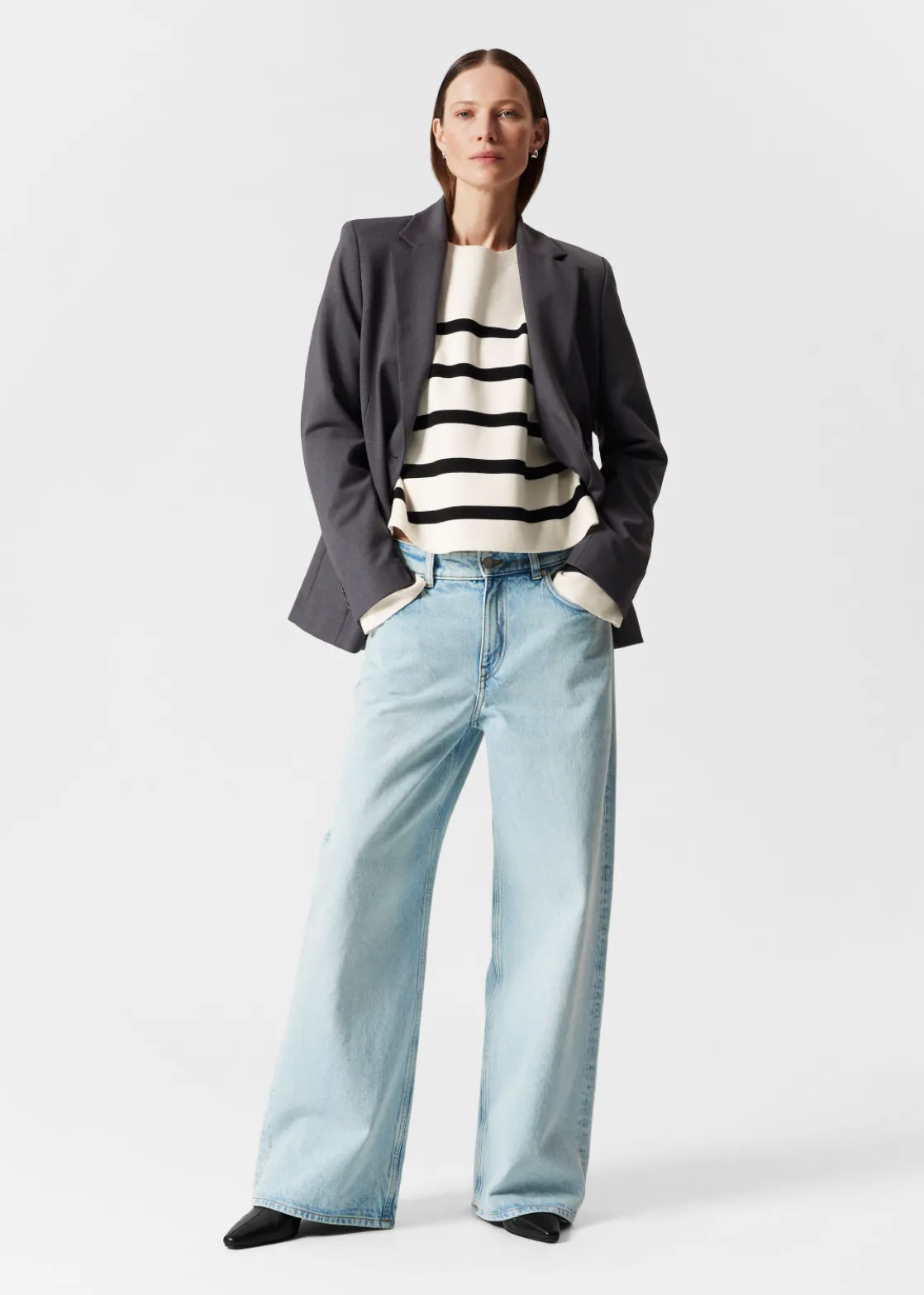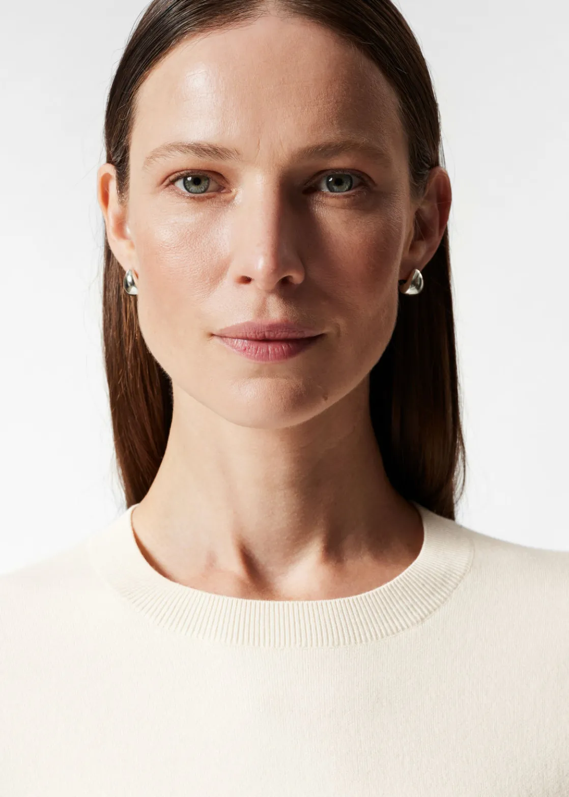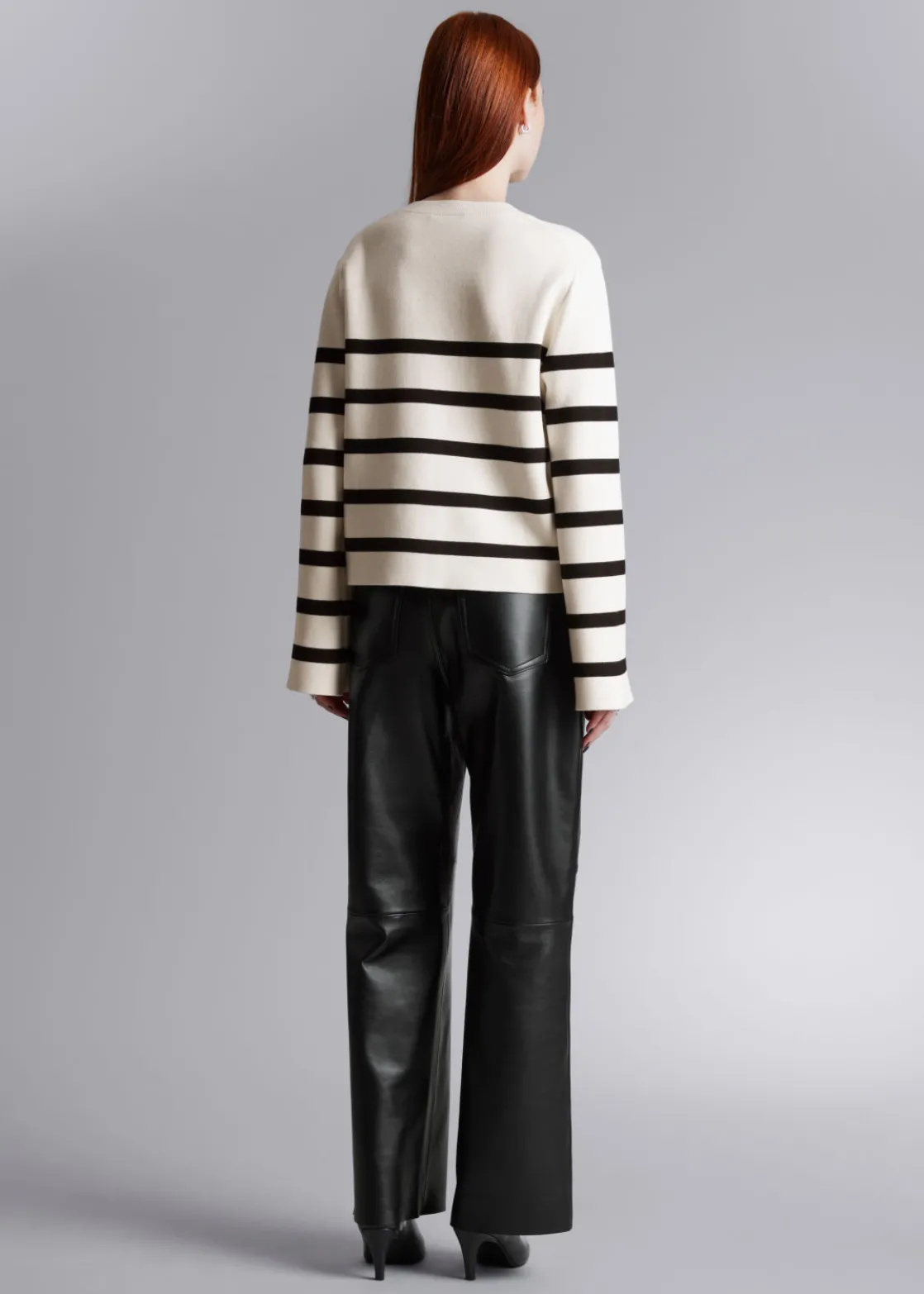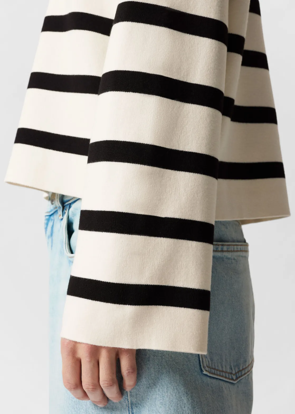 Knitted sweater designed with a round-cut neckline and straight, wide sleeves.
